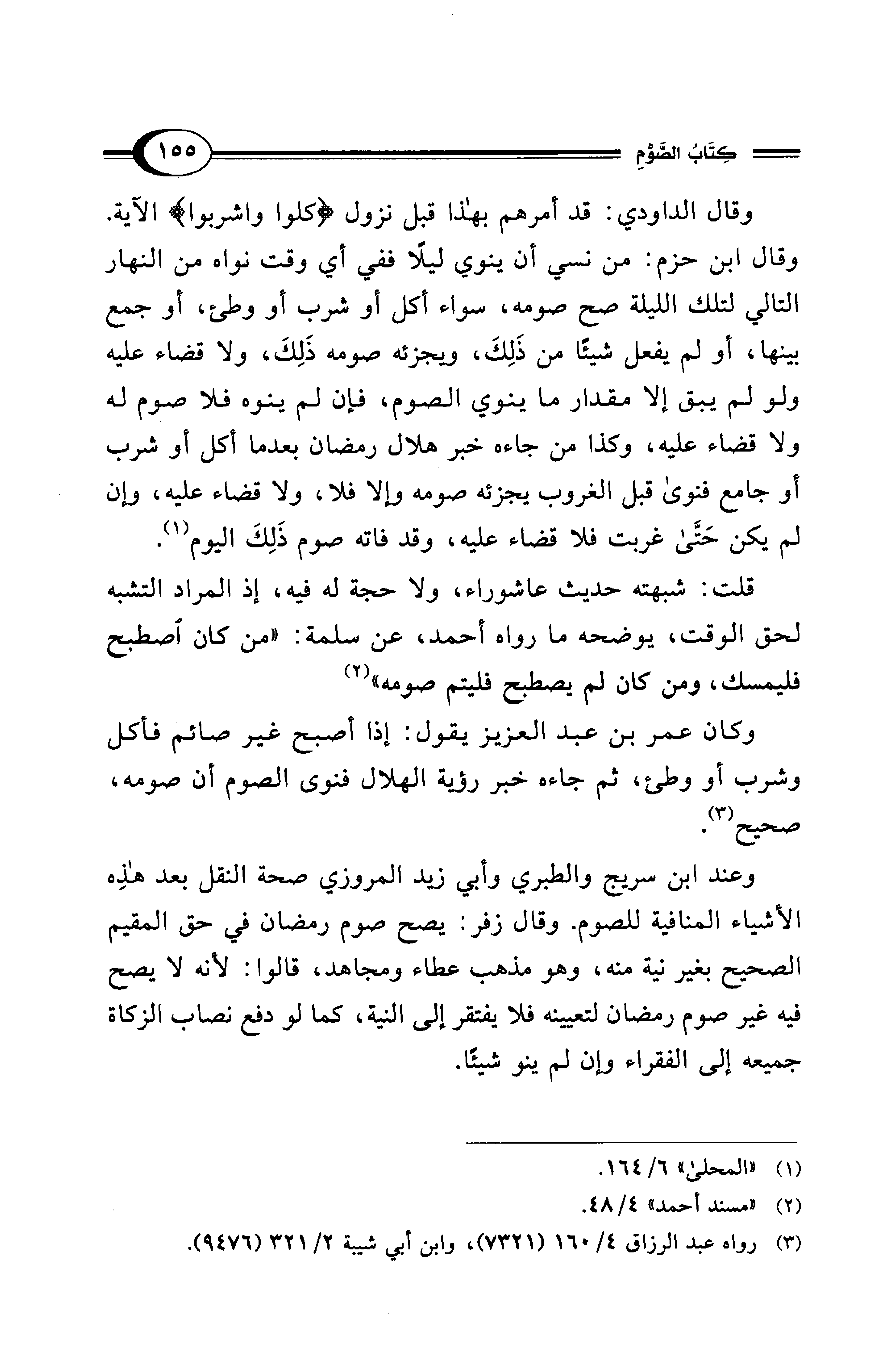 وقال ابن حزم: من نسي أن ينوي ليلًا ففي أي وقت نواه من النهار التالي لتلك الليلة صح صومه، سواء أكل أو شرب أو وطئ، أو جمع بينها، أو لم يفعل شيئًا من ذَلِكَ، ويجزئه صومه ذَلِكَ، ولا قضاء عليه ولو لم يبق إلا مقدار ما ينوي الصوم، فإن لم ينوه فلا صوم له ولا قضاء عليه، وكذا من جاءه خبر هلال رمضان بعدما أكل أو شرب أو جامع فنوى قبل الغروب يجزئه صومه وإلا فلا، ولا قضاء عليه، وإن لم يكن حَتَّى غربت فلا قضاء عليه، وقد فاته صوم ذَلِكَ اليوم (¬1).