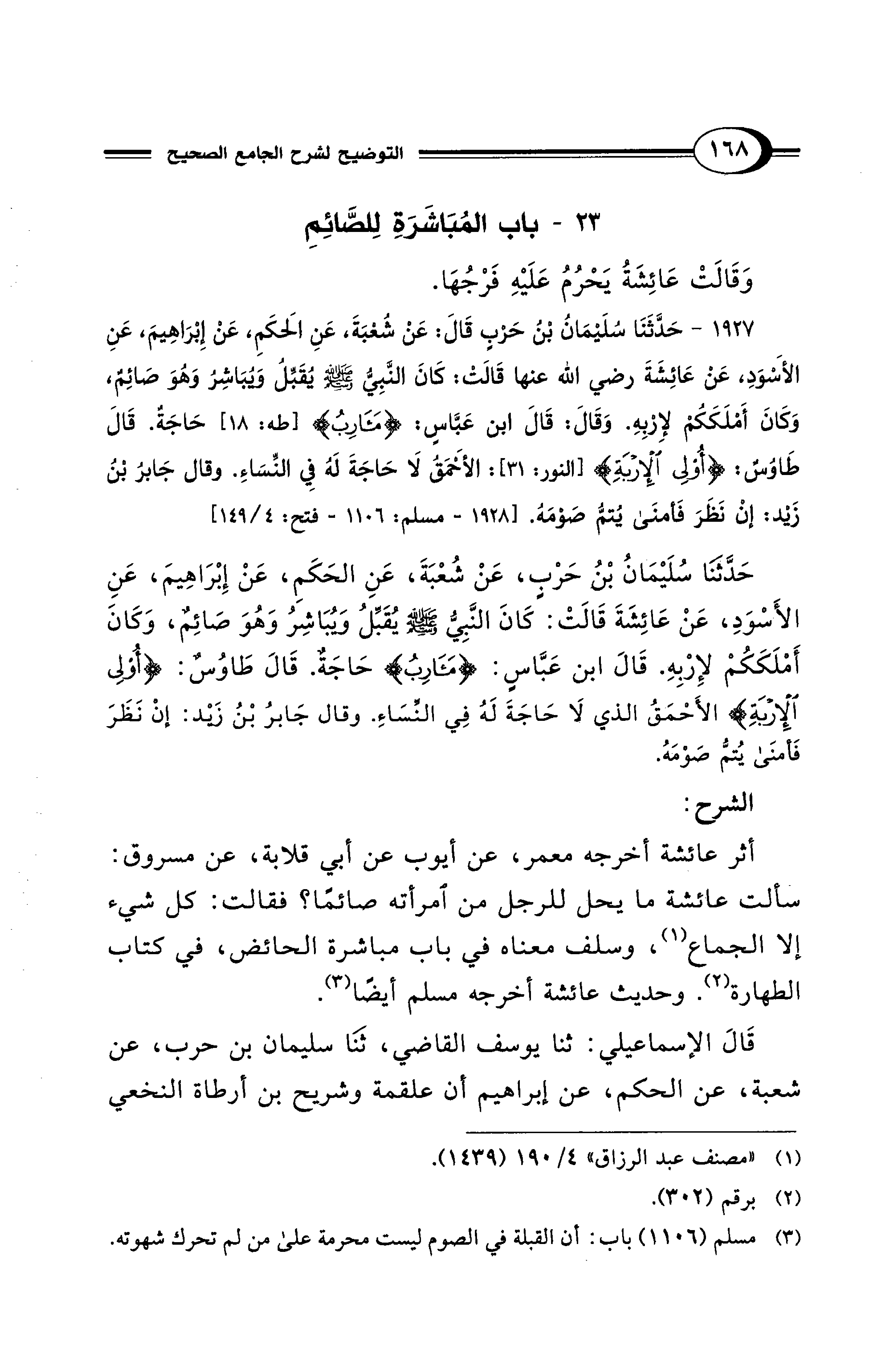 حَدَّثَنَا سُلَيْمَانُ بْنُ حَرْبٍ، قَالَ: عَنْ شُعْبَةَ، عَنِ الحَكَمِ، عَنْ إِبْرَاهِيمَ، عَنِ الأَسْوَدِ، عَنْ عَائِشَةَ قَالَتْ: كَانَ النَّبِيُّ - صلى الله عليه وسلم - يُقَبِّلُ وَيُبَاشِرُ، وَهُوَ صَائِمٌ، وَكَانَ أَمْلَكَكُمْ لإِرْبِهِ. وَقَالَ: قَالَ ابْنُ عَبَّاسٍ: {مَآرِبُ} حَاجَةٌ. قَالَ طَاوُسٌ: {أُولِى الإِرْبَةِ} الأَحْمَقُ الذي لَا حَاجَةَ لَهُ فِي النِّسَاءِ. وقال جَابرُ بْنُ زيد: إنْ نَظَرَ فَأمنَى يُتمُّ صَوْمَهُ.