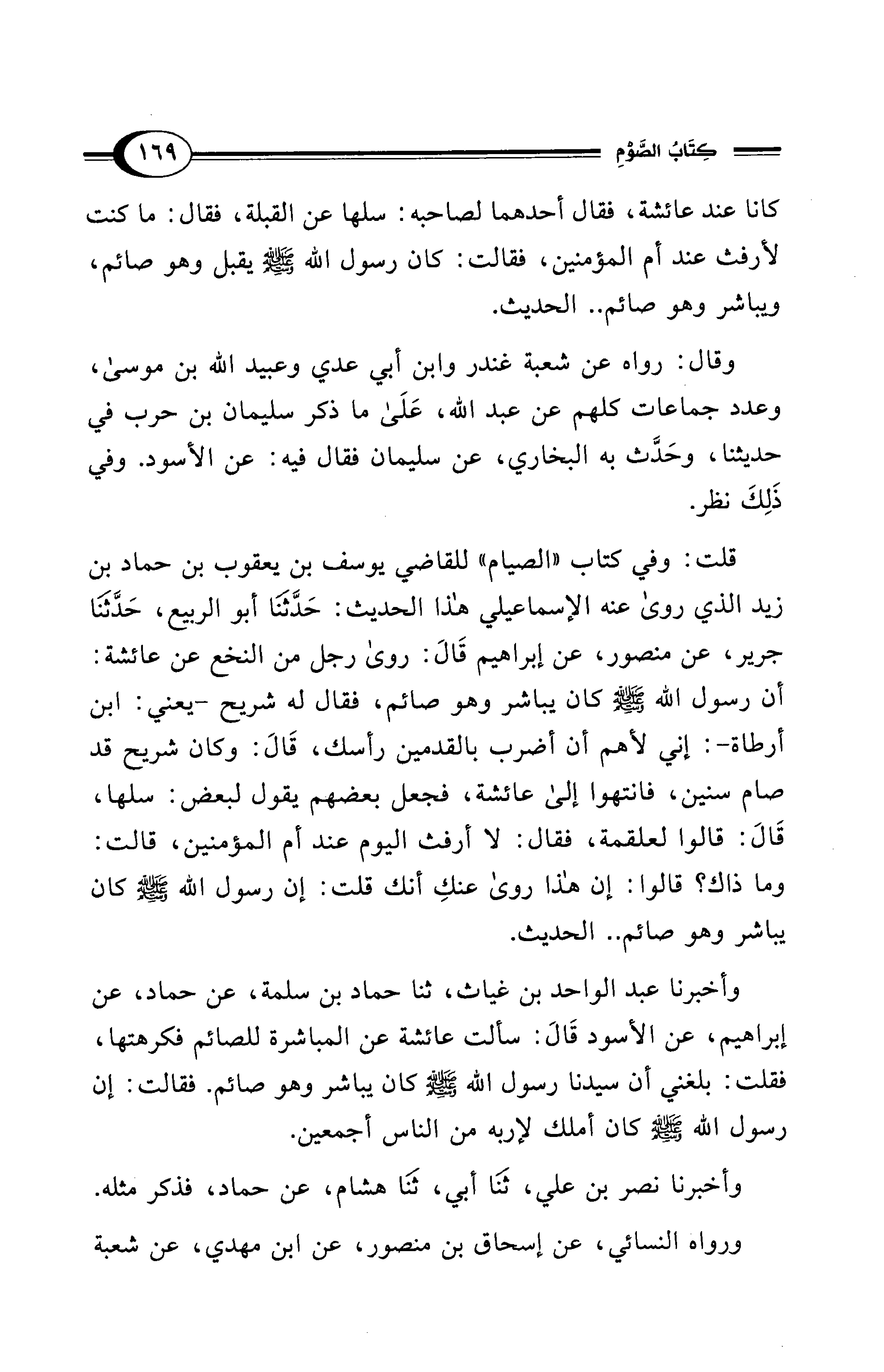 وأخبرنا عبد الواحد بن غياث، ثنا حماد بن سلمة، عن حماد، عن إبراهيم، عن الأسود قَالَ: سألت عائشة عن المباشرة للصائم فكرهتها، فقلت: بلغني أن سيدنا رسول الله - صلى الله عليه وسلم - كان يباشر وهو صائم. فقالت: إن رسول الله - صلى الله عليه وسلم - كان أملك لإربه من الناس أجمعين.