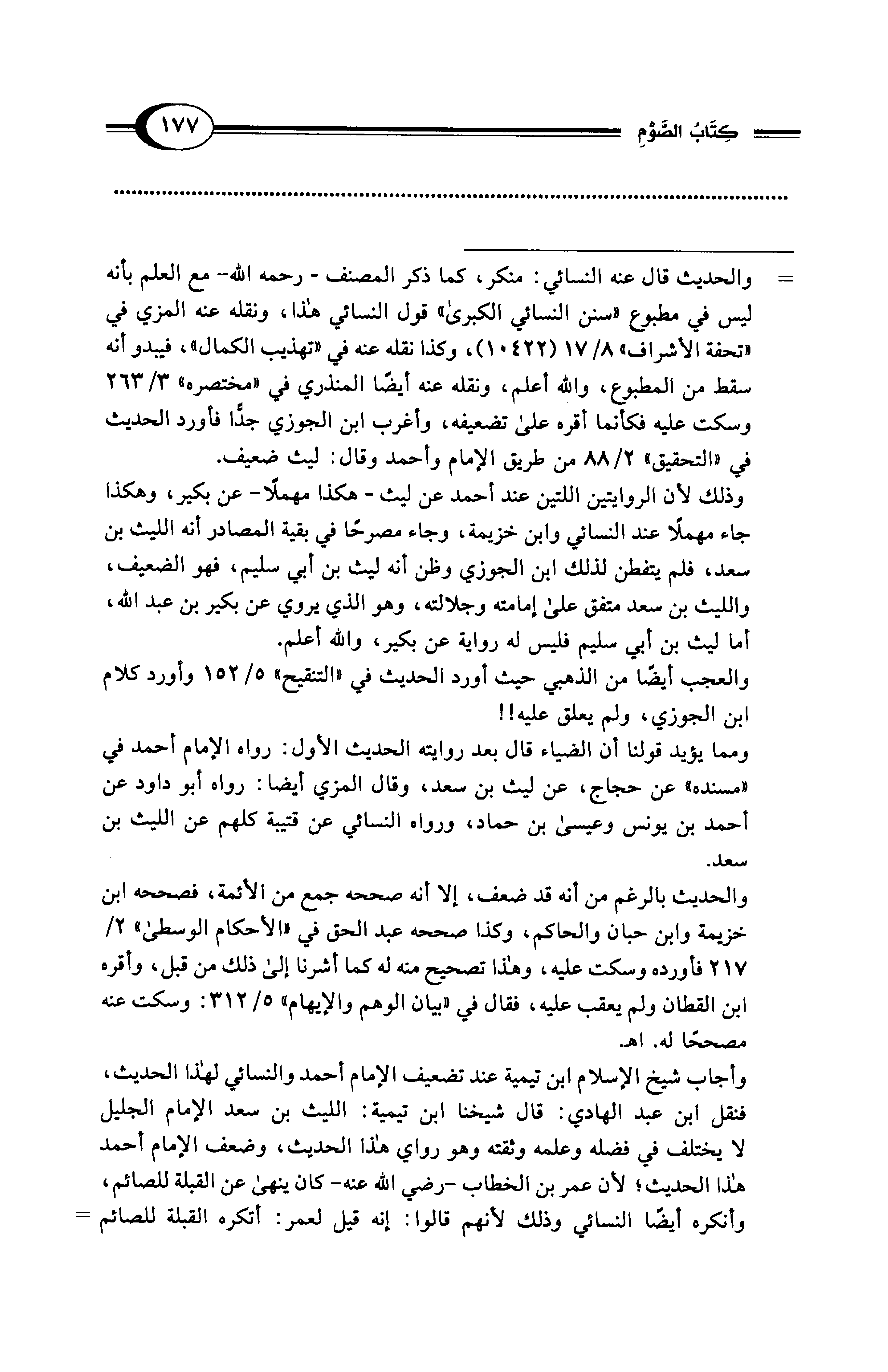 وأجاب شيخ الإسلام ابن تيمية عند تضعيف الإمام أحمد والنسائي لهذا الحديث، فنقل ابن عبد اللهادي: قال شيخنا ابن تيمية: الليث بن سعد الإمام الجليل لا يختلف في فضله وعلمه وثقته وهو رواي هذا الحديث، وضعف الإمام أحمد هذا الحديث؛ لأن عمر بن الخطاب - رضي الله عنه - كان ينهى عن القبلة للصائم، وأنكره أيضًا النسائي وذلك لأنهم قالوا: إنه قيل لعمر: أتكره القبلة للصائم =