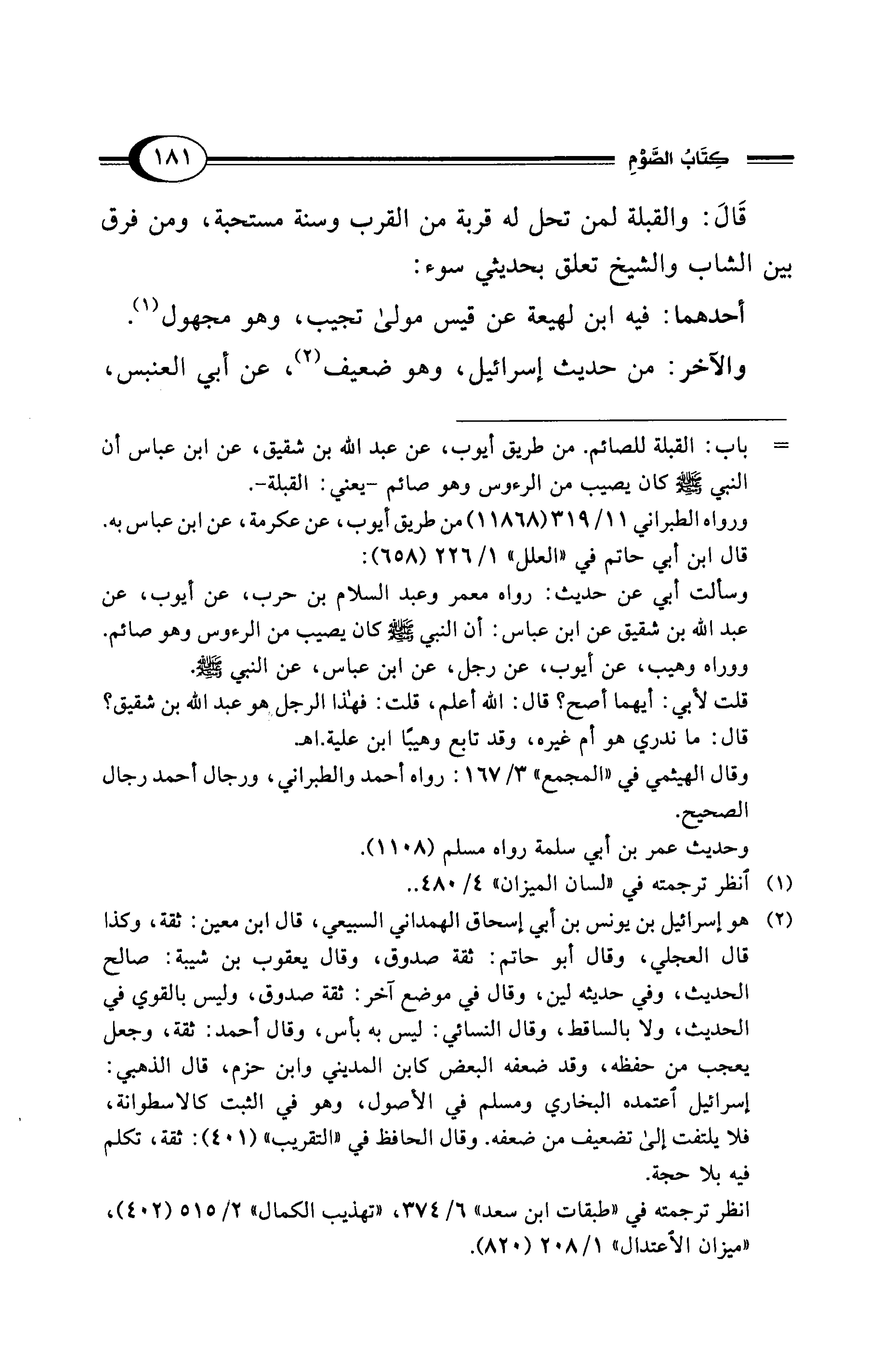 (¬2) هو إسرائيل بن يونس بن أبي إسحاق الهمداني السبيعي، قال ابن معين: ثقة، وكذا قال العجلي، وقال أبو حاتم: ثقة صدوق، وقال يعقوب بن شيبة: صالح الحديث، وفي حديثه لين، وقال في موضع آخر: ثقة صدوق، وليس بالقوي في الحديث، ولا بالساقط، وقال النسائي: ليس به بأس، وقال أحمد: ثقة، وجعل يعجب من حفظه، وقد ضعفه البعض كابن المديني وابن حزم، قال الذهبي: إسرائيل اعتمده البخاري ومسلم في الأصول، وهو في الثبت كالاسطوانة، فلا يلتفت إلى تضعيف من ضعفه. وقال الحافظ في "التقريب" (401): ثقة، تكلم فيه بلا حجة.