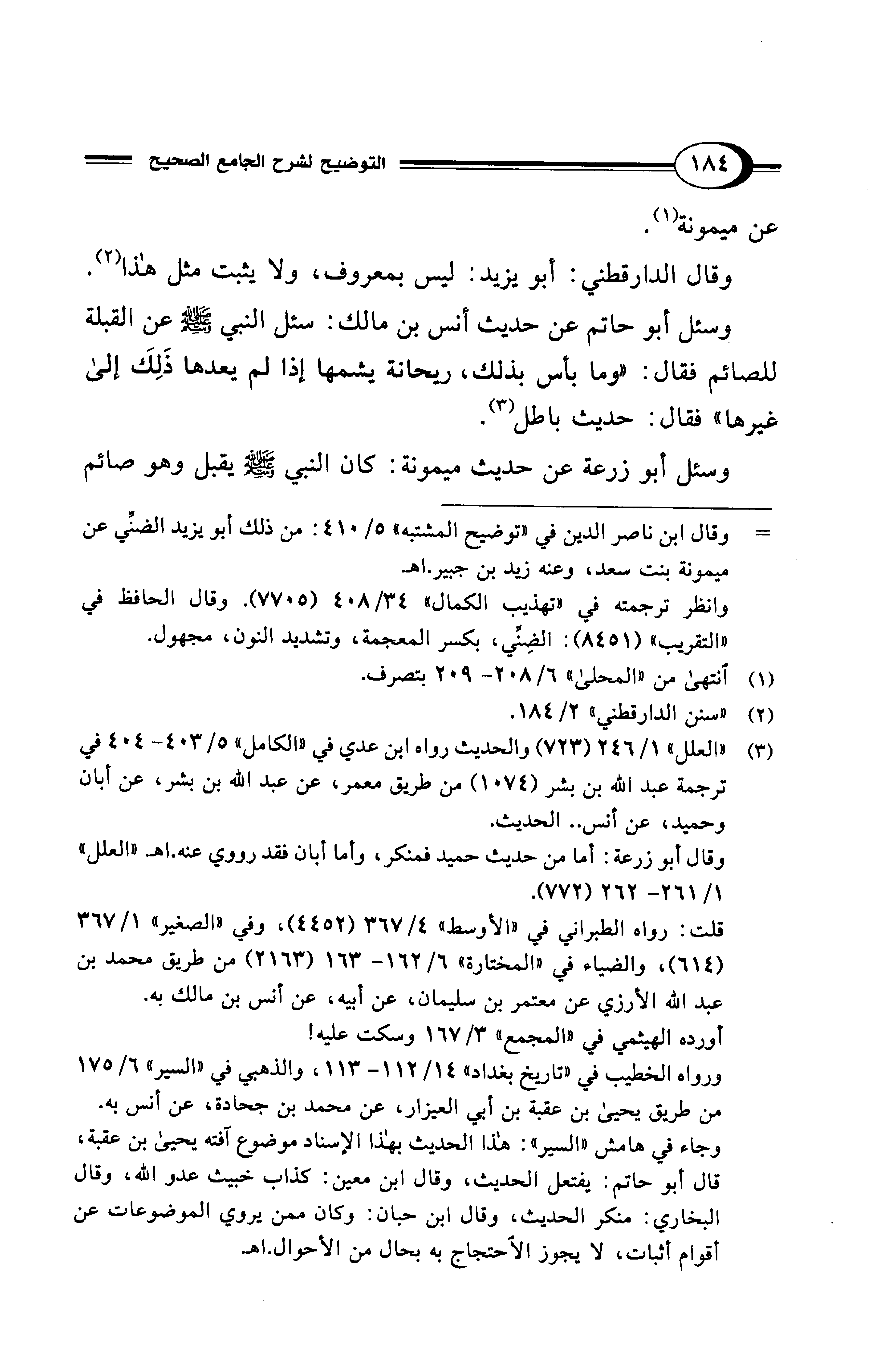 وسئل أبو حاتم عن حديث أنس بن مالك: سئل النبي - صلى الله عليه وسلم - عن القبلة للصائم فقال: "وما بأس بذلك، ريحانة يشمها إذا لم يعدها ذَلِكَ إلى غيرها" فقال: حديث باطل (¬3).