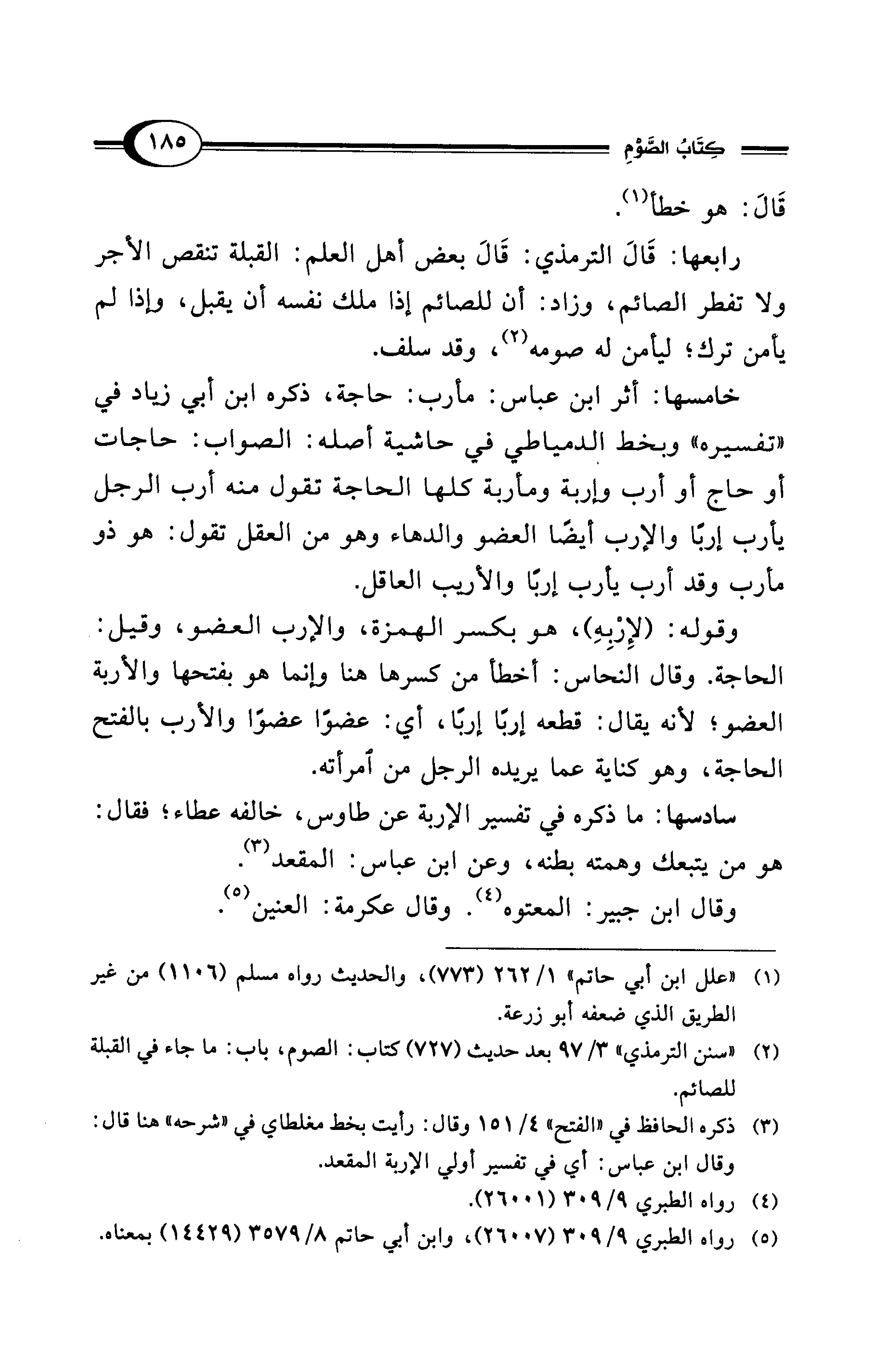 "تفسيره" وبخط الدمياطي في حاشية أصله: الصواب: حاجات أو حاج أو أرب وإربة ومأربة كلها الحاجة تقول منه أرب الرجل يأرب إربًا والإرب أيضًا العضو والدهاء وهو من العقل تقول: هو ذو مأرب وقد أرب يأرب إربًا والأريب العاقل.