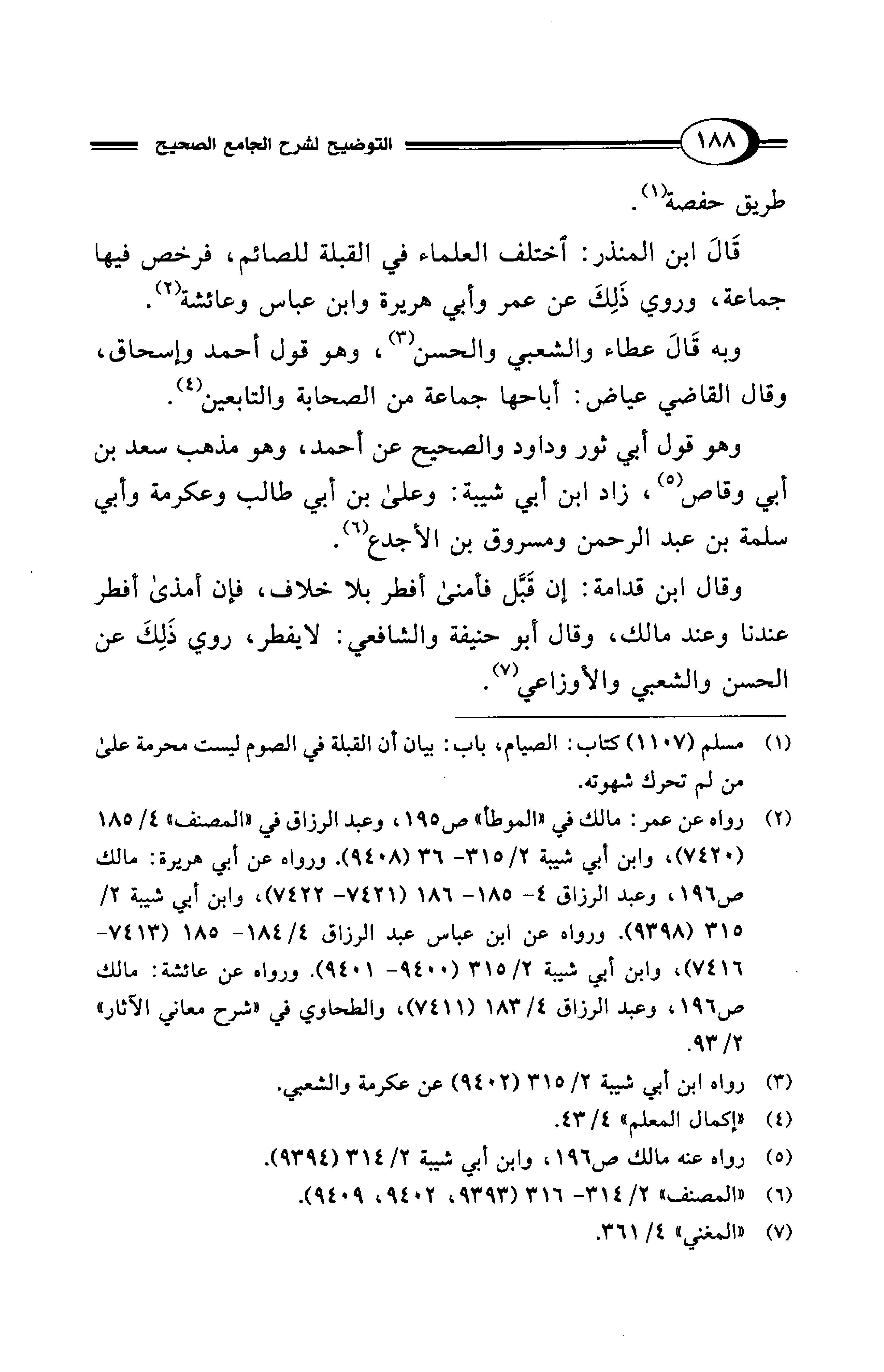 قَالَ ابن المنذر: اختلف العلماء في القبلة للصائم، فرخص فيها جماعة، وروي ذَلِكَ عن عمر وأبي هريرة وابن عباس وعائشة (¬2).