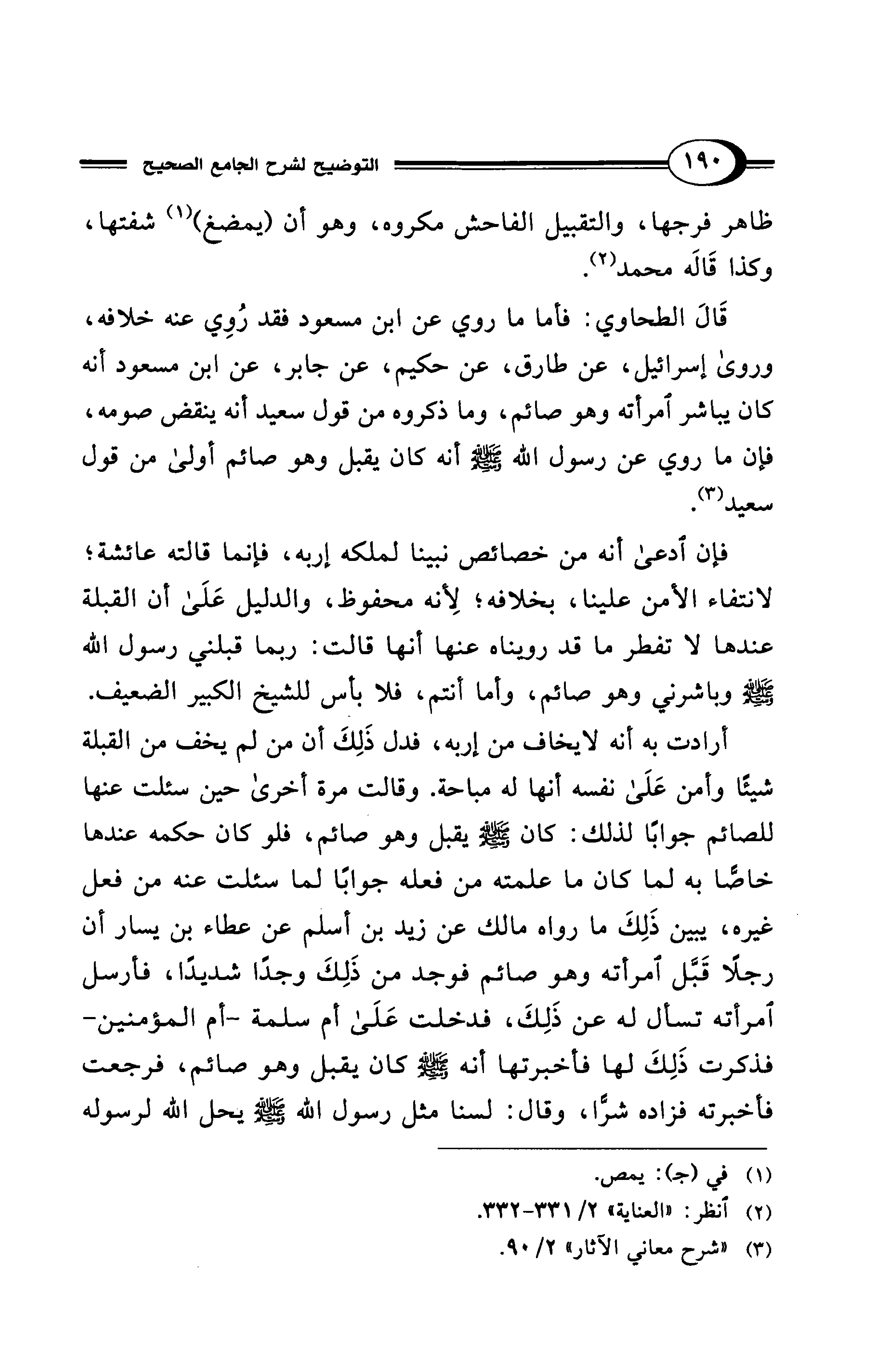 قَالَ الطحاوي: فأما ما روي عن ابن مسعود فقد رُوِي عنه خلافه، وروى إسرائيل، عن طارق، عن حكيم، عن جابر، عن ابن مسعود أنه كان يباشر امرأته وهو صائم، وما ذكروه من قول سعيد أنه ينقض صومه، فإن ما روي عن رسول الله - صلى الله عليه وسلم - أنه كان يقبل وهو صائم أولى من قول سعيد (¬3).