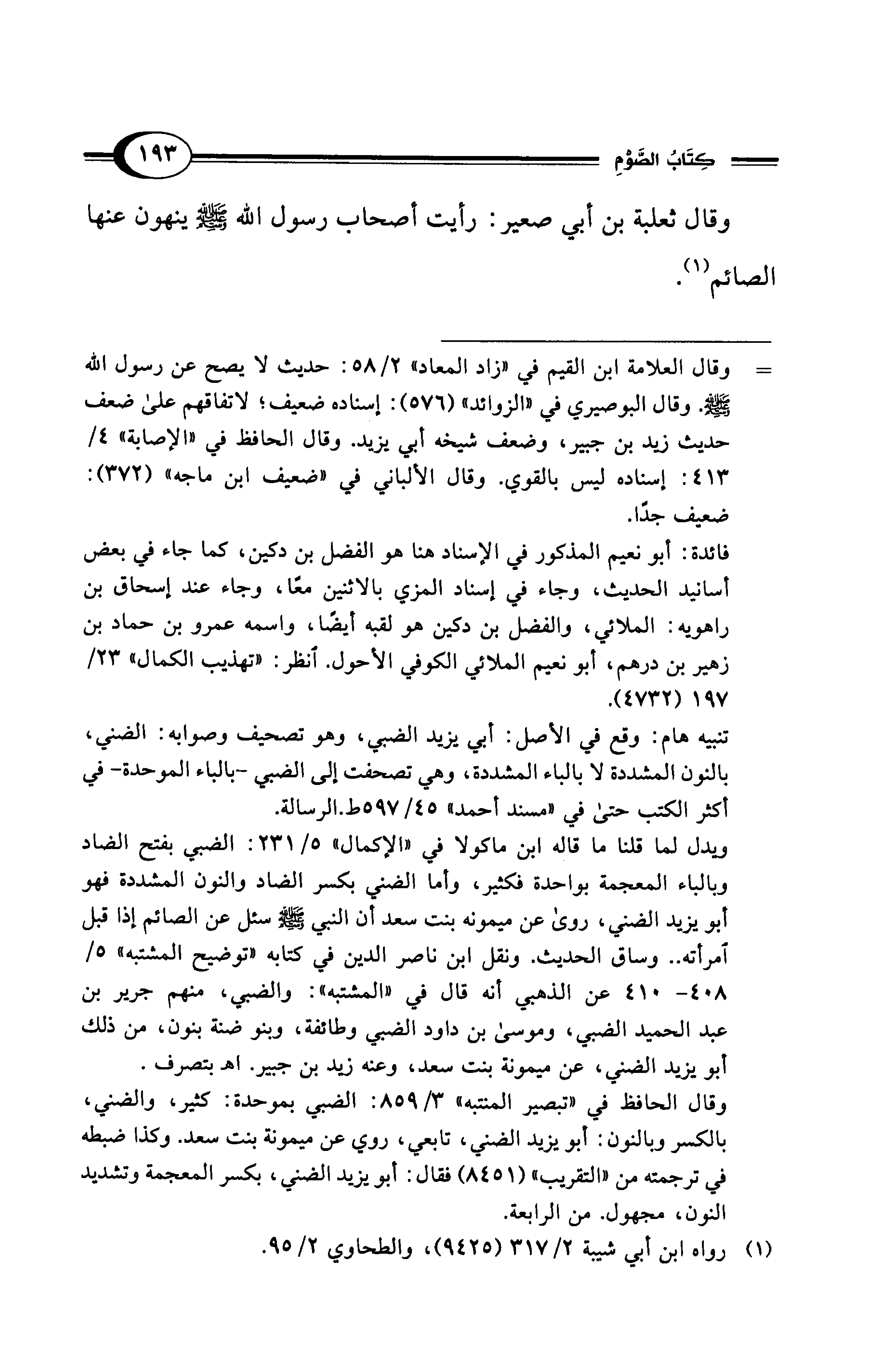 = وقال العلامة ابن القيم في "زاد المعاد" 2/ 58: حديث لا يصح عن رسول الله - صلى الله عليه وسلم -. وقال البوصيري في "الزوائد" (576): إسناده ضعيف؛ لاتفاقهم على ضعف حديث زيد بن جبير، وضعف شيخه أبي يزيد. وقال الحافظ في "الإصابة" 4/ 413: إسناده ليس بالقوي. وقال الألباني في "ضعيف ابن ماجه" (372): ضعيف جدًا.