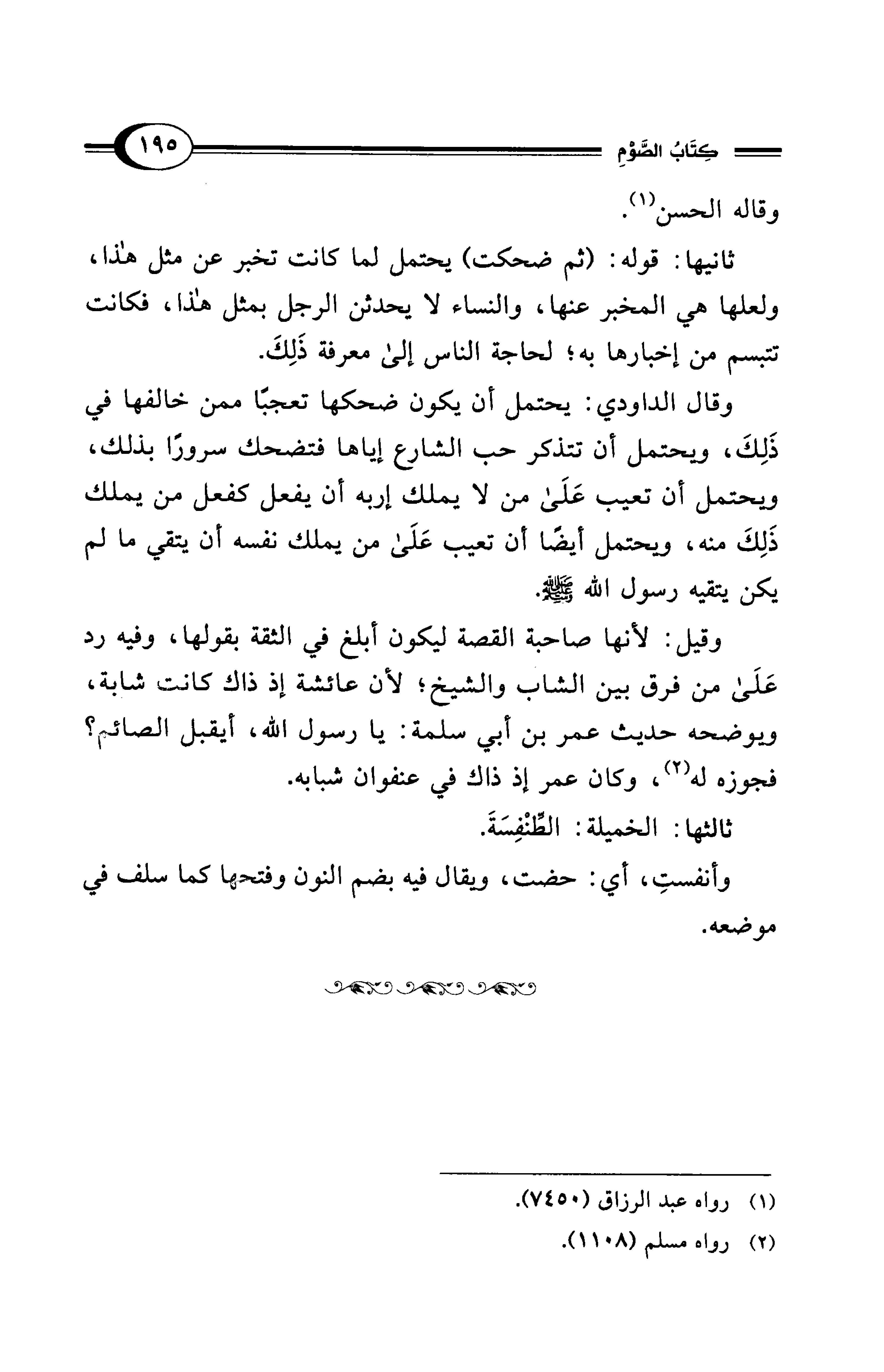 وقال الداودي: يحتمل أن يكون ضحكها تعجبًا ممن خالفها في ذَلِكَ، ويحتمل أن تتذكر حب الشارع إياها فتضحك سرورًا بذلك، ويحتمل أن تعيب عَلَى من لا يملك إربه أن يفعل كفعل من يملك ذَلِكَ منه، ويحتمل أيضًا أن تعيب عَلَى من يملك نفسه أن يتقي ما لم يكن يتقيه رسول الله - صلى الله عليه وسلم -.