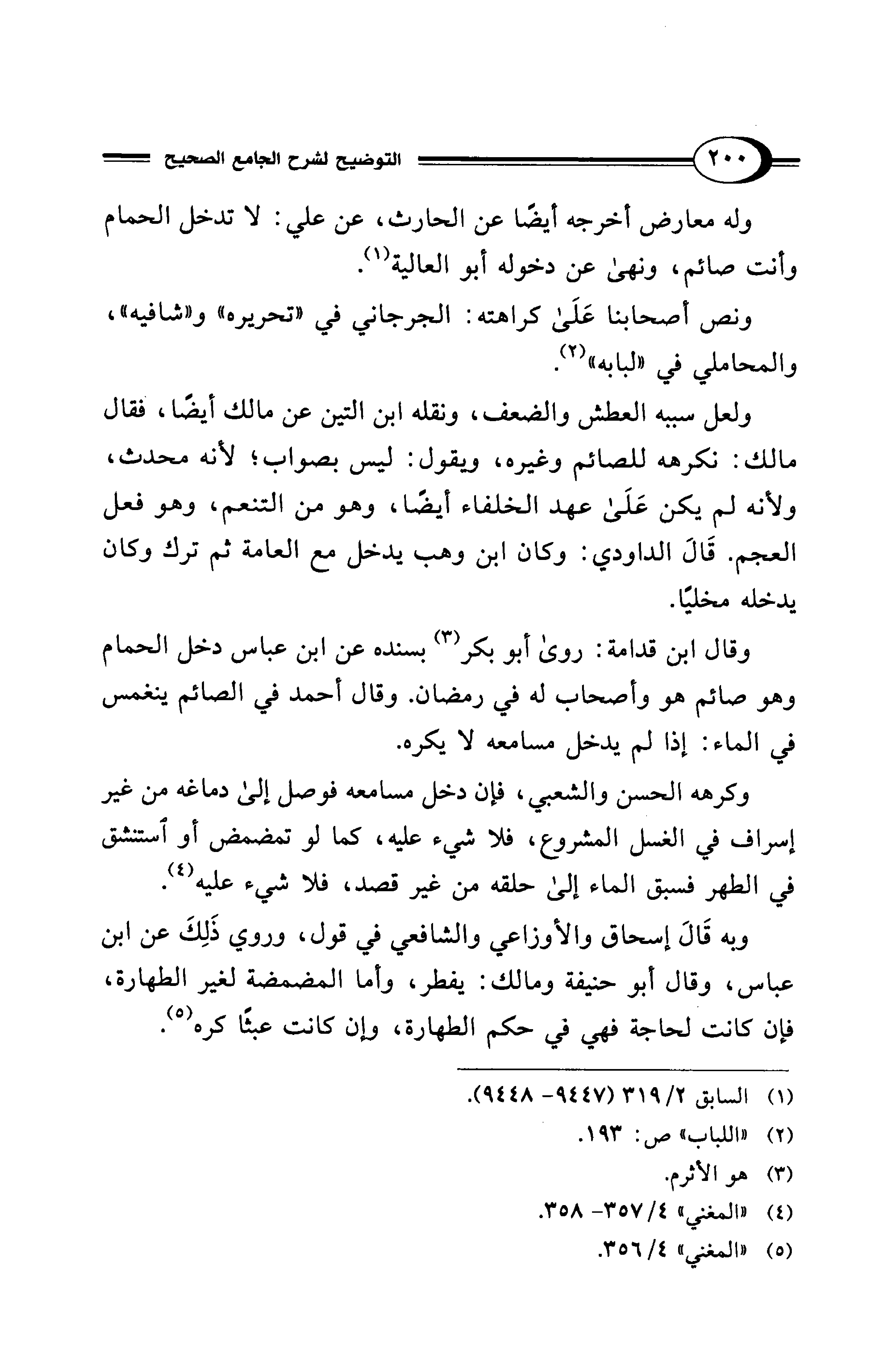 ولعل سببه العطش والضعف، ونقله ابن التين عن مالك أيضًا، فقال مالك: نكرهه للصائم وغيره، ويقول: ليس بصواب؛ لأنه محدث، ولأنه لم يكن عَلَى عهد الخلفاء أيضًا، وهو من التنعم، وهو فعل العجم. قَالَ الداودي: وكان ابن وهب يدخل مع العامة ثم ترك وكان يدخله مخليًا.