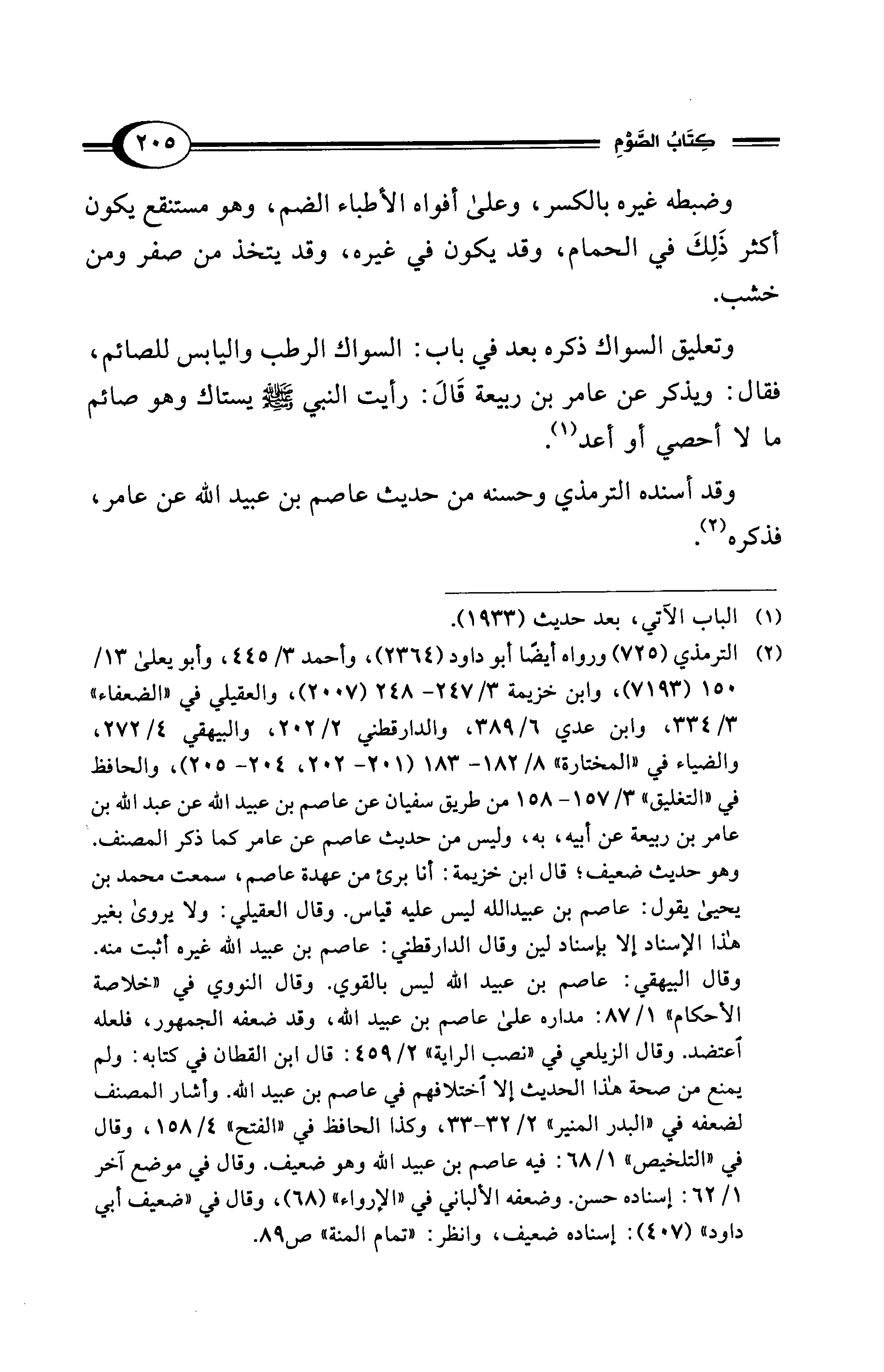 (¬2) الترمذي (725) ورواه أيضًا أبو داود (2364)، وأحمد 3/ 445، وأبو يعلى 13/ 150 (7193)، وابن خزيمة 3/ 247 - 248 (2007)، والعقيلي في "الضعفاء" 3/ 334، وابن عدي 6/ 389، والدارقطني 2/ 202، والبيهقي 4/ 272، والضياء في "المختارة" 8/ 182 - 183 (201 - 202، 204 - 205)، والحافظ في "التغليق" 3/ 157 - 158 من طريق سفيان عن عاصم بن عبيد الله عن عبد الله بن عامر بن ربيعة عن أبيه، به، وليس من حديث عاصم عن عامر كما ذكر المصنف. وهو حديث ضعيف؛ قال ابن خزيمة: أنا برئ من عهدة عاصم، سمعت محمد بن يحيى يقول: عاصم بن عبيد الله ليس عليه قياس. وقال العقيلي: ولا يروى بغير هذا الإسناد إلا بإسناد لين وقال الدارقطني: عاصم بن عبيد الله غيره أثبت منه. وقال البيهقي: عاصم بن عبيد الله ليس بالقوي. وقال النووي في "خلاصة الأحكام" 1/ 87: مداره على عاصم بن عبيد الله، وقد ضعفه الجمهور، فلعله اعتضد. وقال الزيلعي في "نصب الراية" 2/ 459: قال ابن القطان في كتابه: ولم يمنع من صحة هذا الحديث إلا اختلافهم في عاصم بن عبيد الله. وأشار المصنف لضعفه في "البدر المنير" 2/ 32 - 33، وكذا الحافظ في "الفتح" 4/ 158، وقال في "التلخيص" 1/ 68: فيه عاصم بن عبيد الله وهو ضعيف. وقال في موضع آخر 1/ 62: إسناده حسن. وضعفه الألباني في "الإرواء" (68)، وقال في "ضعيف أبي داود" (407): إسناده ضعيف، وانظر: "تمام المنة" ص 89.