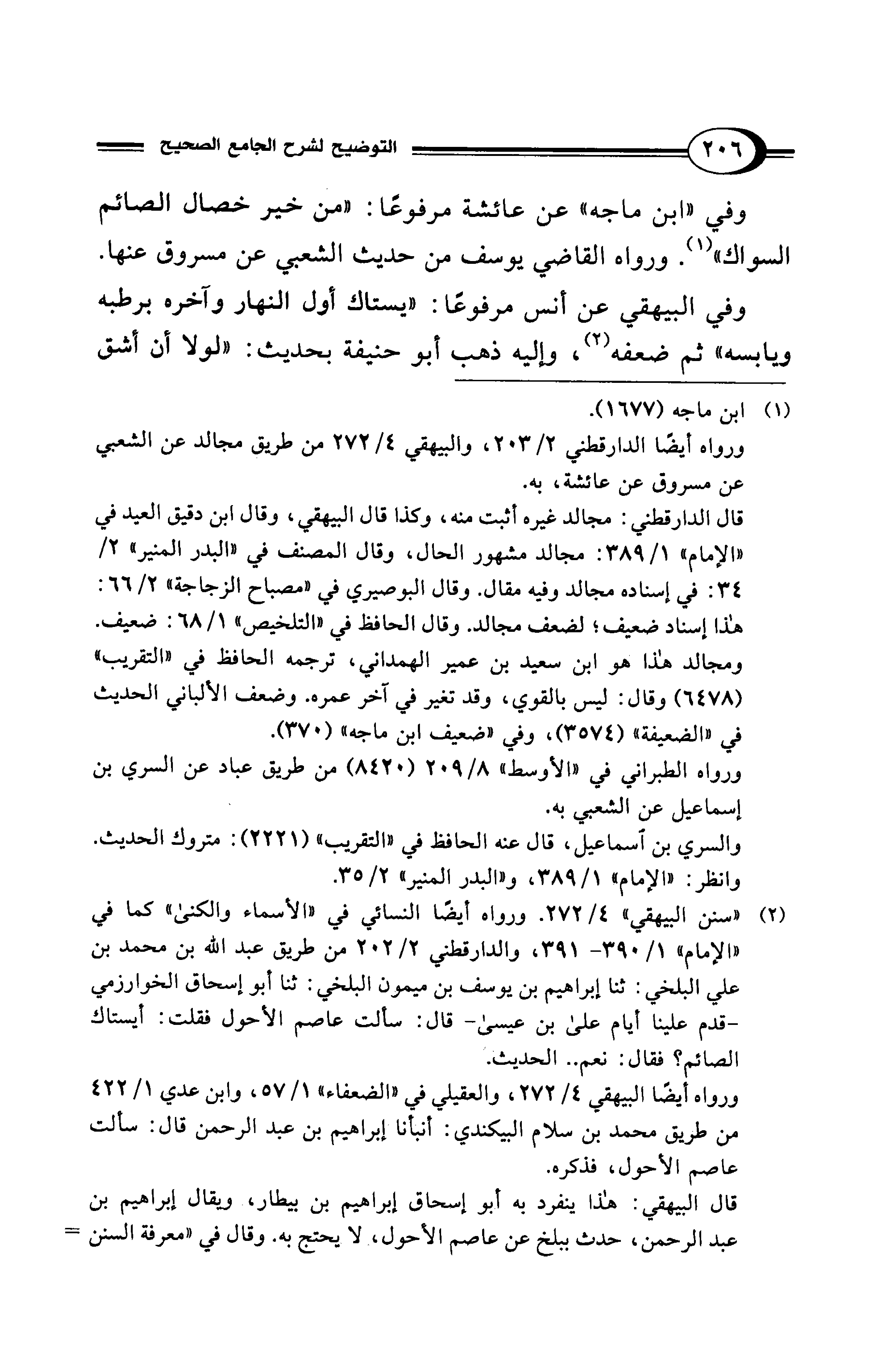 قال الدارقطني: مجالد غيره أثبت منه، وكذا قال البيهقي، وقال ابن دقيق العيد في "الإمام" 1/ 389: مجالد مشهور الحال، وقال المصنف في "البدر المنير" 2/ 34: في إسناده مجالد وفيه مقال. وقال البوصيري في "مصباح الزجاجة" 2/ 66: هذا إسناد ضعيف؛ لضعف مجالد. وقال الحافظ في "التلخيص" 1/ 68: ضعيف. ومجالد هذا هو ابن سعيد بن عمير الهمداني، ترجمه الحافظ في "التقريب" (6478) وقال: ليس بالقوي، وقد تغير في آخر عمره. وضعف الألباني الحديث في "الضعيفة" (3574)، وفي "ضعيف ابن ماجه" (370).