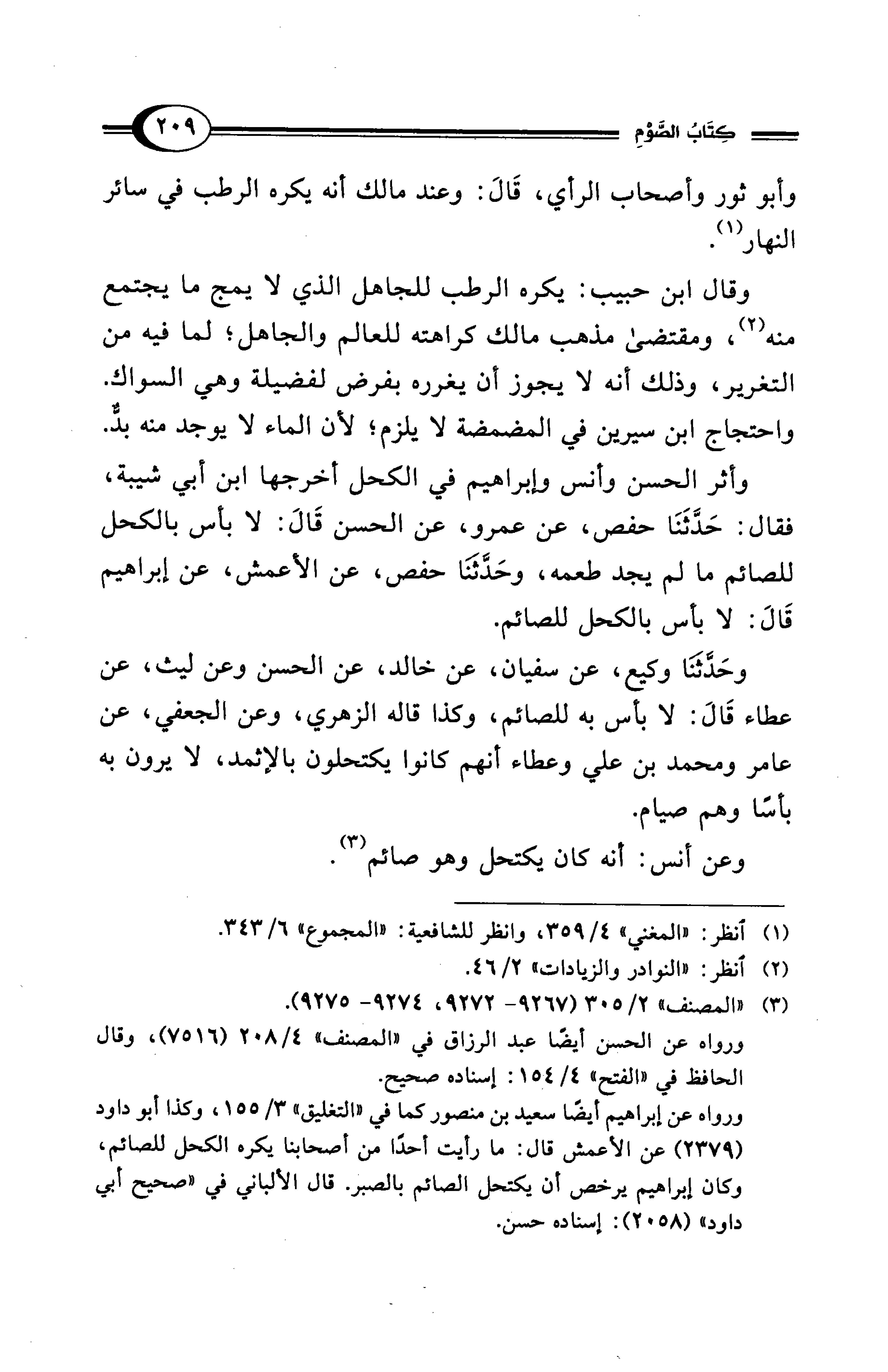 وأثر الحسن وأنس وإبراهيم في الكحل أخرجها ابن أبي شيبة، فقال: حَدَّثَنَا حفص، عن عمرو، عن الحسن قَالَ: لا بأس بالكحل للصائم ما لم يجد طعمه، وحَدَّثنَا حفص، عن الأعمش، عن إبراهيم قَالَ: لا بأس بالكحل للصائم.