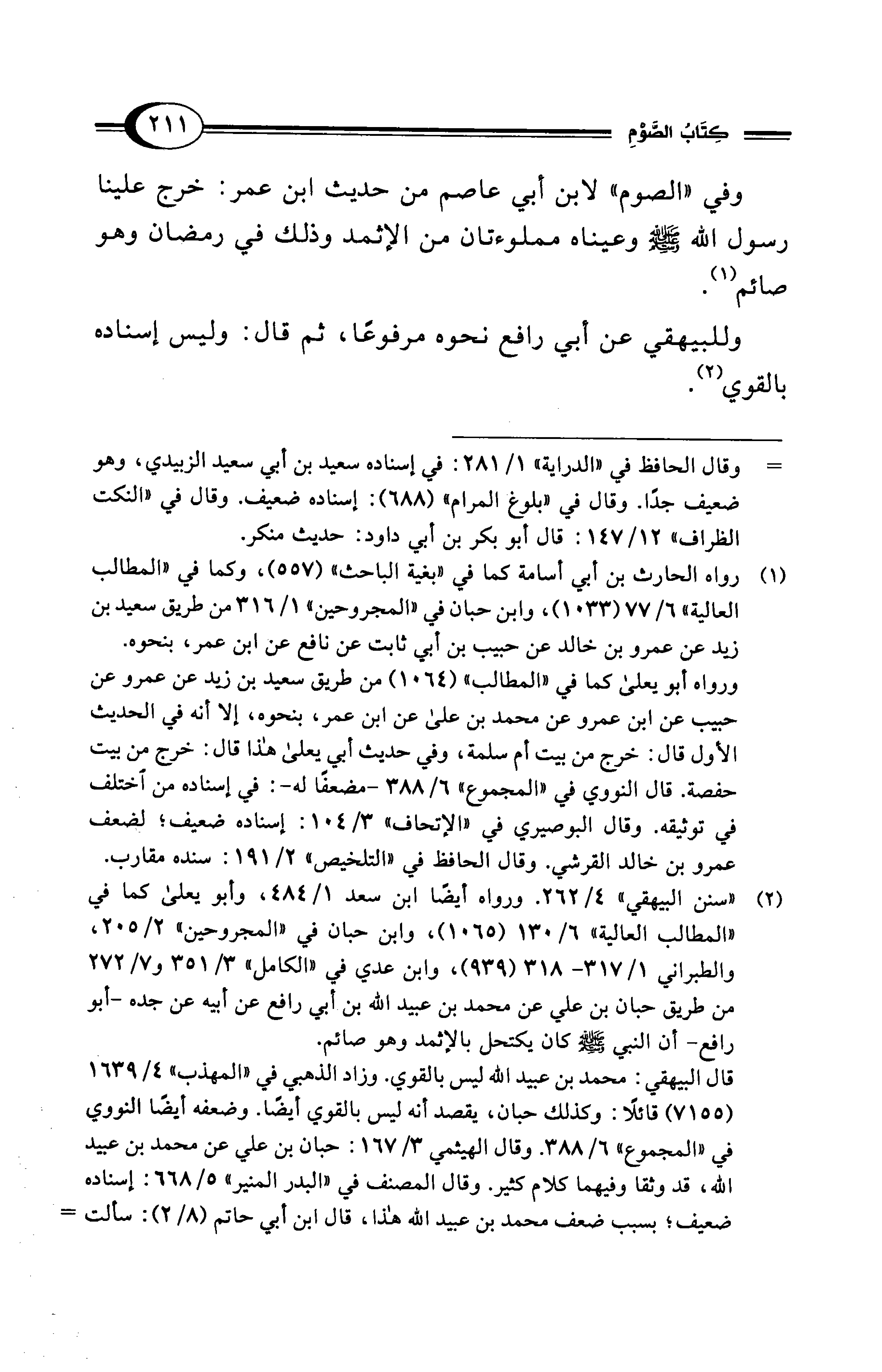 (¬2) "سنن البيهقي" 4/ 262. ورواه أيضًا ابن سعد 1/ 484، وأبو يعلى كما في "المطالب العالية" 6/ 130 (1065)، وابن حبان في "المجروحين" 2/ 205، والطبراني 1/ 317 - 318 (939)، وابن عدي في "الكامل" 3/ 351 و 7/ 272 من طريق حبان بن علي عن محمد بن عبيد الله بن أبي رافع عن أبيه عن جده -أبو رافع - أن النبي - صلى الله عليه وسلم - كان يكتحل بالإثمد وهو صائم.