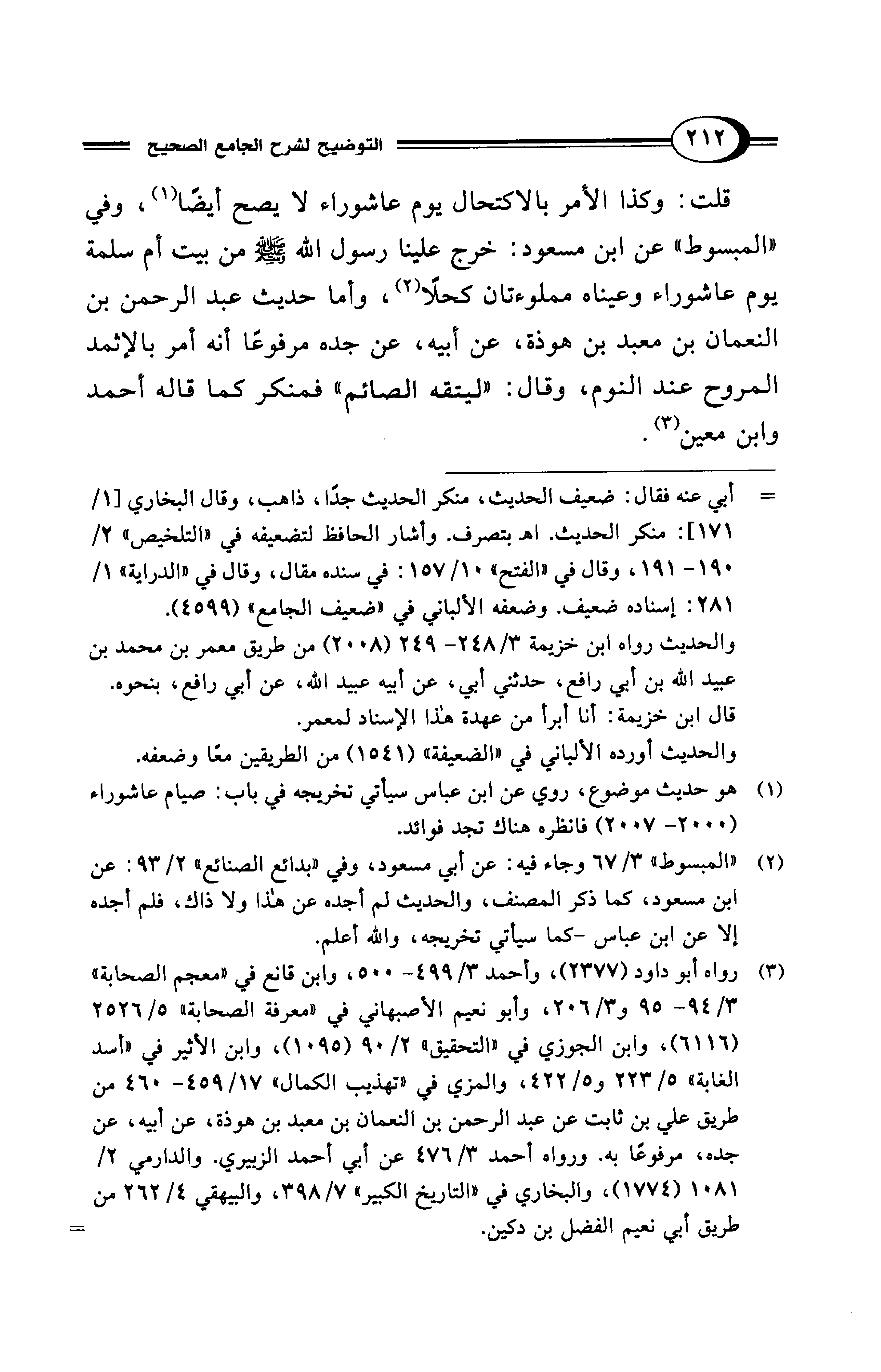 قلت: وكذا الأمر بالاكتحال يوم عاشوراء لا يصح أيضًا (¬1)، وفي "المبسوط" عن ابن مسعود: خرج علينا رسول الله - صلى الله عليه وسلم - بيت أم سلمة يوم عاشوراء وعيناه مملوءتان كحلًا (¬2)، وأما حديث عبد الرحمن بن النعمان بن معبد بن هوذة، عن أبيه، عن جده مرفوعًا أنه أمر بالإثمد