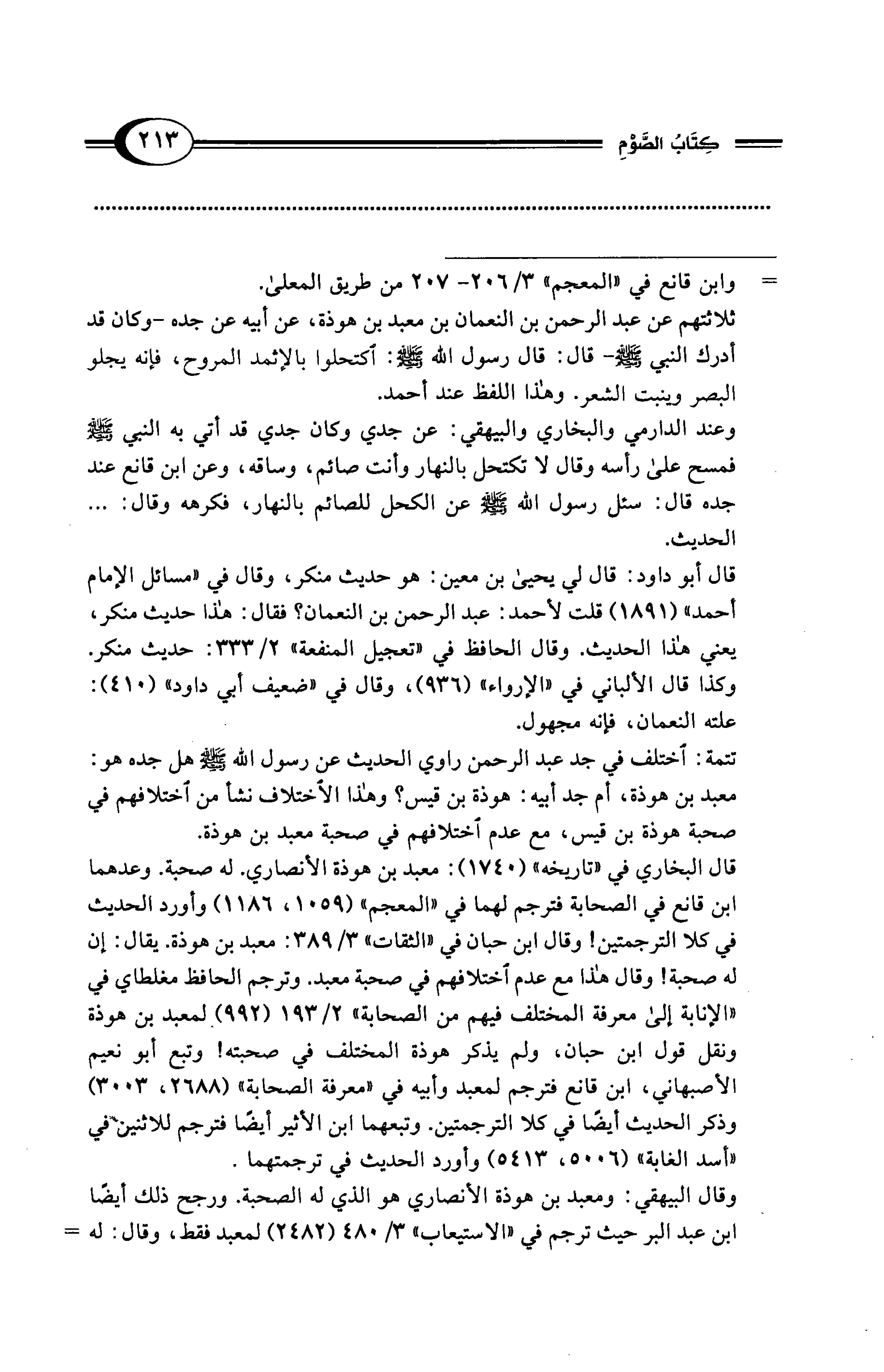 وعند الدارمي والبخاري والبيهقي: عن جدي وكان جدي قد أتي به النبي - صلى الله عليه وسلم - فمسح على رأسه وقال لا تكتحل بالنهار وأنت صائم، وساقه، وعن ابن قانع عند جده قال: سئل رسول الله - صلى الله عليه وسلم - عن الكحل للصائم بالنهار، فكرهه وقال: ... الحديث.