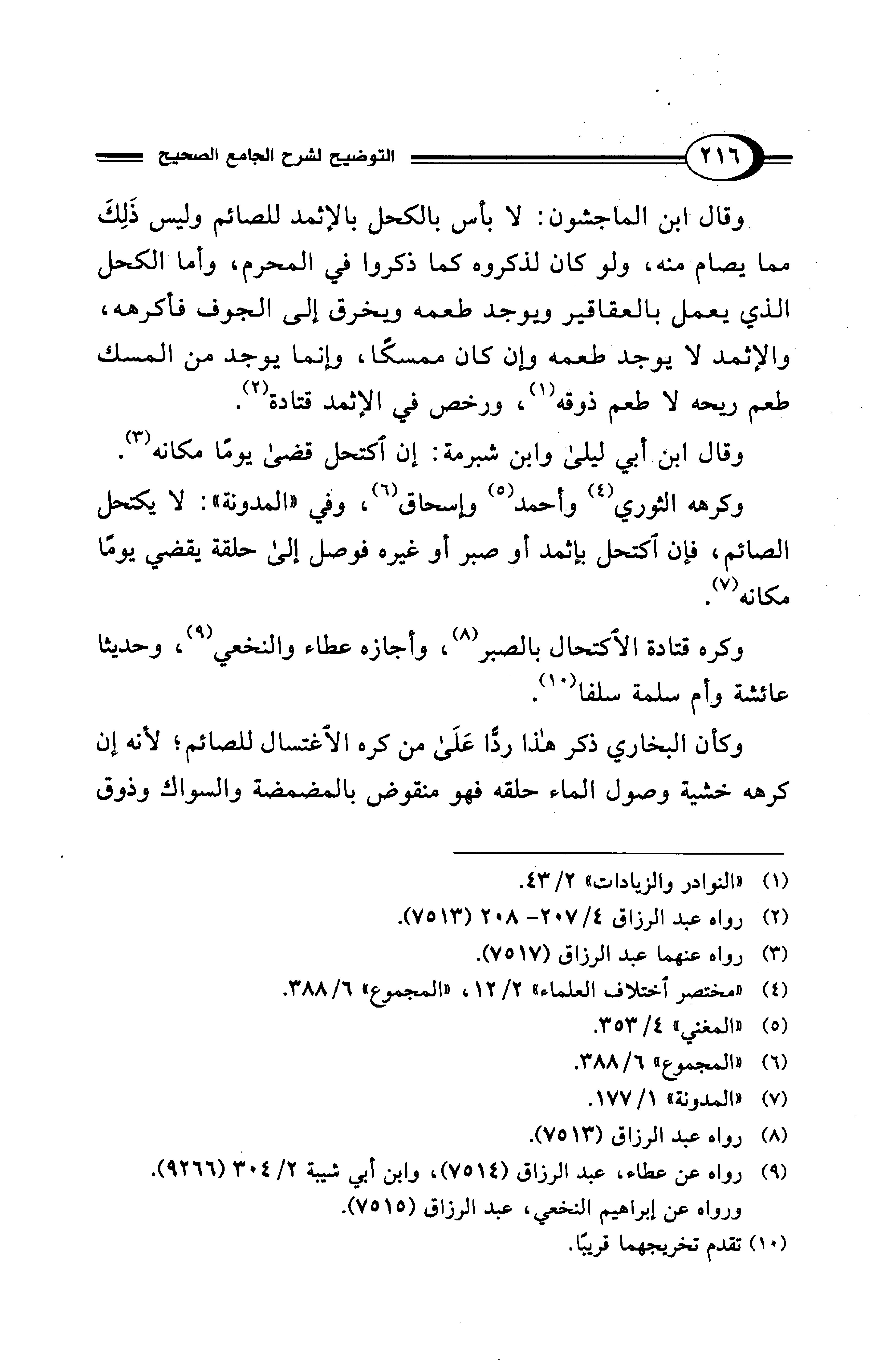 مما يصام منه، ولو كان لذكروه كما ذكروا في المحرم، وأما الكحل الذي يعمل بالعقاقير ويوجد طعمه ويخرق إلى الجوف فأكرهه، والإثمد لا يوجد طعمه وإن كان ممسكًا، وإنما يوجد من المسك طعم ريحه لا طعم ذوقه (¬1)، ورخص في الإثمد قتادة (¬2).