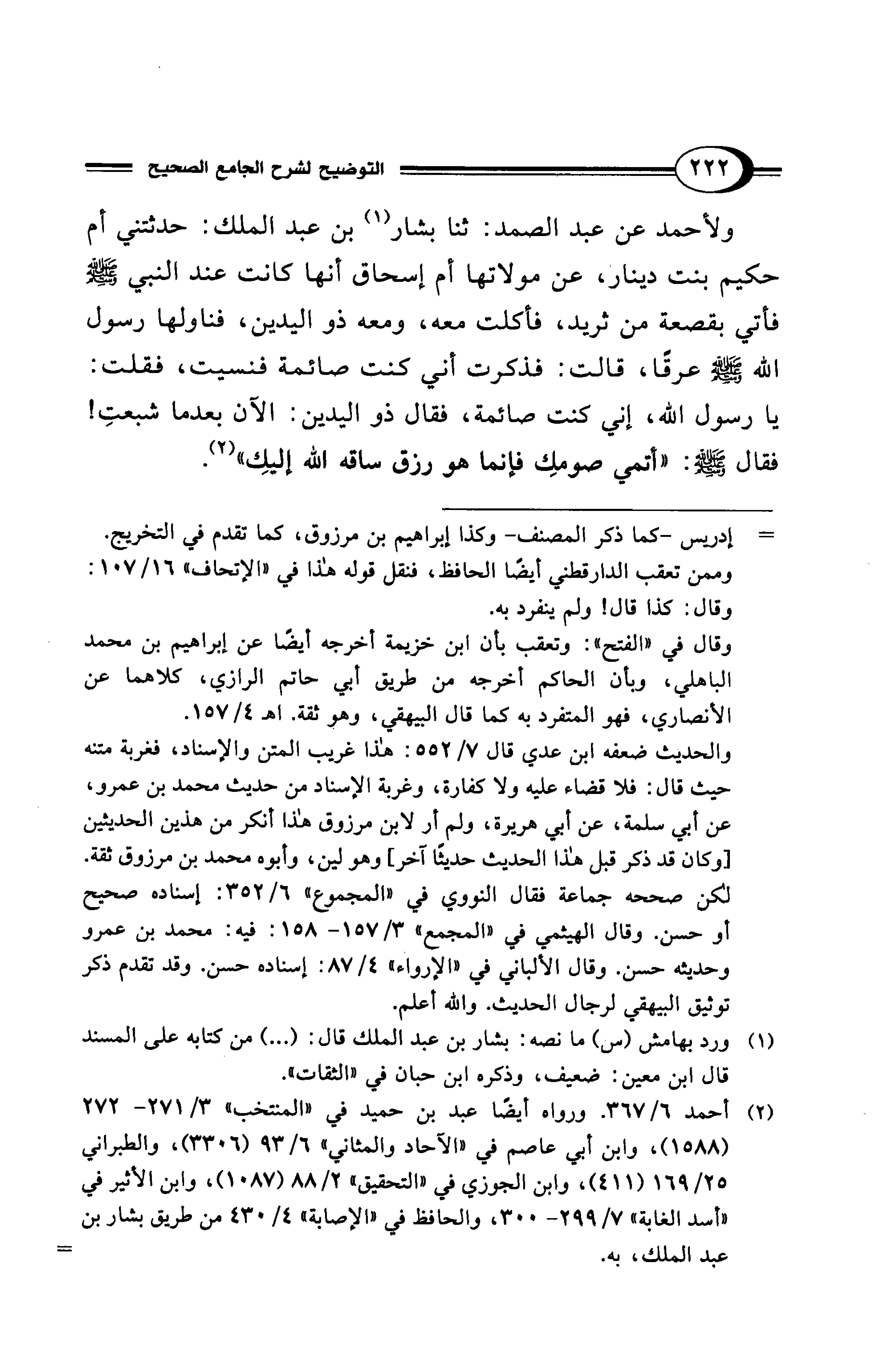 ولأحمد عن عبد الصمد: ثنا بشار (¬1) بن عبد الملك: حدثتني أم حكيم بنت دينار، عن مولاتها أم إسحاق أنها كانت عند النبي - صلى الله عليه وسلم - فأتي بقصعة من ثريد، فأكلت معه، ومعه ذو اليدين، فناولها رسول الله - صلى الله عليه وسلم - عرقًا، قالت: فذكرت أني كنت صائمة فنسيت، فقلت: يا رسول الله، إني كنت صائمة، فقال ذو اليدين: الآن بعدما شبعتِ! فقال - صلى الله عليه وسلم -: "أتمي صومكِ فإنما هو رزق ساقه الله إليكِ" (¬2).