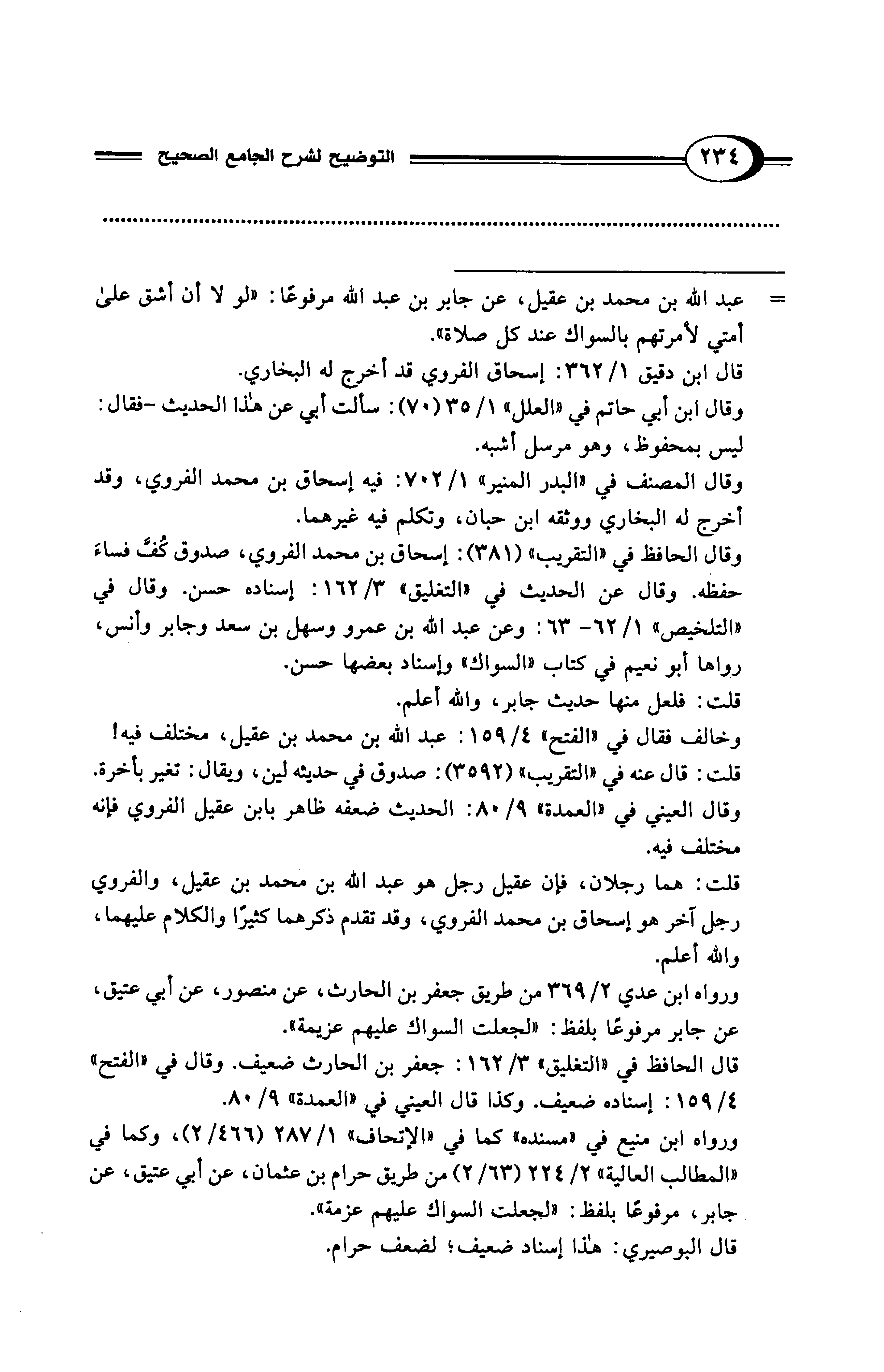 = عبد الله بن محمد بن عقيل، عن جابر بن عبد الله مرفوعًا: "لولا أن أشق على أمتي لأمرتهم بالسواك عند كل صلاة".