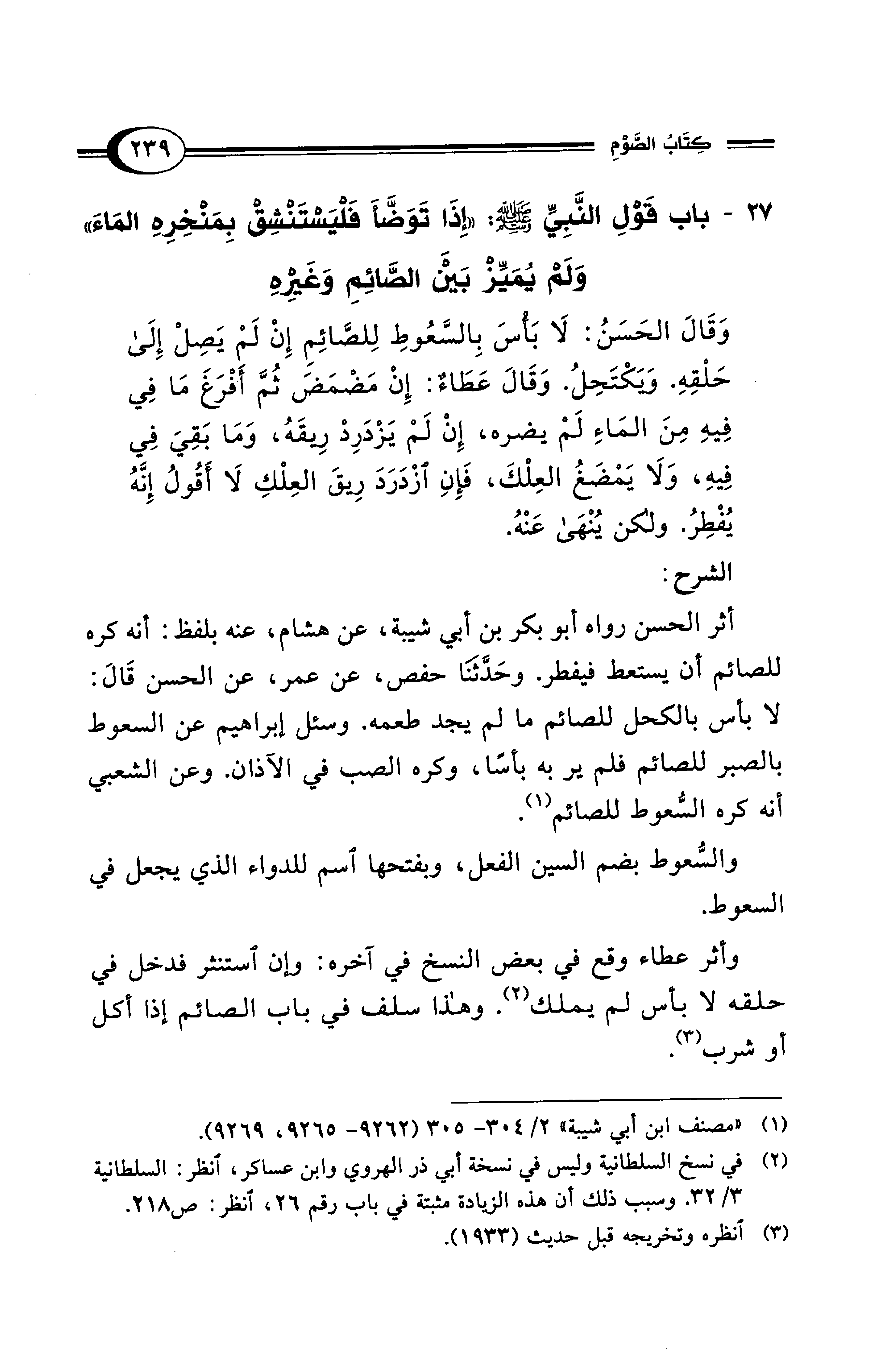 أثر الحسن رواه أبو بكر بن أبي شيبة، عن هشام، عنه بلفظ: أنه كره للصائم أن يستعط فيفطر. وحَدَّثَنَا حفص، عن عمر، عن الحسن قَالَ: لا بأس بالكحل للصائم ما لم يجد طعمه. وسئل إبراهيم عن السعوط بالصبر للصائم فلم ير به بأسًا، وكره الصب في الآذان. وعن الشعبي أنه كره السُّعوط للصائم (¬1).