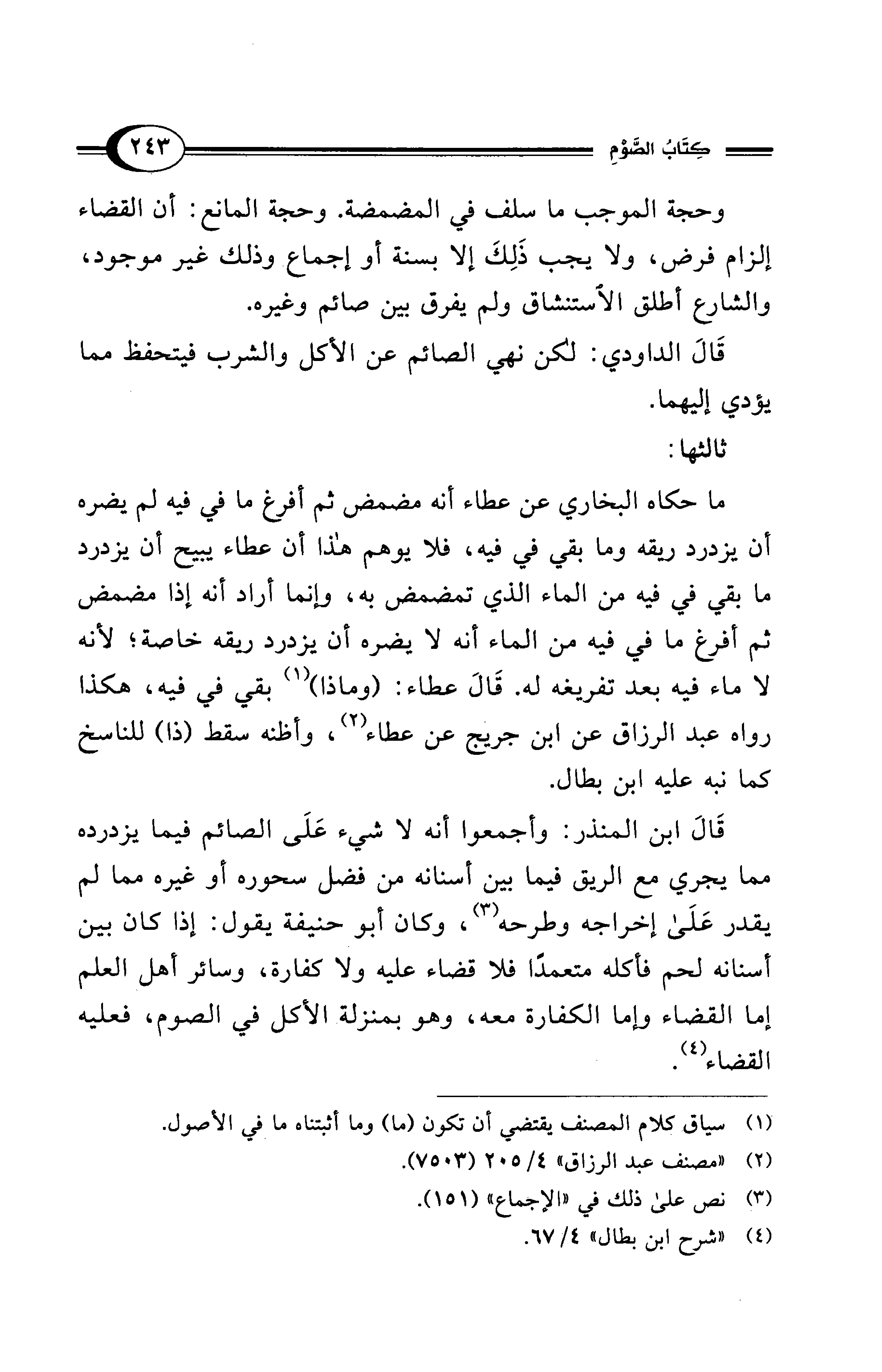 قَالَ ابن المنذر: وأجمعوا أنه لا شيء عَلَى الصائم فيما يزدرده مما يجري مع الريق فيما بين أسنانه من فضل سحوره أو غيره مما لم يقدر عَلَى إخراجه وطرحه (¬3)، وكان أبو حنيفة يقول: إذا كان بين أسنانه لحم فأكله متعمدًا فلا قضاء عليه ولا كفارة، وسائر أهل العلم إما القضاء وإما الكفارة معه، وهو بمنزلة الأكل في الصوم، فعليه القضاء (¬4).