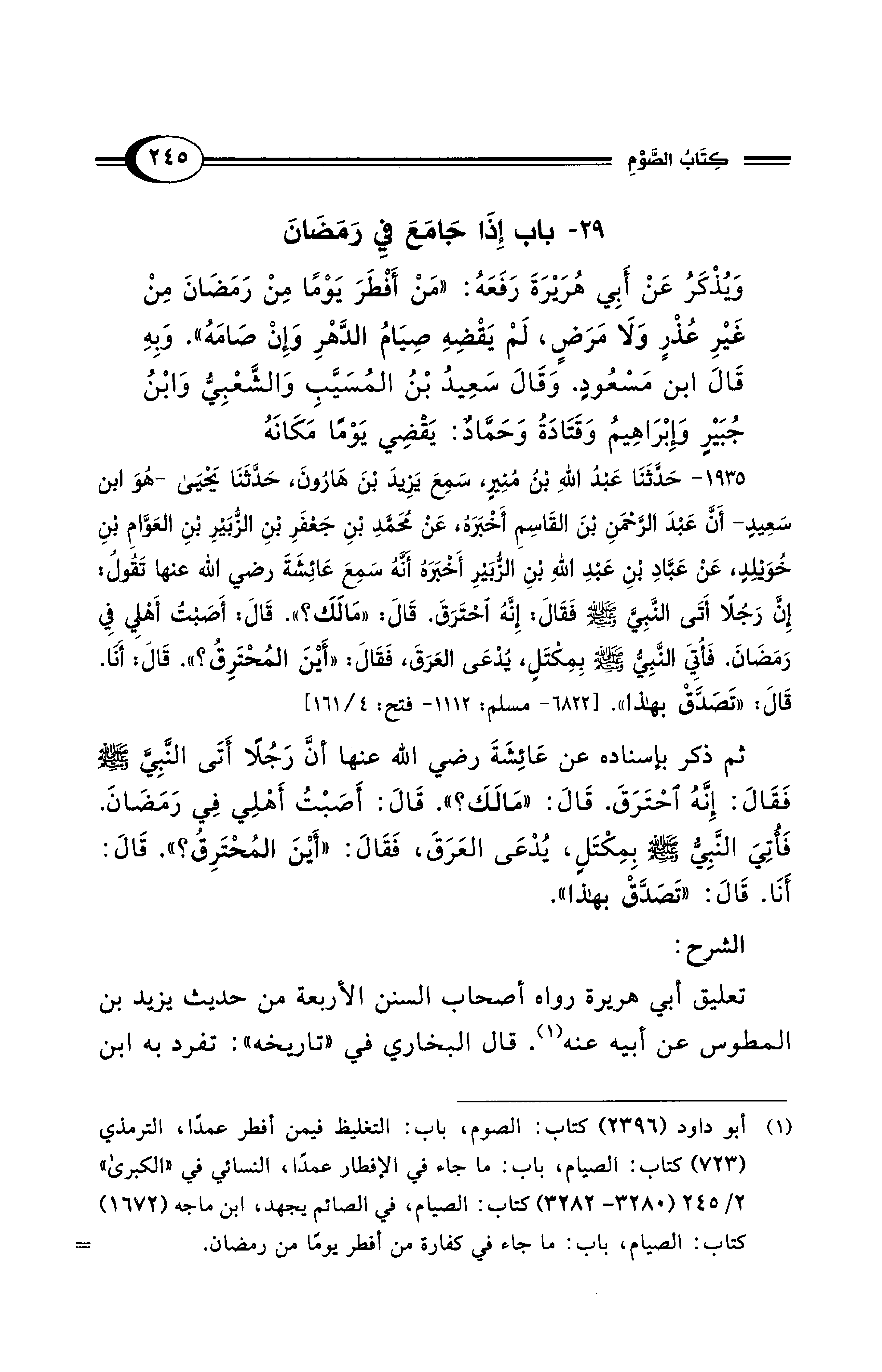 1935 - حَدَّثَنَا عَبْدُ اللهِ بْنُ مُنِيرٍ، سَمِعَ يَزِيدَ بْنَ هَارُونَ، حَدَّثَنَا يَحْيَى -هُوَ ابْنُ سَعِيدٍ- أَنَّ عَبْدَ الرَّحْمَنِ بْنَ القَاسِمِ أَخْبَرَهُ، عَنْ مُحَمَّدِ بْنِ جَعْفَرِ بْنِ الزُّبَيْرِ بْنِ العَوَّامِ بْنِ خُوَيْلِدٍ، عَنْ عَبَّادِ بْنِ عَبْدِ اللهِ بْنِ الزُّبَيْرِ أَخْبَرَهُ أَنَّهُ سَمِعَ عَائِشَةَ رضي الله عنها تَقُولُ: إِنَّ رَجُلًا أَتَى النَّبِيَّ - صلى الله عليه وسلم - فَقَالَ: إِنَّهُ احْتَرَقَ. قَالَ: "مَالَكَ؟ ". قَالَ: أَصَبْتُ أَهْلِي فِي رَمَضَانَ. فَأُتِيَ النَّبِيُّ - صلى الله عليه وسلم - بِمِكْتَلٍ، يُدْعَى العَرَقَ، فَقَالَ: "أَيْنَ المُحْتَرِقُ؟ ". قَالَ: أَنَا. قَالَ: "تَصَدَّقْ بِهَذَا". [6822 - مسلم: 1112 - فتح: 4/ 161]