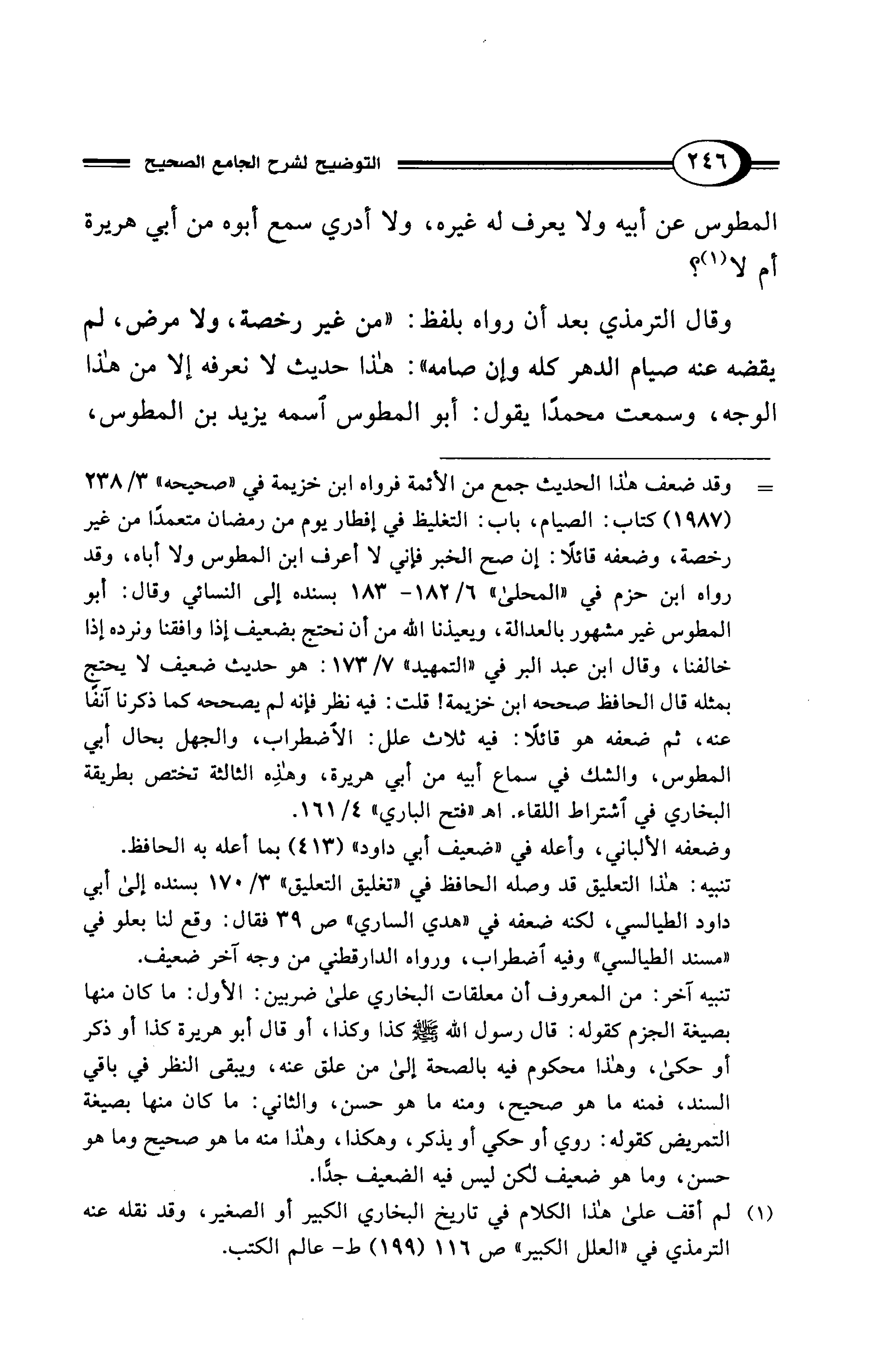 وقال الترمذي بعد أن رواه بلفظ: "من غير رخصة، ولا مرض، لم يقضه عنه صيام الدهر كله وإن صامه": هذا حديث لا نعرفه إلا من هذا الوجه، وسمعت محمدًا يقول: أبو المطوس اسمه يزيد بن المطوس،