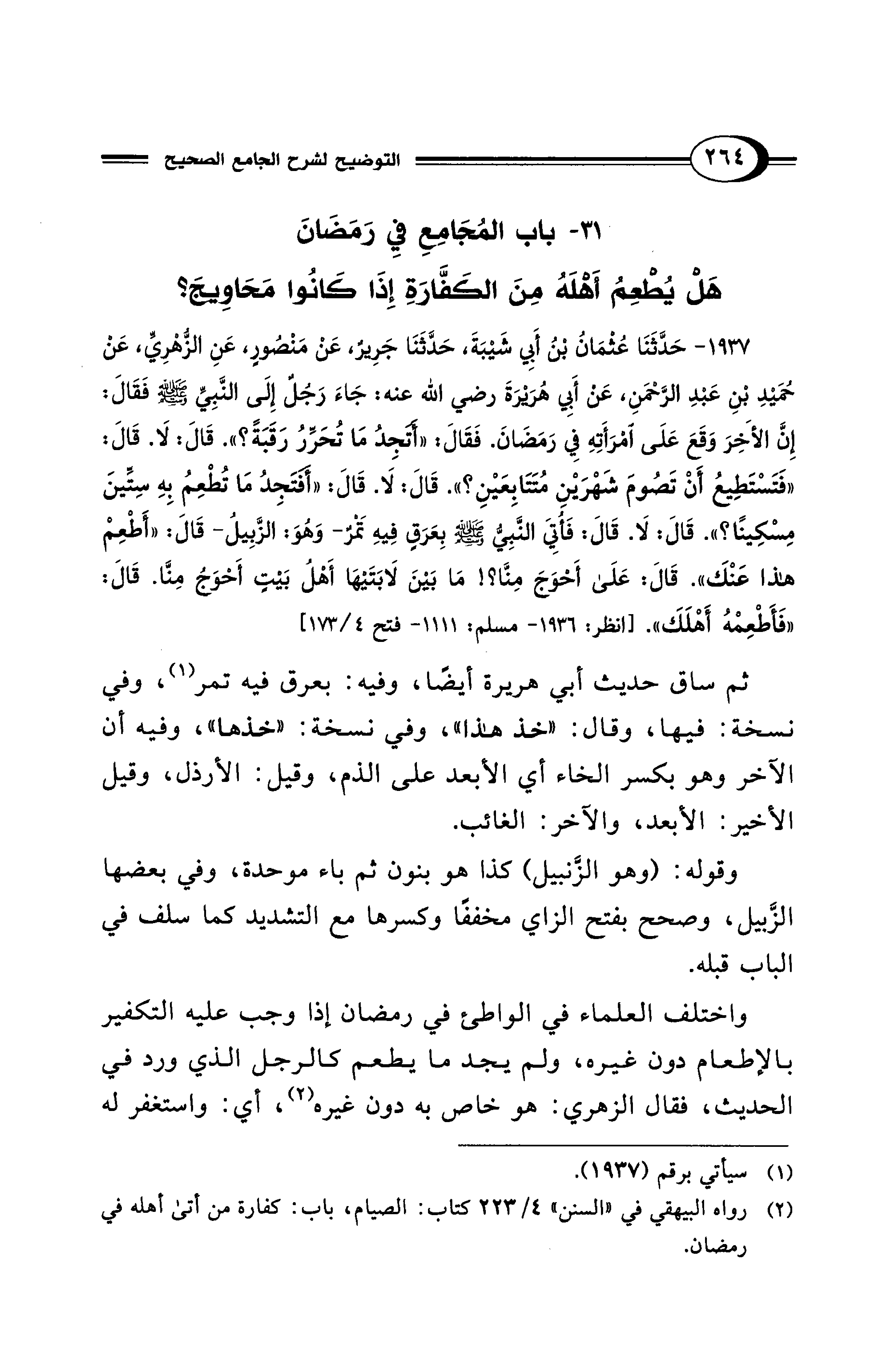 1937 - حَدَّثَنَا عُثْمَانُ بْنُ أَبِي شَيْبَةَ، حَدَّثَنَا جَرِيرٌ، عَنْ مَنْصُورٍ، عَنِ الزُّهْرِيِّ، عَنْ حُمَيْدِ بْنِ عَبْدِ الرَّحْمَنِ، عَنْ أَبِي هُرَيْرَةَ رضي الله عنه: جَاءَ رَجُلٌ إِلَى النَّبِيِّ - صلى الله عليه وسلم - فَقَالَ: إِنَّ الأَخِرَ وَقَعَ عَلَى امْرَأَتِهِ فِي رَمَضَانَ. فَقَالَ: "أَتَجِدُ مَا تُحَرِّرُ رَقَبَةً؟ ". قَالَ: لَا. قَالَ: "فَتَسْتَطِيعُ أَنْ تَصُومَ شَهْرَيْنِ مُتَتَابِعَيْنِ؟ ". قَالَ: لَا. قَالَ: "أَفَتَجِدُ مَا تُطْعِمُ بِهِ سِتِّينَ مِسْكِينًا؟ ". قَالَ: لَا. قَالَ: فَأُتِيَ النَّبِيُّ - صلى الله عليه وسلم - بِعَرَقٍ فِيهِ تَمْرٌ- وَهُوَ: الزَّبِيلُ- قَالَ: "أَطْعِمْ هَذَا عَنْكَ". قَالَ: عَلَى أَحْوَجَ مِنَّا؟! مَا بَيْنَ لاَبَتَيْهَا أَهْلُ بَيْتٍ أَحْوَجُ مِنَّا. قَالَ: "فَأَطْعِمْهُ أَهْلَكَ". [انظر: 1936 - مسلم: 1111 - فتح 4/ 173]