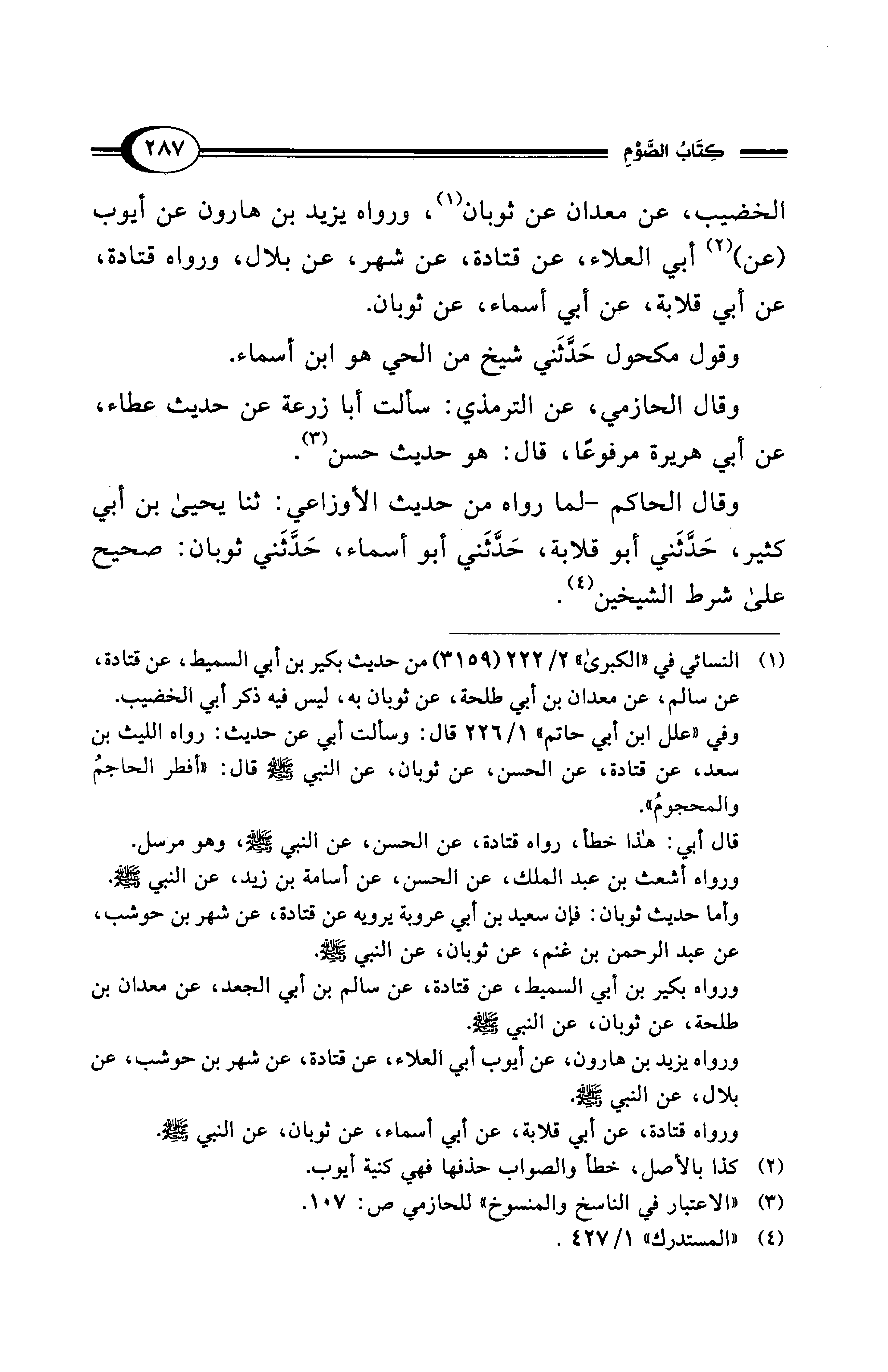 وقال الحاكم- لما رواه من حديث الأوزاعي: ثنا يحيى بن أبي كثير، حَدَّثَني أبو قلابة، حَدَّثَني أبو أسماء، حَدَّثَني ثوبان: صحيح على شرط الشيخين (¬4).