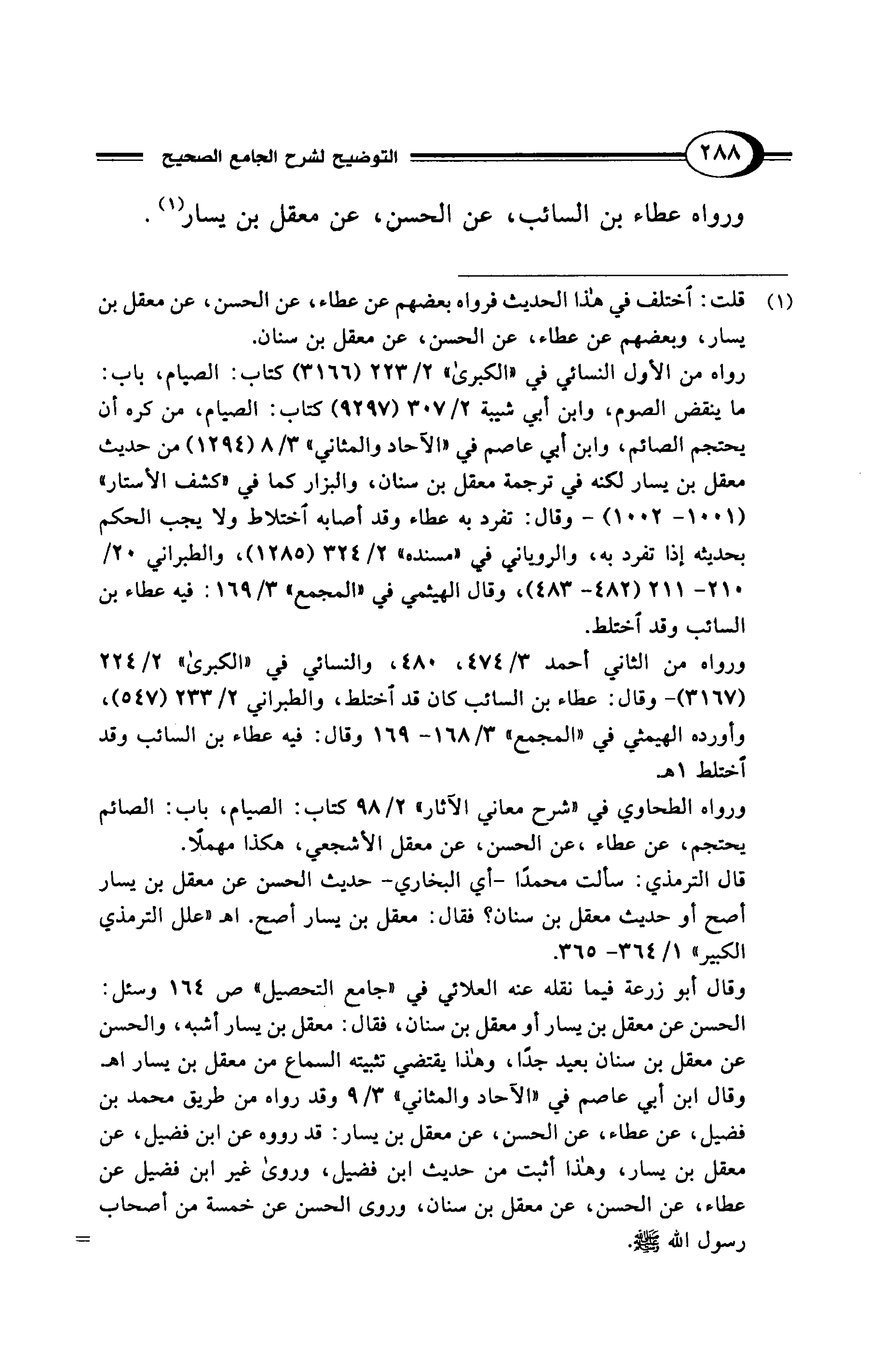 وقال أبو زرعة فيما نقله عنه العلائي في "جامع التحصيل" ص 164 وسئل: الحسن عن معقل بن يسار أو معقل بن سنان، فقال: معقل بن يسار أشبه، والحسن عن معقل بن سنان بعيد جدًا، وهذا يقتضي تثبيته السماع من معقل بن يسار اهـ وقال ابن أبي عاصم في "الآحاد والمثاني" 3/ 9 وقد رواه من طريق محمد بن فضيل، عن عطاء، عن الحسن، عن معقل بن يسار: قد رووه عن ابن فضيل، عن معقل بن يسار، وهذا أثبت من حديث ابن فضيل، وروى غير ابن فضيل عن عطاء، عن الحسن، عن معقل بن سنان، وروى الحسن عن خمسة من أصحاب رسول الله - صلى الله عليه وسلم -. =
