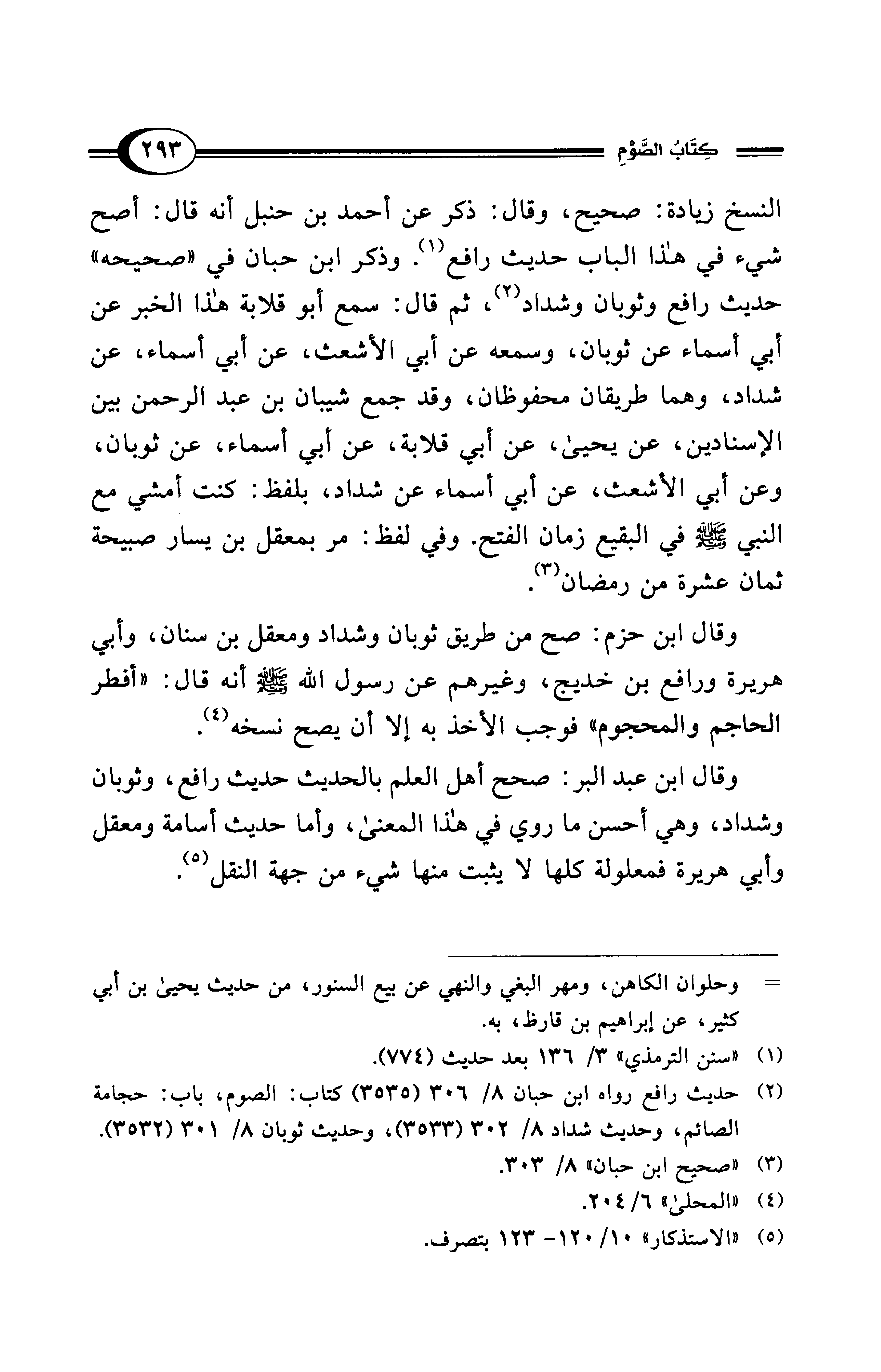 وقال ابن حزم: صح من طريق ثوبان وشداد ومعقل بن سنان، وأبي هريرة ورافع بن خديج، وغيرهم عن رسول الله - صلى الله عليه وسلم - أنه قال: "أفطر الحاجم والمحجوم" فوجب الأخذ به إلا أن يصح نسخه (¬4).