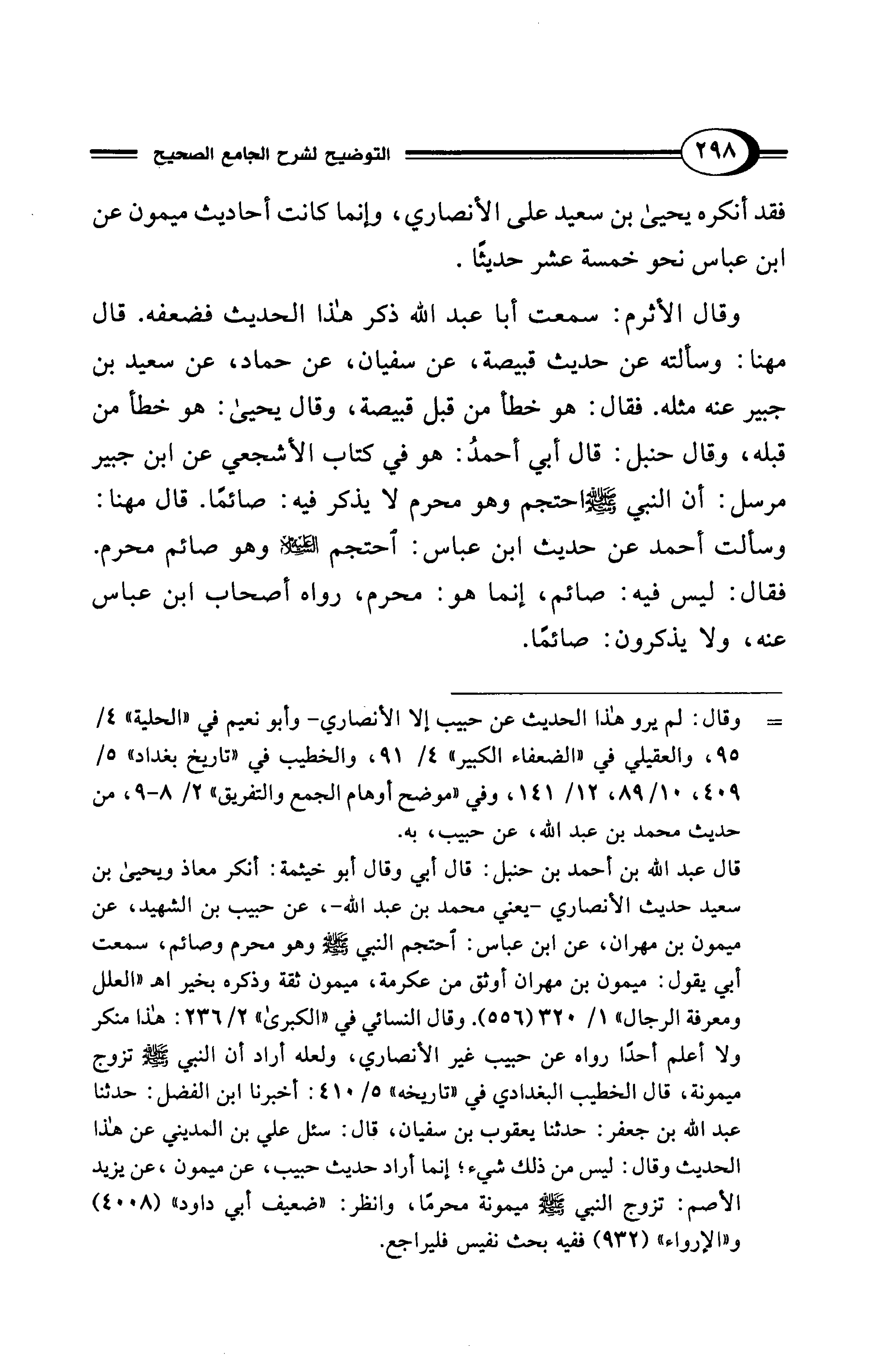 قال عبد الله بن أحمد بن حنبل: قال أبي وقال أبو خيثمة: أنكر معاذ ويحيى بن سعيد حديث الأنصاري -يعني محمد بن عبد الله-، عن حبيب بن الشهيد، عن ميمون بن مهران، عن ابن عباس: احتجم النبي - صلى الله عليه وسلم - وهو محرم وصائم، سمعت أبي يقول: ميمون بن مهران أوثق من عكرمة، ميمون ثقة وذكره بخير اهـ. "العلل ومعرفة الرجال" 1/ 320 (556). وقال النسائي في "الكبرى" 2/ 236: هذا منكر ولا أعلم أحدًا رواه عن حبيب غير الأنصاري، ولعله أراد أن النبي - صلى الله عليه وسلم - تزوج ميمونة، قال الخطيب البغدادي في "تاريخه" 5/ 410: أخبرنا ابن الفضل: حدثنا عبد الله بن جعفر: حدثنا يعقوب بن سفيان، قال: سئل علي بن المديني عن هذا الحديث وقال: ليس من ذلك شيء؛ إنما أراد حديث حبيب، عن ميمون، عن يزيد الأصم: تزوج النبي - صلى الله عليه وسلم - ميمونة محرمًا، وانظر: "ضعيف أبي داود" (4008) و"الإرواء" (932) ففيه بحث نفيس فليراجع.