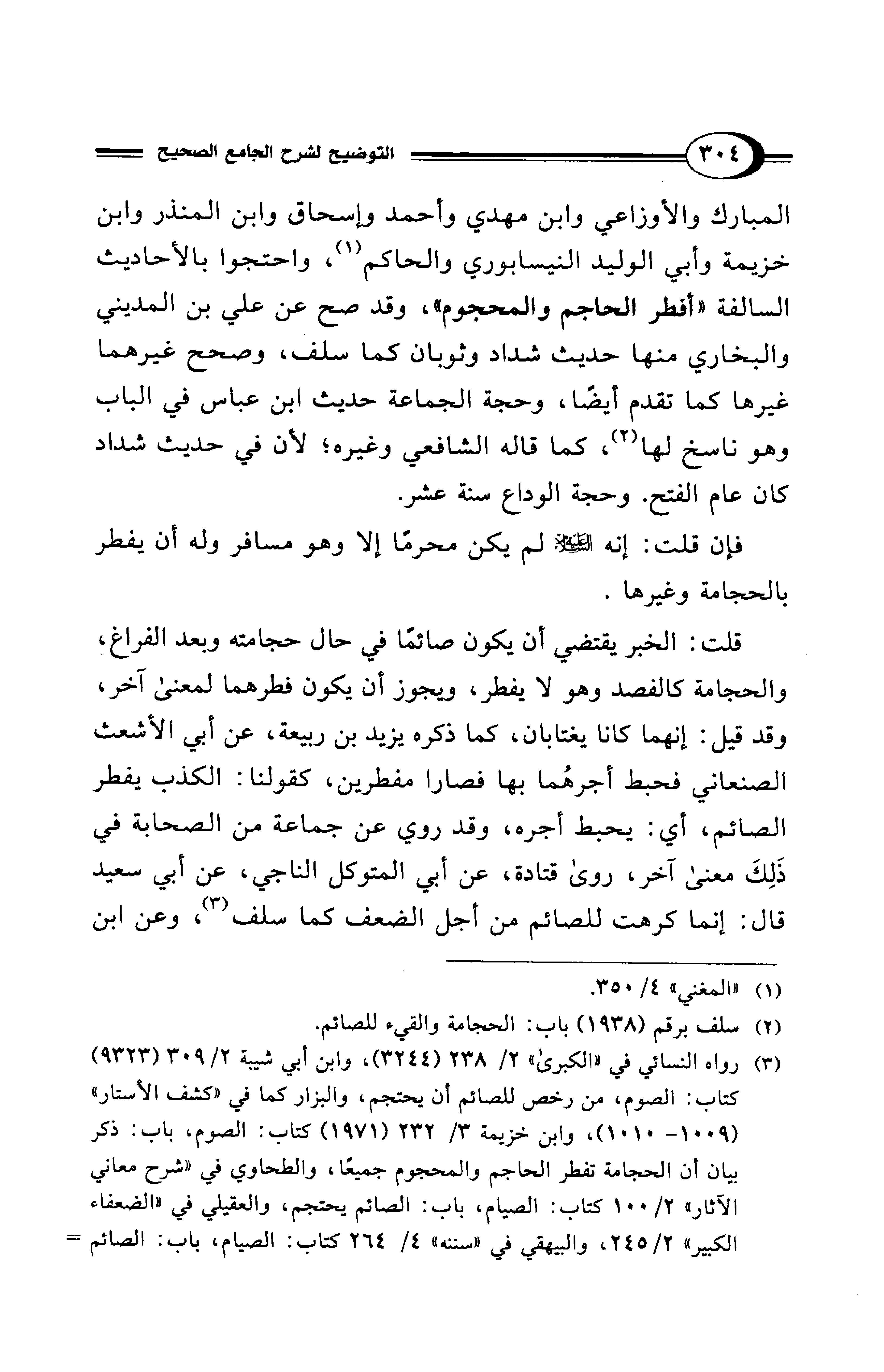 المبارك والأوزاعي وابن مهدي وأحمد وإسحاق وابن المنذر وابن خزيمة وأبي الوليد النيسابوري والحاكم (¬1)، واحتجوا بالأحاديث السالفة "أفطر الحاجم والمحجوم"، وقد صح عن علي بن المديني والبخاري منها حديث شداد وثوبان كما سلف، وصحح غيرهما غيرها كما تقدم أيضًا، وحجة الجماعة حديث ابن عباس في الباب وهو ناسخ لها (¬2)، كما قاله الشافعي وغيره؛ لأن في حديث شداد كان عام الفتح. وحجة الوداع سنة عشر.