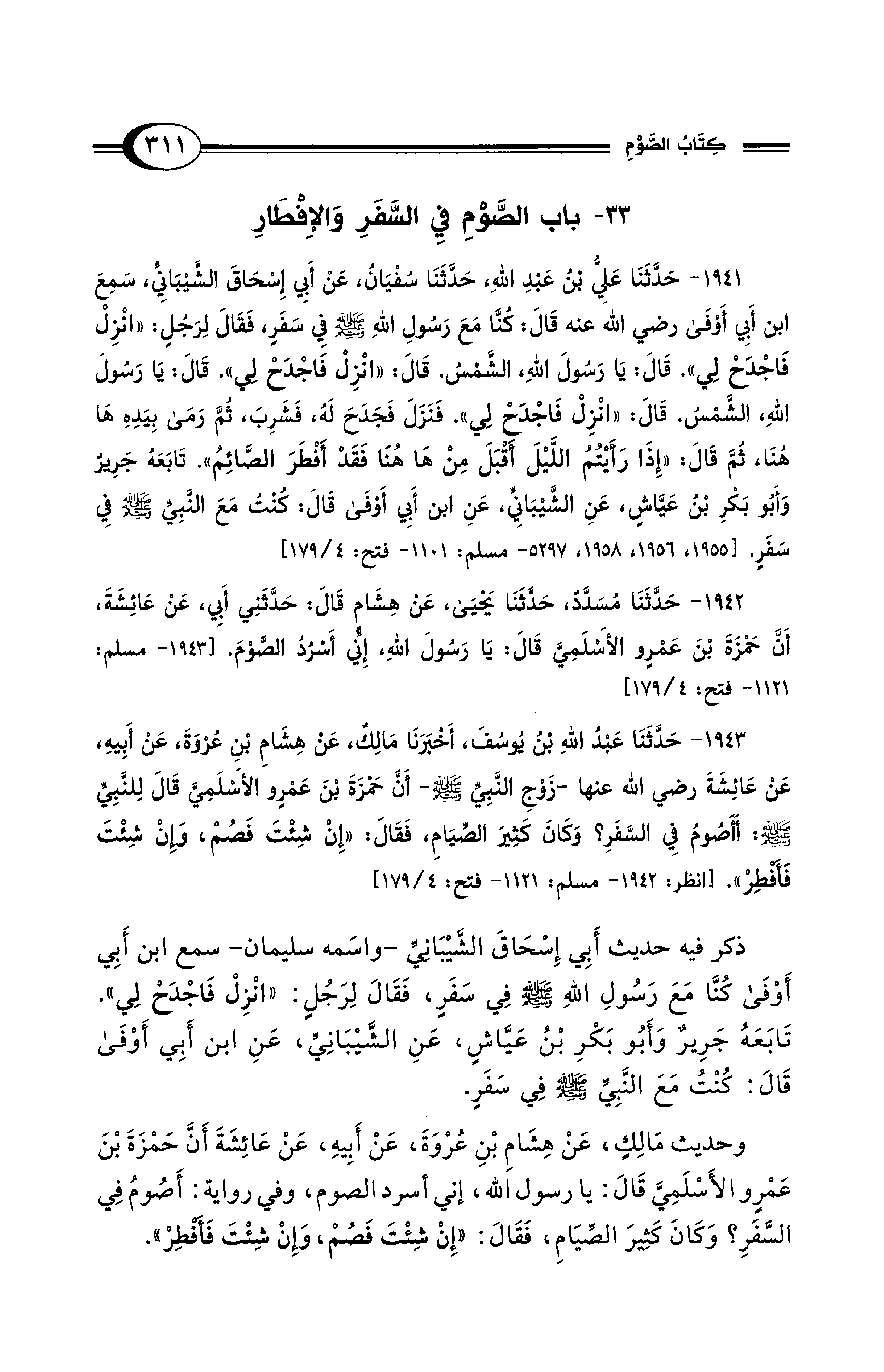 1943 - حَدَّثَنَا عَبْدُ اللهِ بْنُ يُوسُفَ، أَخْبَرَنَا مَالِكٌ، عَنْ هِشَامِ بْنِ عُرْوَةَ، عَنْ أَبِيهِ، عَنْ عَائِشَةَ رضي الله عنها -زَوْجِ النَّبِيِّ - صلى الله عليه وسلم -- أَنَّ حَمْزَةَ بْنَ عَمْرٍو الأَسْلَمِيَّ قَالَ لِلنَّبِيِّ - صلى الله عليه وسلم -: أَأَصُومُ فِي السَّفَرِ؟ وَكَانَ كَثِيرَ الصِّيَامِ، فَقَالَ: "إِنْ شِئْتَ فَصُمْ، وَإِنْ شِئْتَ فَأَفْطِرْ". [انظر: 1942 - مسلم: 1121 - فتح: 4/ 179]