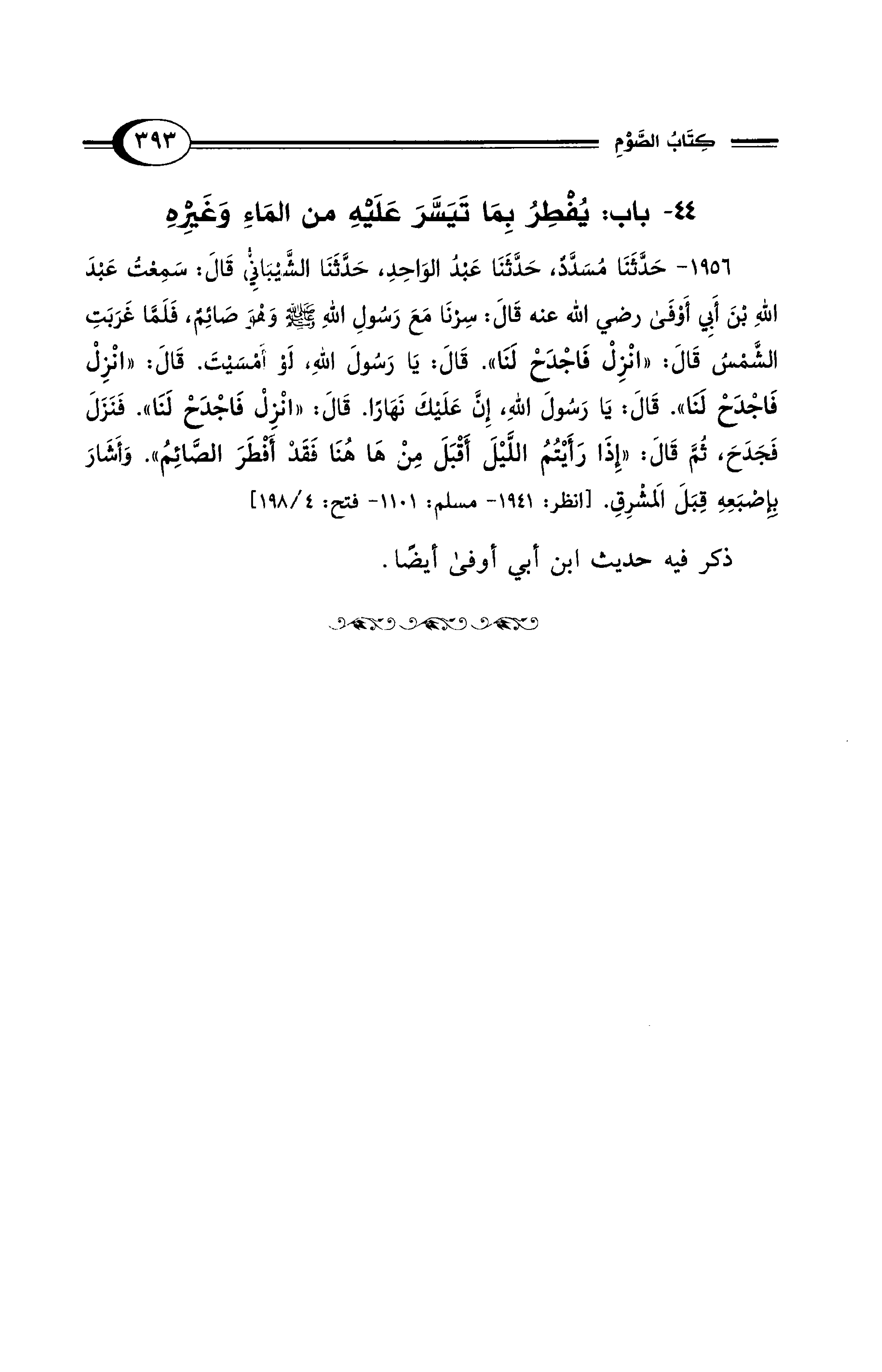 1956 - حَدَّثَنَا مُسَدَّدٌ، حَدَّثَنَا عَبْدُ الوَاحِدِ حَدَّثَنَا الشَّيْبَانِيُّ قَالَ: سَمِعْتُ عَبْدَ اللهِ بْنَ أَبِي أَوْفَى رضي الله عنه قَالَ: سِرْنَا مَعَ رَسُولِ اللهِ - صلى الله عليه وسلم - وَهْوَ صَائِمٌ، فَلَمَّا غَرَبَتِ الشَّمْسُ قَالَ: "انْزِلْ فَاجْدَحْ لَنَا". قَالَ: يَا رَسُولَ اللهِ، لَوْ أَمْسَيْتَ. قَالَ: "انْزِلْ فَاجْدَحْ لَنَا". قَالَ: يَا رَسُولَ اللهِ، إِنَّ عَلَيْكَ نَهَارًا. قَالَ: "انْزِلْ فَاجْدَحْ لَنَا". فَنَزَلَ فَجَدَحَ، ثُمَّ قَالَ: "إِذَا رَأَيْتُمُ اللَّيْلَ أَقْبَلَ مِنْ هَا هُنَا فَقَدْ أَفْطَرَ الصَّائِمُ". وَأَشَارَ بِإِصْبَعِهِ قِبَلَ المَشْرِقِ. [انظر: 1941 - مسلم: 1101 - فتح: 4/ 198]