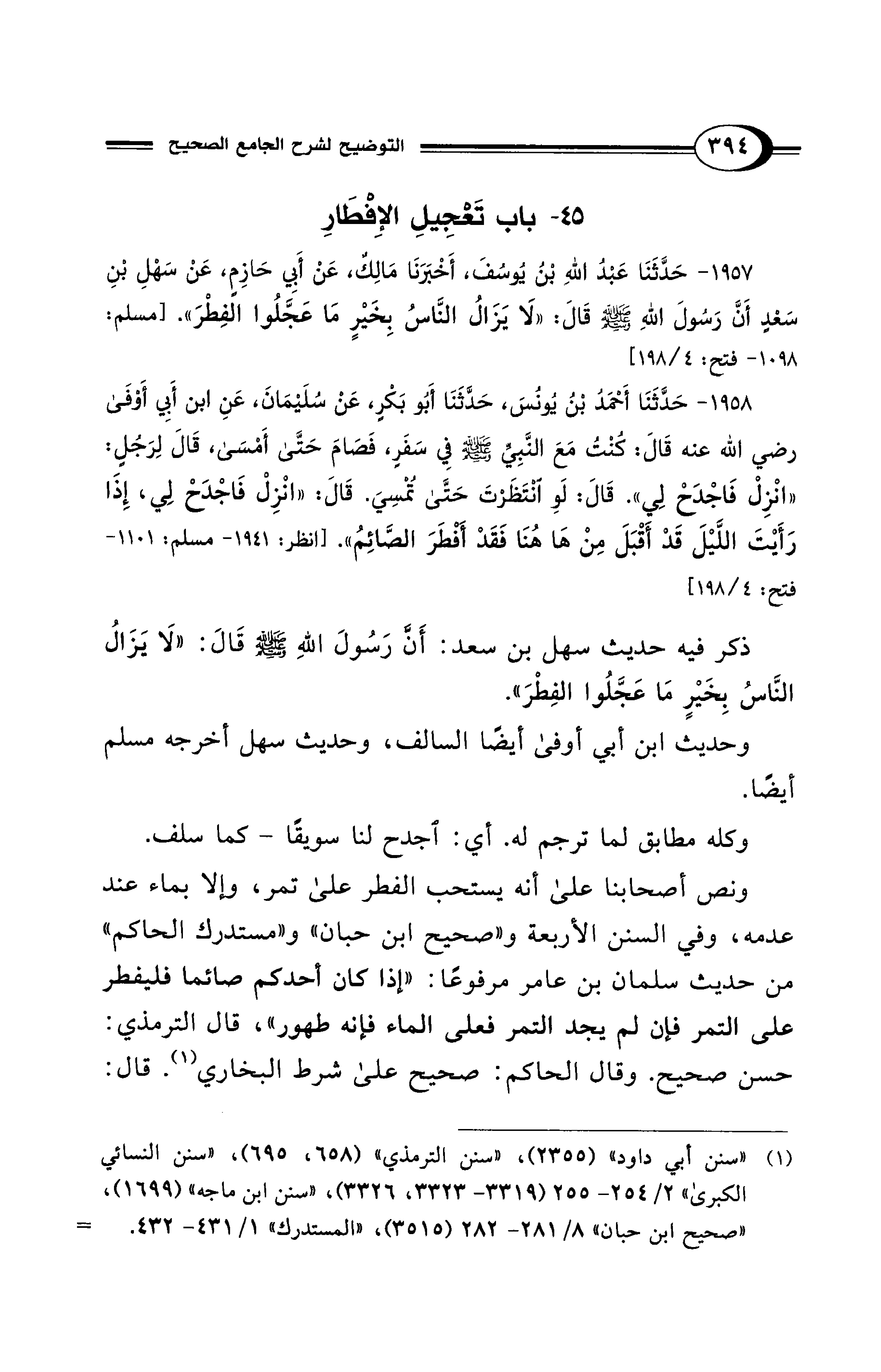 1957 - حَدَّثَنَا عَبْدُ اللهِ بْنُ يُوسُفَ، أَخْبَرَنَا مَالِكٌ، عَنْ أَبِي حَازِمٍ، عَنْ سَهْلِ بْنِ سَعْدٍ أَنَّ رَسُولَ اللهِ - صلى الله عليه وسلم - قَالَ: "لَا يَزَالُ النَّاسُ بِخَيْرٍ مَا عَجَّلُوا الفِطْرَ". [مسلم: 1098 - فتح: 4/ 198]