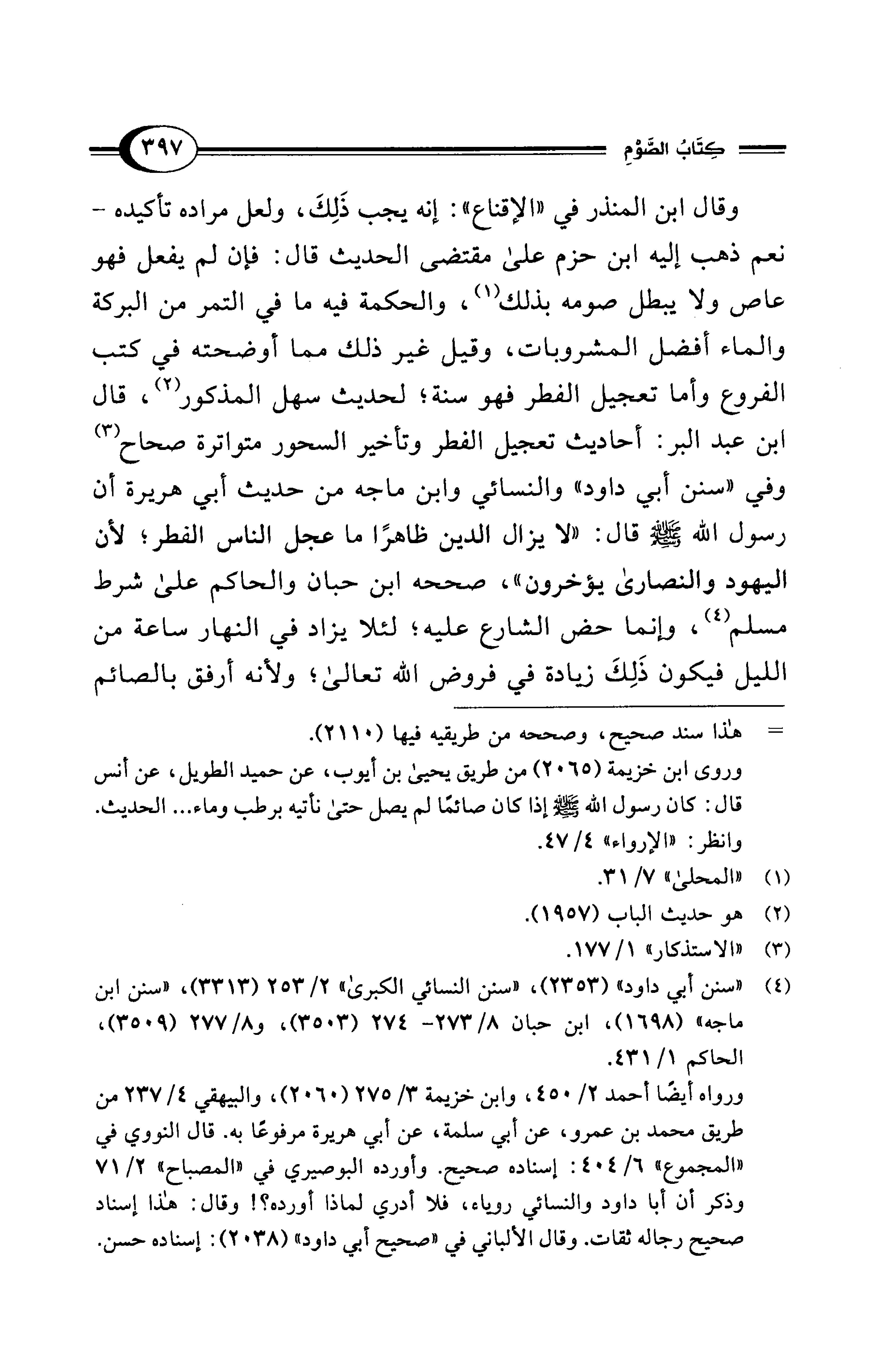 وقال ابن المنذر في "الإقناع": إنه يجب ذَلِكَ، ولعل مراده تأكيده- نعم ذهب إليه ابن حزم على مقتضى الحديث قال: فإن لم يفعل فهو عاص ولا يبطل صومه بذلك (¬1)، والحكمة فيه ما في التمر من البركة والماء أفضل المشروبات، وقيل غير ذلك مما أوضحته في كتب الفروع وأما تعجيل الفطر فهو سنة؛ لحديث سهل المذكور (¬2)، قال ابن عبد البر: أحاديث تعجيل الفطر وتأخير السحور متواترة صحاح (¬3) وفي "سنن أبي داود" والنسائي وابن ماجه من حديث أبي هريرة أن رسول الله - صلى الله عليه وسلم - قال: "لا يزال الدين ظاهرًا ما عجل الناس الفطر؛ لأن اليهود والنصارى يؤخرون"، صححه ابن حبان والحاكم على شرط مسلم (¬4)، وإنما حض الشارع عليه؛ لئلا يزاد في النهار ساعة من الليل فيكون ذَلِكَ زيادة في فروض الله تعالى؛ ولأنه أرفق بالصائم