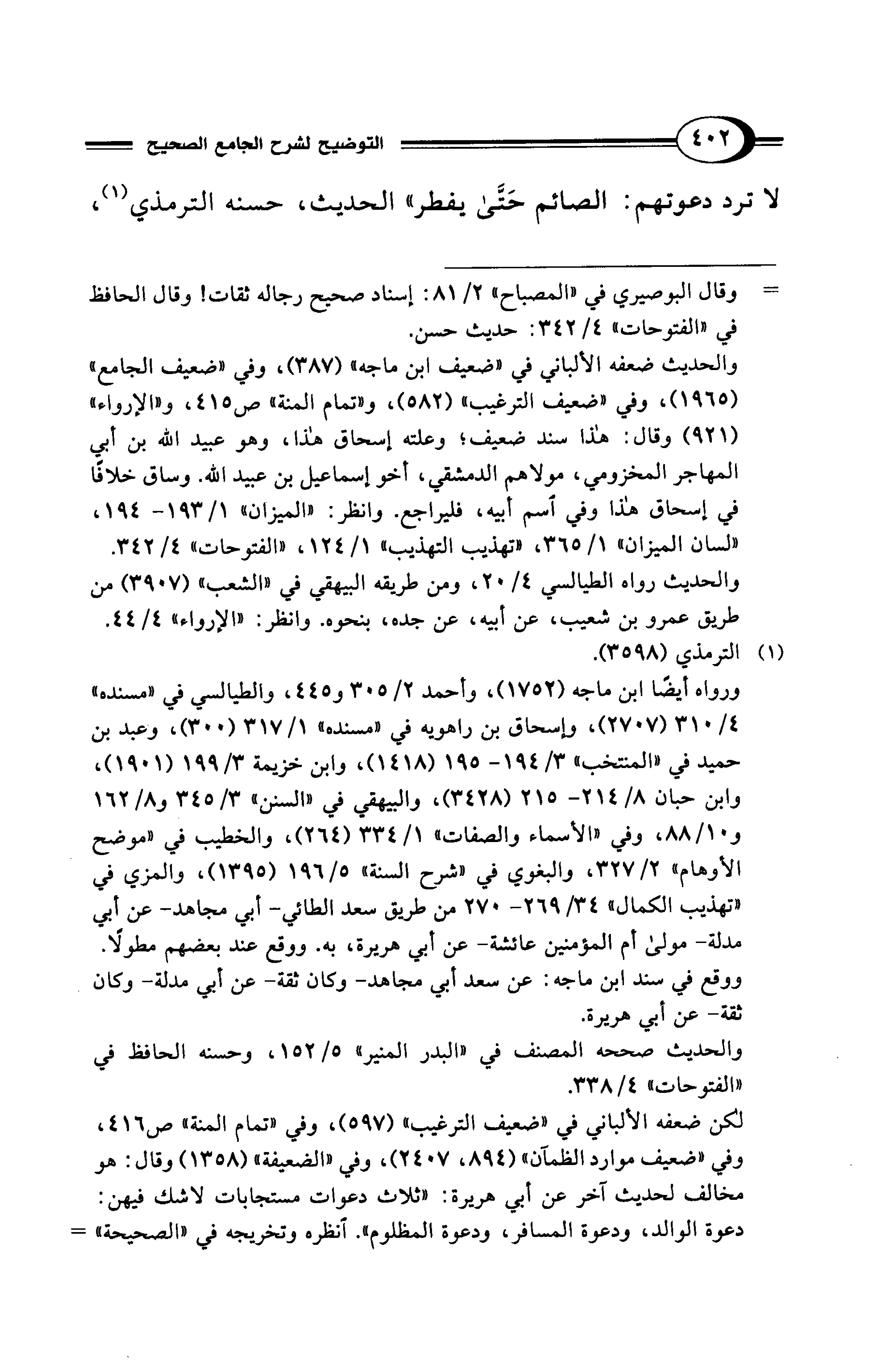ترد دعوتهم: الصائم حَتَّى يفطر" الحديث، حسنه الترمذي (¬1)،