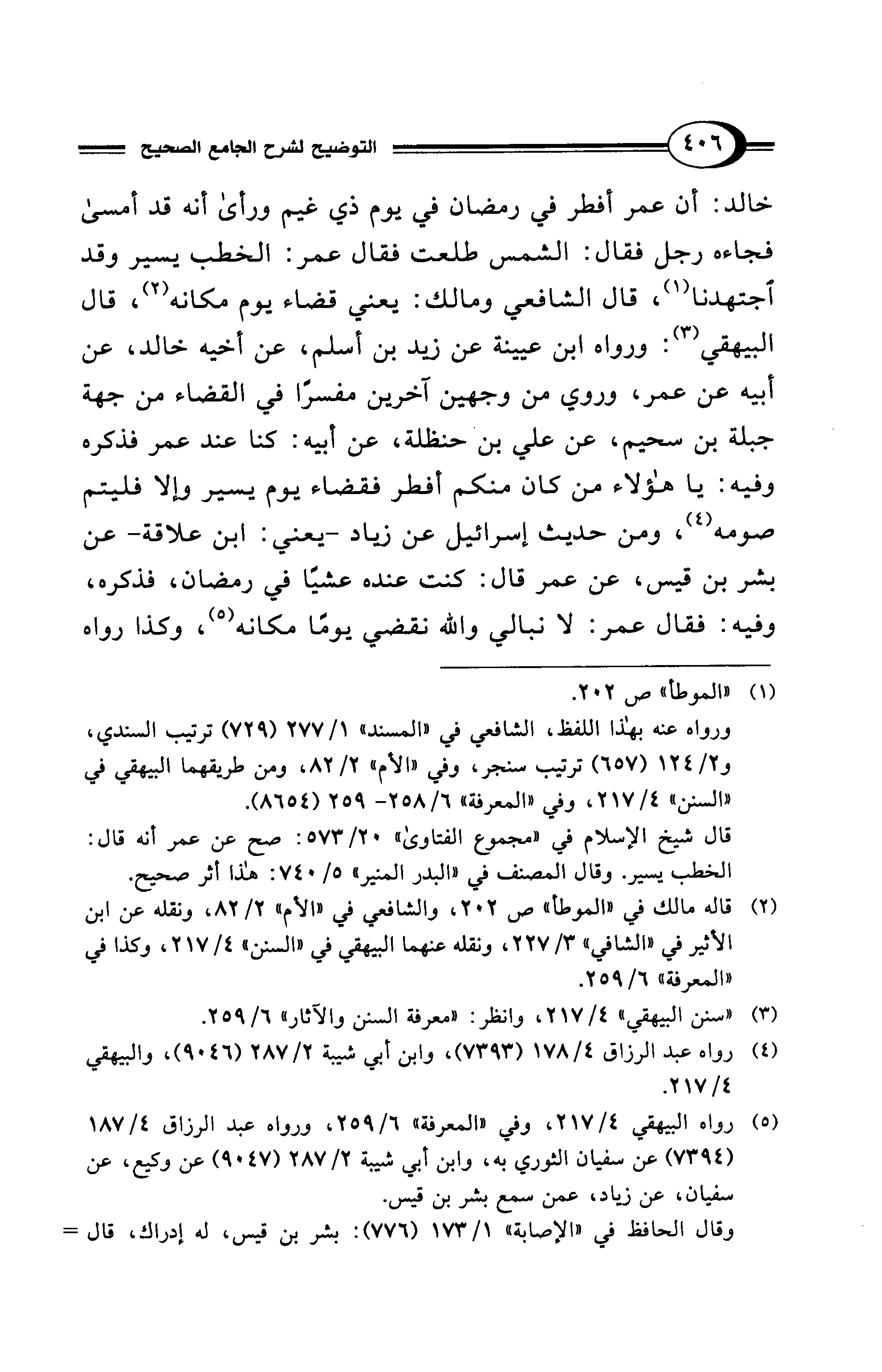 خالد: أن عمر أفطر في رمضان في يوم ذي غيم ورأى أنه قد أمسى فجاءه رجل فقال: الشمس طلعت فقال عمر: الخطب يسير وقد اجتهدنا (¬1)، قال الشافعي ومالك: يعني قضاء يوم مكانه (¬2)، قال البيهقي (¬3): ورواه ابن عيينة عن زيد بن أسلم، عن أخيه خالد، عن أبيه عن عمر، وروي من وجهين آخرين مفسرًا في القضاء من جهة جبلة بن سحيم، عن علي بن حنظلة، عن أبيه: كنا عند عمر فذكره وفيه: يا هؤلاء من كان منكم أفطر فقضاء يوم يسير وإلا فليتم صومه (¬4)، ومن حديث إسرائيل عن زياد -يعني: ابن علاقة- عن بشر بن قيس، عن عمر قال: كنت عنده عشيًا في رمضان، فذكره، وفيه: فقال عمر: لا نبالي والله نقضي يومًا مكانه (¬5)، وكذا رواه