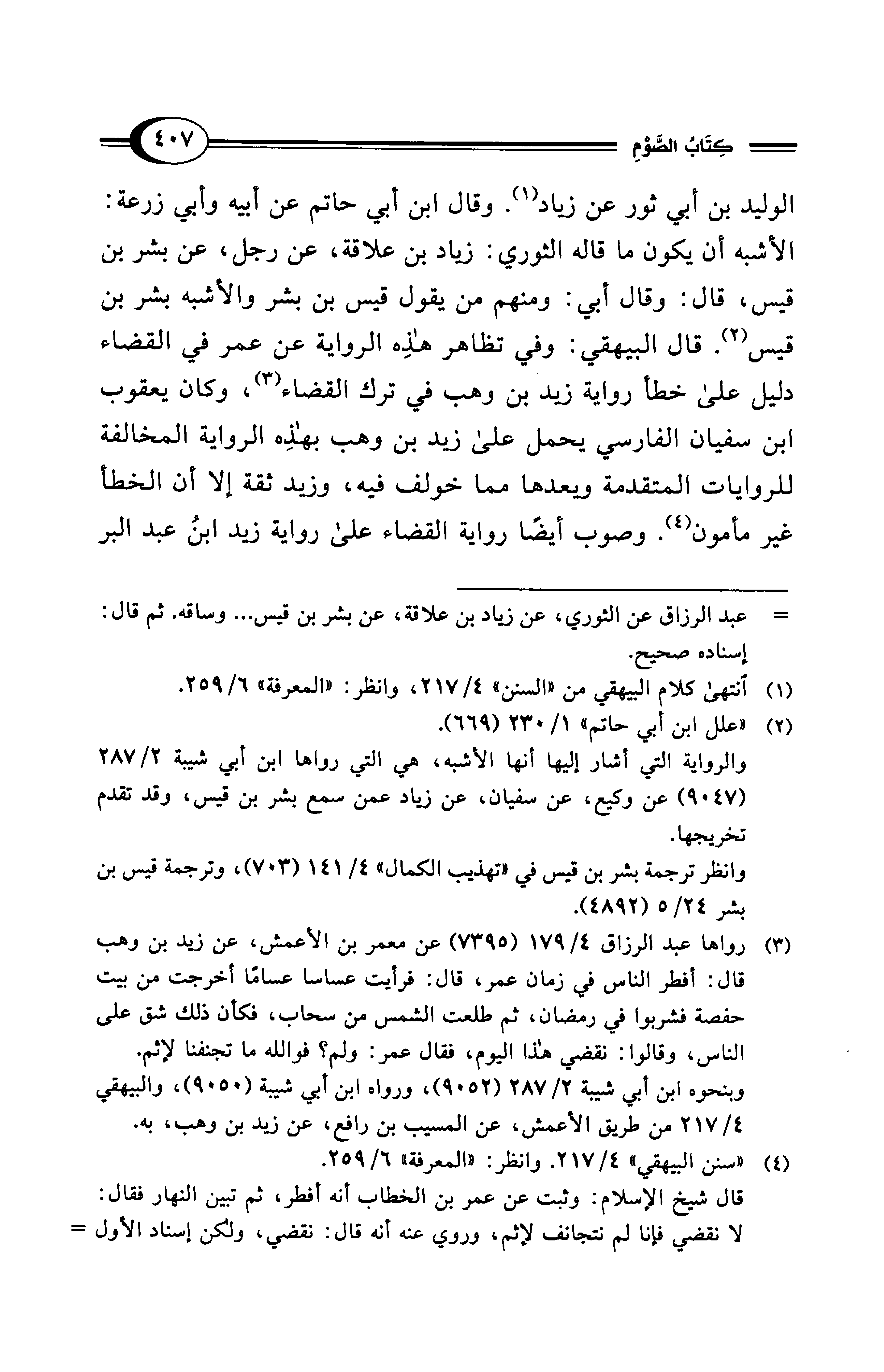 الوليد بن أبي ثور عن زياد (¬1). وقال ابن أبي حاتم عن أبيه وأبي زرعة: الأشبه أن يكون ما قاله الثوري: زياد بن علاقة، عن رجل، عن بشر بن قيس، قال: وقال أبي: ومنهم من يقول قيس بن بشر والأشبه بشر بن قيس (¬2). قال البيهقي: وفي تظاهر هذِه الرواية عن عمر في القضاء دليل على خطأ رواية زيد بن وهب في ترك القضاء (¬3)، وكان يعقوب ابن سفيان الفارسي يحمل على زيد بن وهب بهذِه الرواية المخالفة للروايات المتقدمة ويعدها مما خولف فيه، وزيد ثقة إلا أن الخطأ غير مأمون (¬4). وصوب أيضًا رواية القضاء على رواية زيد ابنُ عبد البر