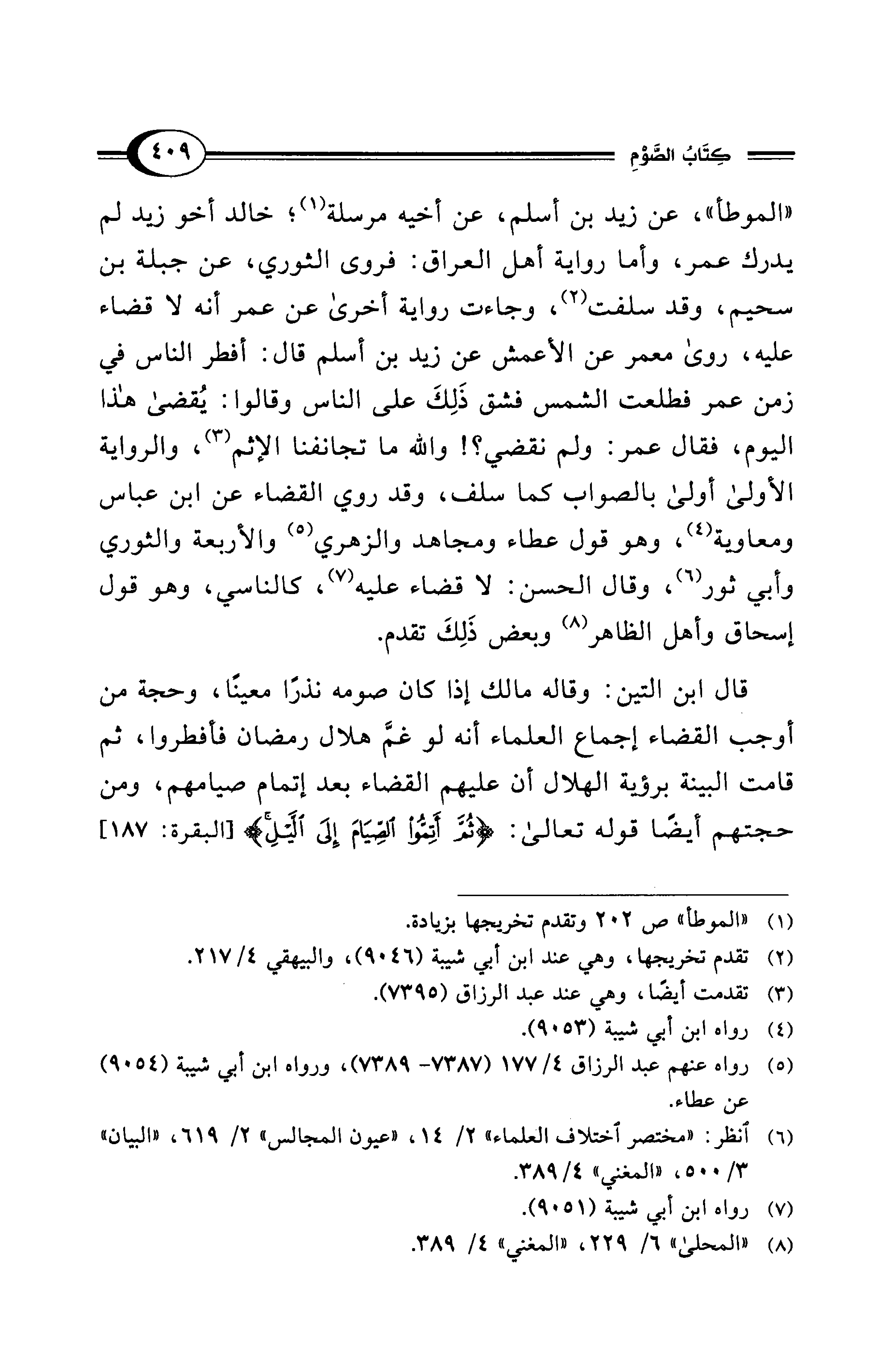 "الموطأ"، عن زيد بن أسلم، عن أخيه مرسلة (¬1)؛ خالد أخو زيد لم يدرك عمر، وأما رواية أهل العراق: فروى الثوري، عن جبلة بن سحيم، وقد سلفت (¬2)، وجاءت رواية أخرى عن عمر أنه لا قضاء عليه، روى معمر عن الأعمش عن زيد بن أسلم قال: أفطر الناس في زمن عمر فطلعت الشمس فشق ذَلِكَ على الناس وقالوا: يُقضى هذا اليوم، فقال عمر: ولم نقضي؟! والله ما تجانفنا الإثم (¬3)، والرواية الأولى أولى بالصواب كما سلف، وقد روي القضاء عن ابن عباس ومعاوية (¬4)، وهو قول عطاء ومجاهد والزهري (¬5) والأربعة والثوري وأبي ثور (¬6)، وقال الحسن: لا قضاء عليه (¬7)، كالناسي، وهو قول إسحاق وأهل الظاهر (¬8) وبعض ذَلِكَ تقدم.