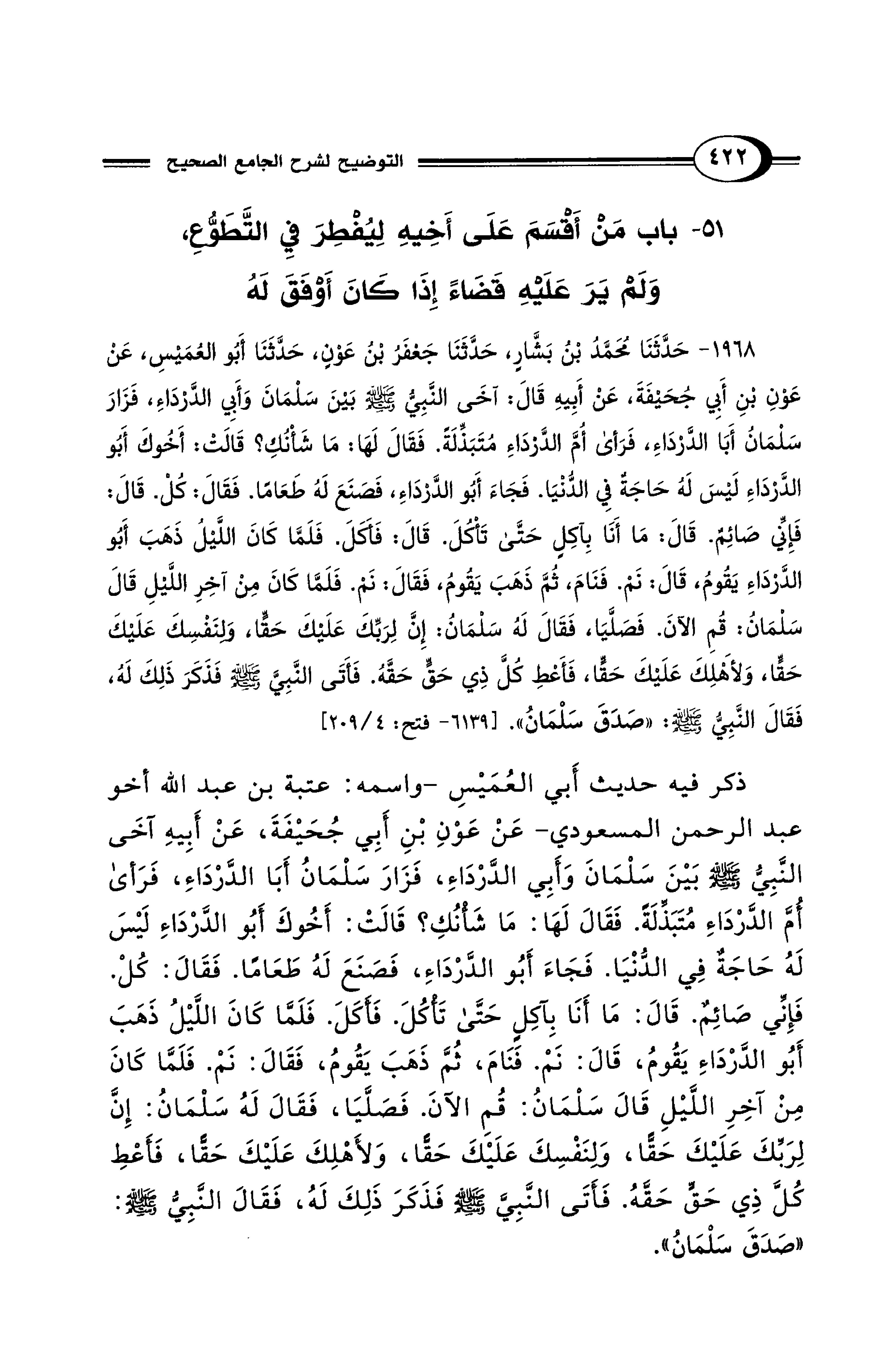 ذكر فيه حديث أَبي العُمَيْسِ -واسمه: عتبة بن عبد الله أخو عبد الرحمن المسعودي- عَنْ عَوْنِ بْنِ أَبِي جُحَيْفَةَ، عَنْ أَبِيهِ قَالَ: آخَى النَّبِيُّ - صلى الله عليه وسلم - بَيْنَ سَلْمَانَ وَأَبِي الدَّرْدَاءِ، فَزَارَ سَلْمَانُ أَبَا الدَّرْدَاءِ، فَرَأَى أُمَّ الدَّرْدَاءِ مُتَبَذِّلَةً. فَقَالَ لَهَا: مَا شَأْنُكِ؟ قَالَتْ: أَخُوكَ أَبُو الدَّرْدَاءِ لَيْسَ لَهُ حَاجَةٌ فِي الدُّنْيَا. فَجَاءَ أَبُو الدَّرْدَاءِ، فَصَنَعَ لَهُ طَعَامًا. فَقَالَ: كُلْ. قَالَ: فَإِنِّي صَائِمٌ. قَالَ: مَا أَنَا بِآكِلٍ حَتَّى تَأْكُلَ. قَالَ: فَأَكَلَ. فَلَمَّا كَانَ اللَّيْلُ ذَهَبَ أَبُو الدَّرْدَاءِ يَقُومُ، قَالَ: نَمْ. فَنَامَ، ثُمَّ ذَهَبَ يَقُومُ. فَقَالَ: نَمْ. فَلَمَّا كَانَ مِنْ آخِرِ اللَّيْلِ قَالَ سَلْمَانُ: قُمِ الآنَ. فَصَلَّيَا، فَقَالَ لَهُ سَلْمَانُ: إِنَّ لِرَبِّكَ عَلَيْكَ حَقًّا، وَلِنَفْسِكَ عَلَيْكَ حَقًّا، وَلأَهْلِكَ عَلَيْكَ حَقًّا، فَأَعْطِ كُلَّ ذِي حَقٍّ حَقَّهُ. فَأَتَى النَّبِيَّ - صلى الله عليه وسلم - فَذَكَرَ ذَلِكَ لَهُ، فَقَالَ النَّبِيُّ - صلى الله عليه وسلم - "صَدَقَ سَلْمَانُ".
