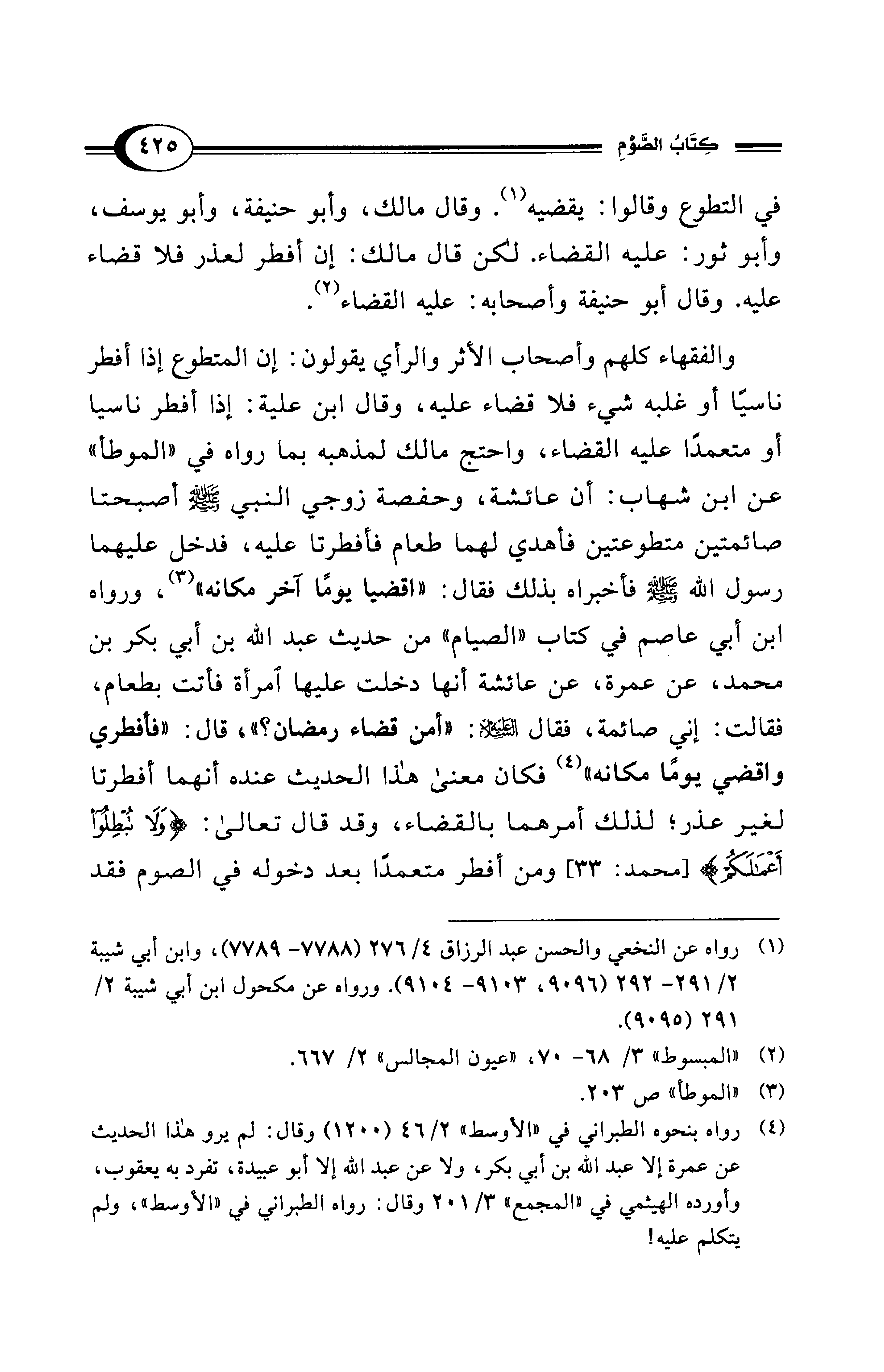 في التطوع وقالوا: يقضيه (¬1). وقال مالك، وأبو حنيفة، وأبو يوسف، وأبو ثور: عليه القضاء. لكن قال مالك: إن أفطر لعذر فلا قضاء عليه. وقال أبو حنيفة وأصحابه: عليه القضاء (¬2).