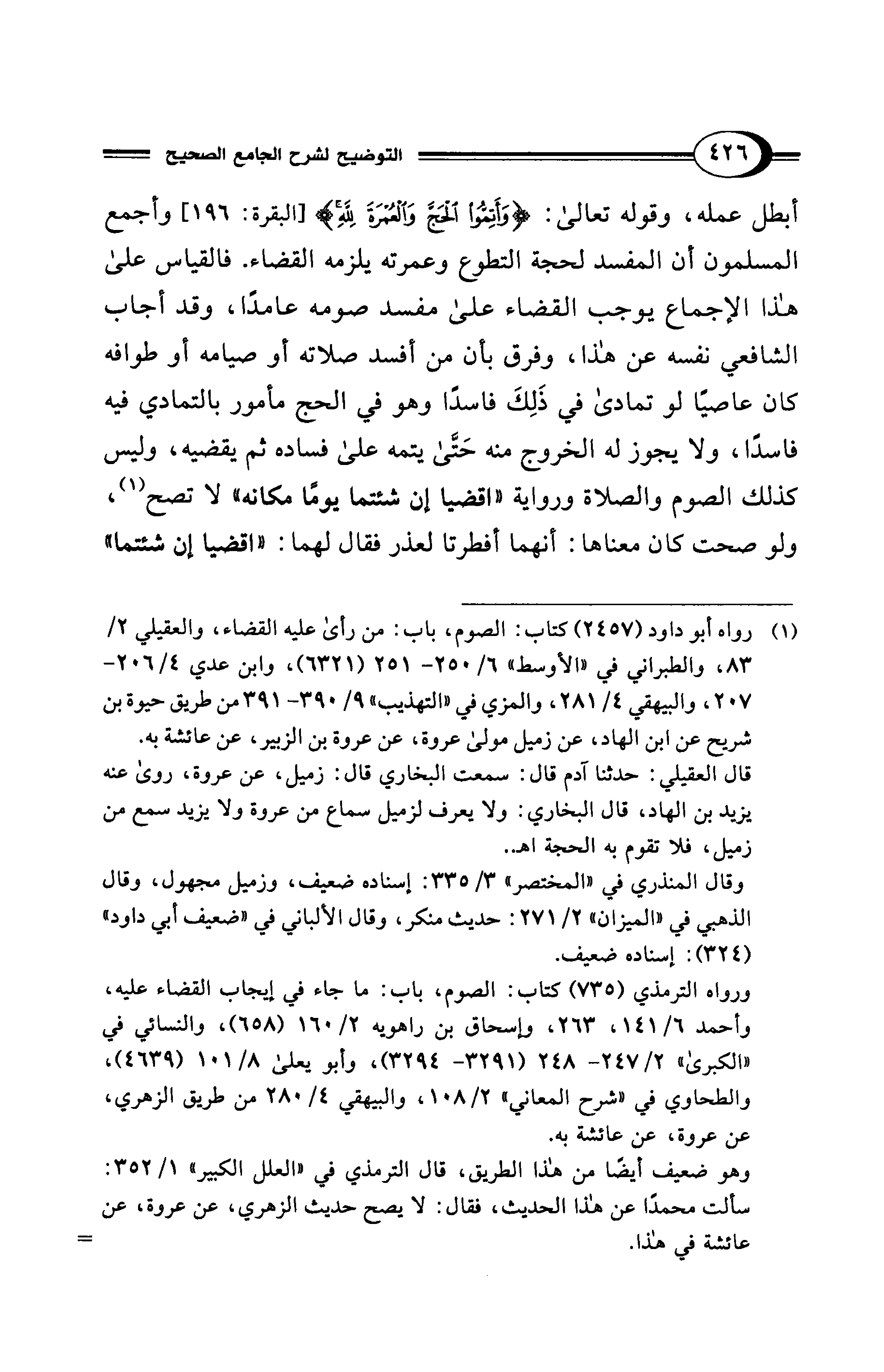 (¬1) رواه أبو داود (2457) كتاب: الصوم، باب: من رأى عليه القضاء، والعقيلي 2/ 83، والطبراني في "الأوسط" 6/ 250 - 251 (6321)، وابن عدي 4/ 206 - 207، والبيهقي 4/ 281، والمزي في "التهذيب" 9/ 390 - 391 من طريق حيوة بن شريح عن ابن الهاد، عن زميل مولى عروة، عن عروة بن الزبير، عن عائشة به.