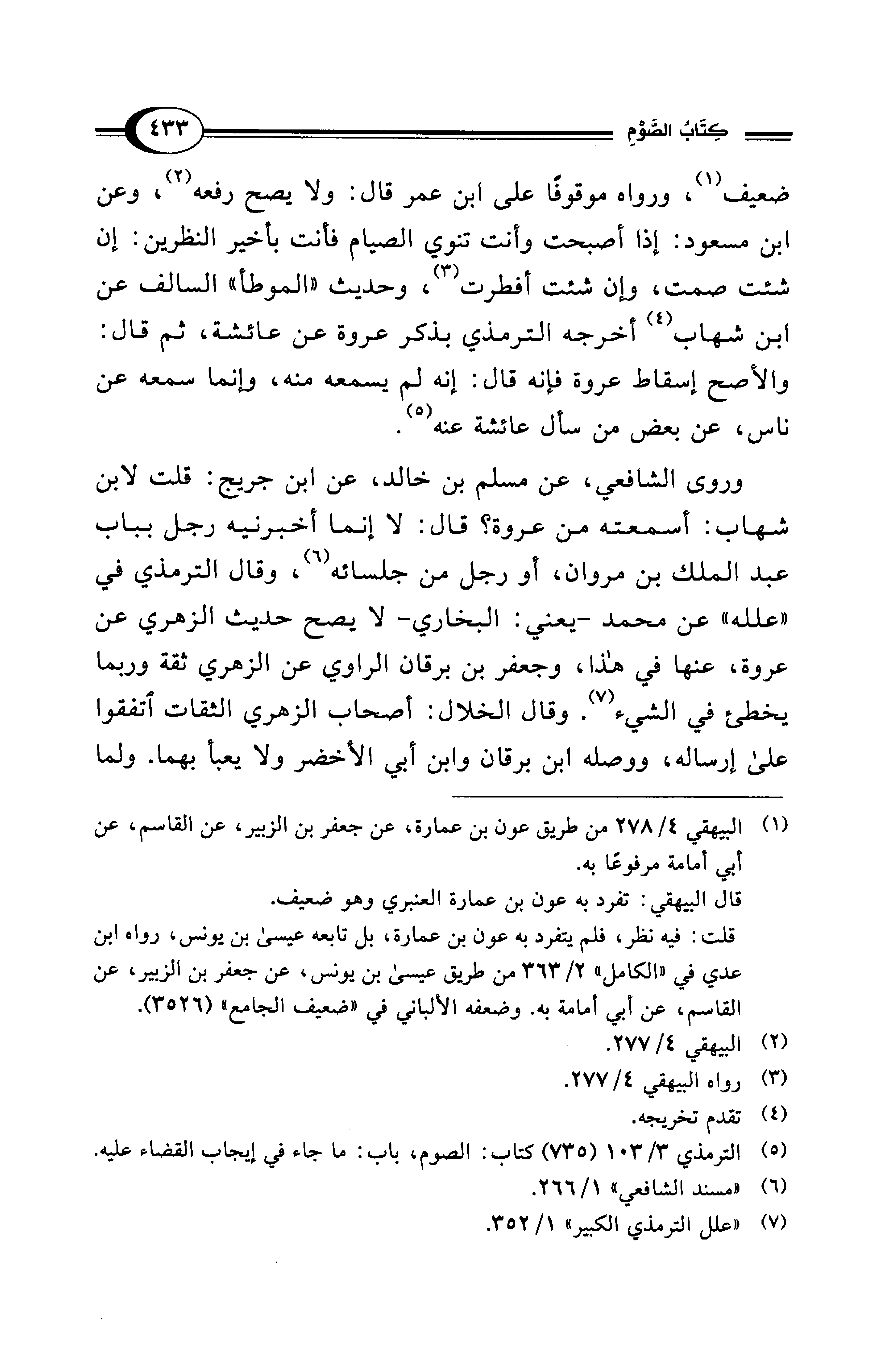 ضعيف (¬1)، ورواه موقوفًا على ابن عمر قال: ولا يصح رفعه (¬2)، وعن ابن مسعود: إذا أصبحت وأنت تنوي الصيام فأنت بأخير النظرين: إن شئت صمت، وإن شئت أفطرت (¬3)، وحديث "الموطأ" السالف عن ابن شهاب (¬4) أخرجه الترمذي بذكر عروة عن عائشة، ثم قال: والأصح إسقاط عروة فإنه قال: إنه لم يسمعه منه، وإنما سمعه عن ناس، عن بعض من سأل عائشة عنه (¬5).