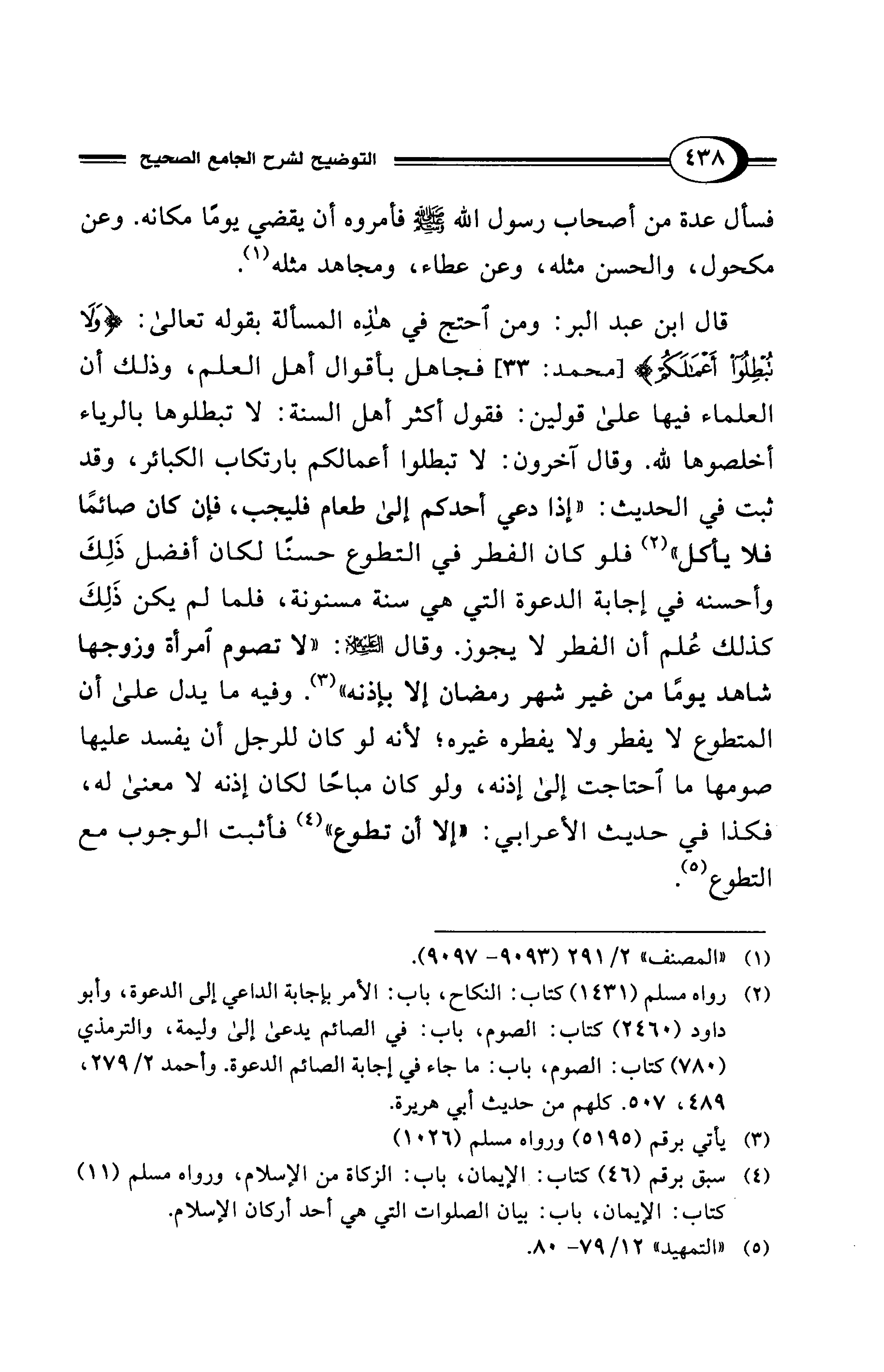 قال ابن عبد البر: ومن احتج في هذِه المسالة بقوله تعالى: {وَلَا تُبْطِلُوا أَعْمَالَكُمْ} [محمد: 33] فجاهل بأقوال أهل العلم، وذلك أن العلماء فيها على قولين: فقول أكثر أهل السنة: لا تبطلوها بالرياء أخلصوها لله. وقال آخرون: لا تبطلوا أعمالكم بارتكاب الكبائر، وقد ثبت في الحديث: "إذا دعي أحدكم إلى طعام فليجب، فإن كان صائمًا فلا يأكل" (¬2) فلو كان الفطر في التطوع حسنًا لكان أفضل ذَلِكَ وأحسنه في إجابة الدعوة التي هي سنة مسنونة، فلما لم يكن ذَلِكَ كذلك عُلم أن الفطر لا يجوز. وقال - عليه السلام -: "لا تصوم امرأة وزوجها شاهد يومًا من غير شهر رمضان إلا بإذنه" (¬3). وفيه ما يدل على أن المتطوع لا يفطر ولا يفطره غيره؛ لأنه لو كان للرجل أن يفسد عليها صومها ما احتاجت إلى إذنه، ولو كان مباحًا لكان إذنه لا معنى له، فكذا في حديث الأعرابي: "إلا أن تطوع" (¬4) فأثبت الوجوب مع التطوع (¬5).