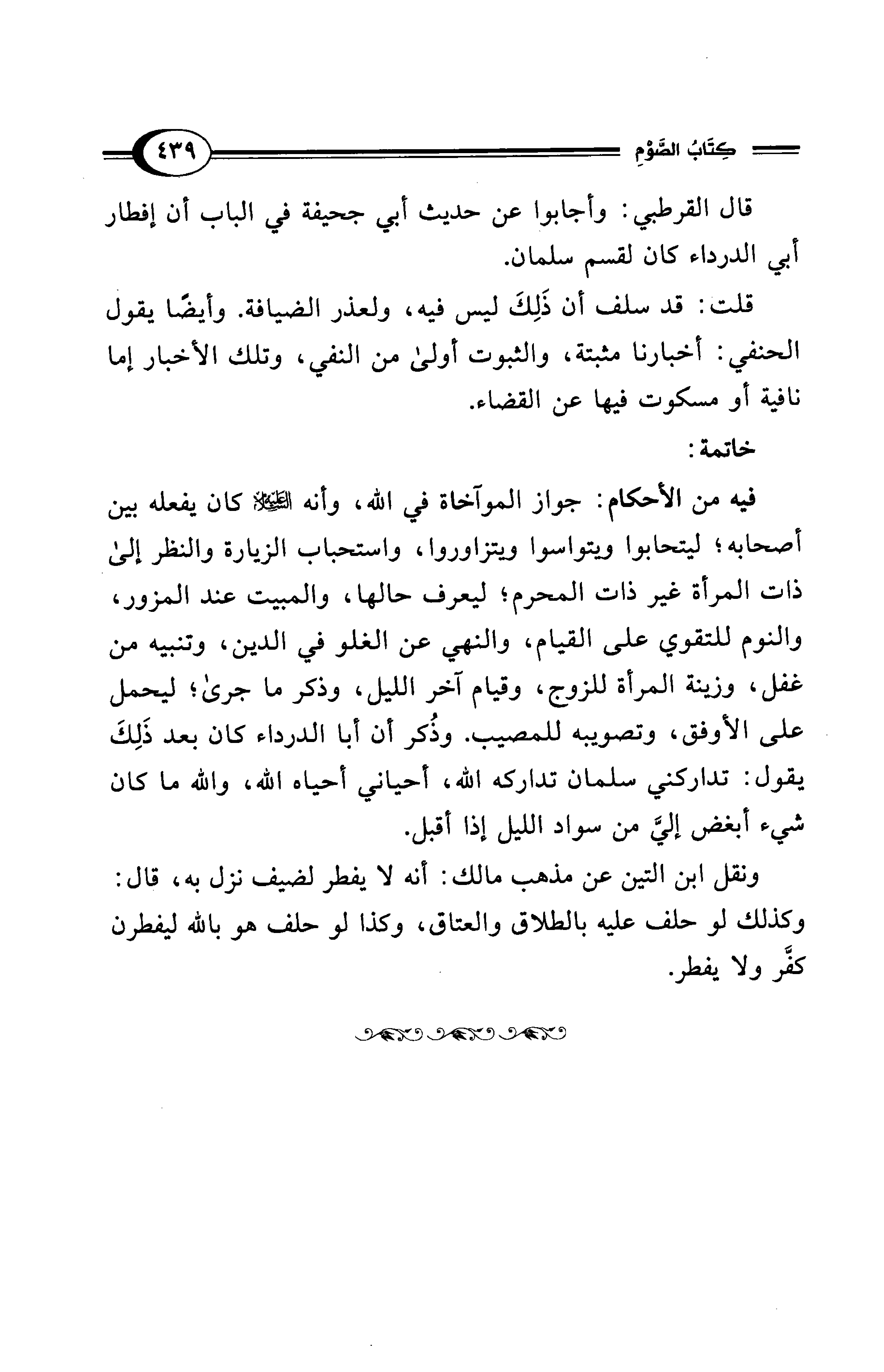 قال القرطبي: وأجابوا عن حديث أبي جحيفة في الباب أن إفطار أبي الدرداء كان لقسم سلمان.