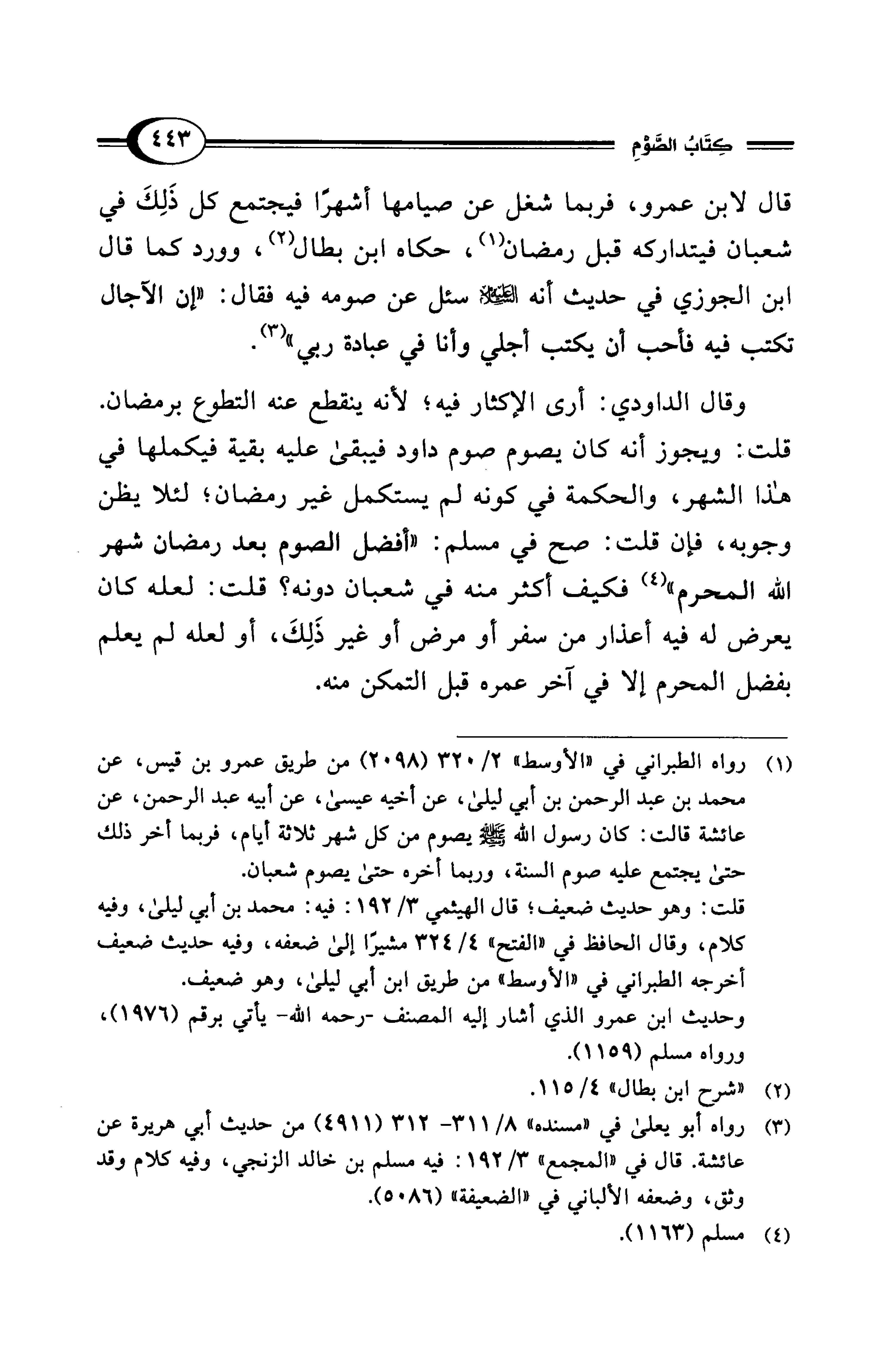 (¬1) رواه الطبراني في "الأوسط" 2/ 320 (2098) من طريق عمرو بن قيس، عن محمد بن عبد الرحمن بن أبي ليلى، عن أخيه عيسى، عن أبيه عبد الرحمن، عن عائشة قالت: كان رسول الله - صلى الله عليه وسلم - يصوم من كل شهر ثلاثة أيام، فربما أخر ذلك حتى يجتمع عليه صوم السنة، وربما أخره حتى يصوم شعبان.