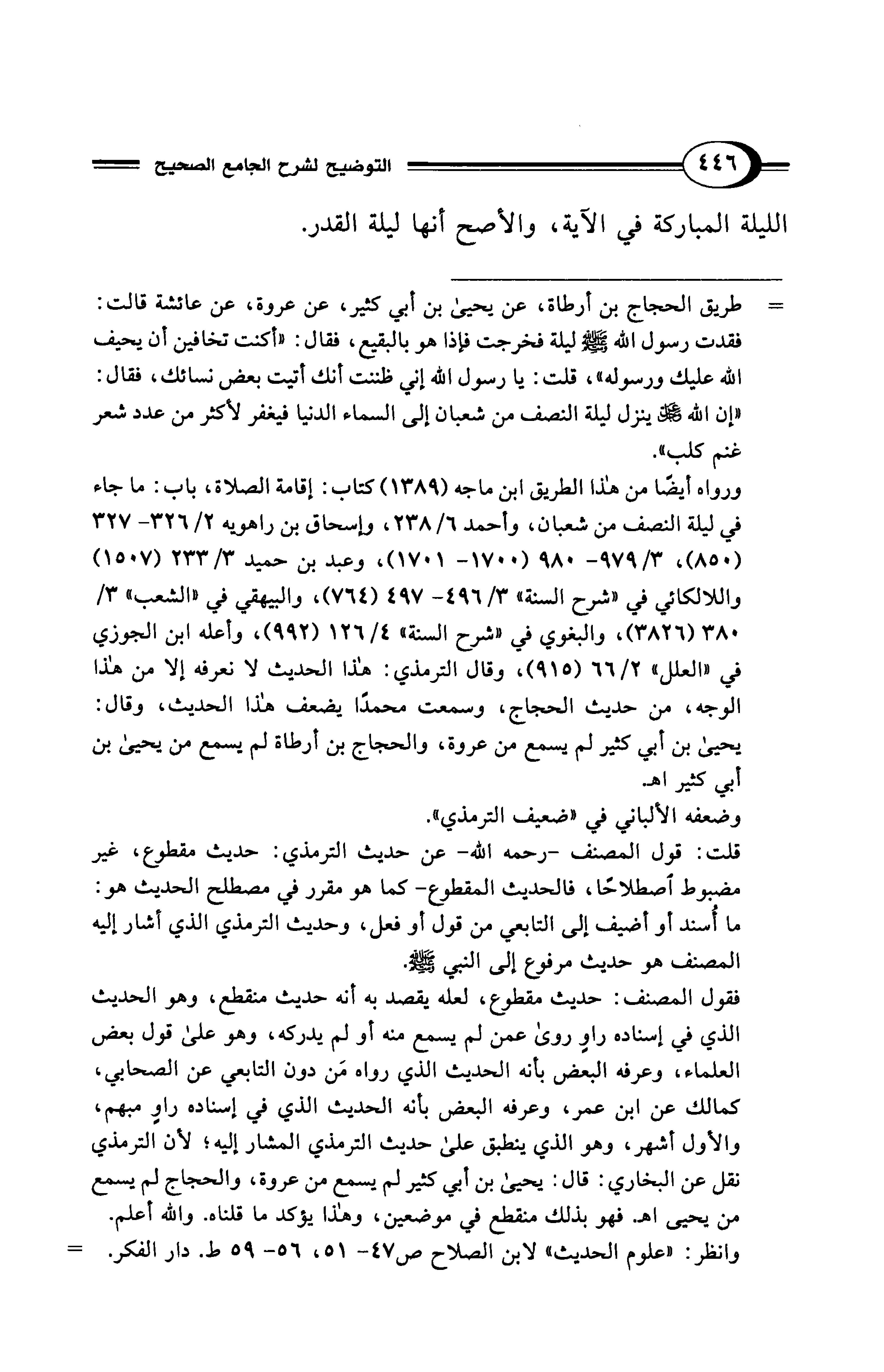 ورواه أيضًا من هذا الطريق ابن ماجه (1389) كتاب: إقامة الصلاة، باب: ما جاء في ليلة النصف من شعبان، وأحمد 6/ 238، وإسحاق بن راهويه 2/ 326 - 327 (850)، 3/ 979 - 980 (1700 - 1701)، وعبد بن حميد 3/ 233 (1507) واللالكائي في "شرح السنة" 3/ 496 - 497 (764)، والبيهقي في "الشعب" 3/ 380 (3826)، والبغوي في "شرح السنة" 4/ 126 (992)، وأعله ابن الجوزي في "العلل" 2/ 66 (915)، وقال الترمذي: هذا الحديث لا نعرفه إلا من هذا الوجه، من حديث الحجاج، وسمعت محمدًا يضعف هذا الحديث، وقال: يحيى بن أبي كثير لم يسمع من عروة، والحجاج بن أرطاة لم يسمع من يحيى بن أبي كثير اهـ.