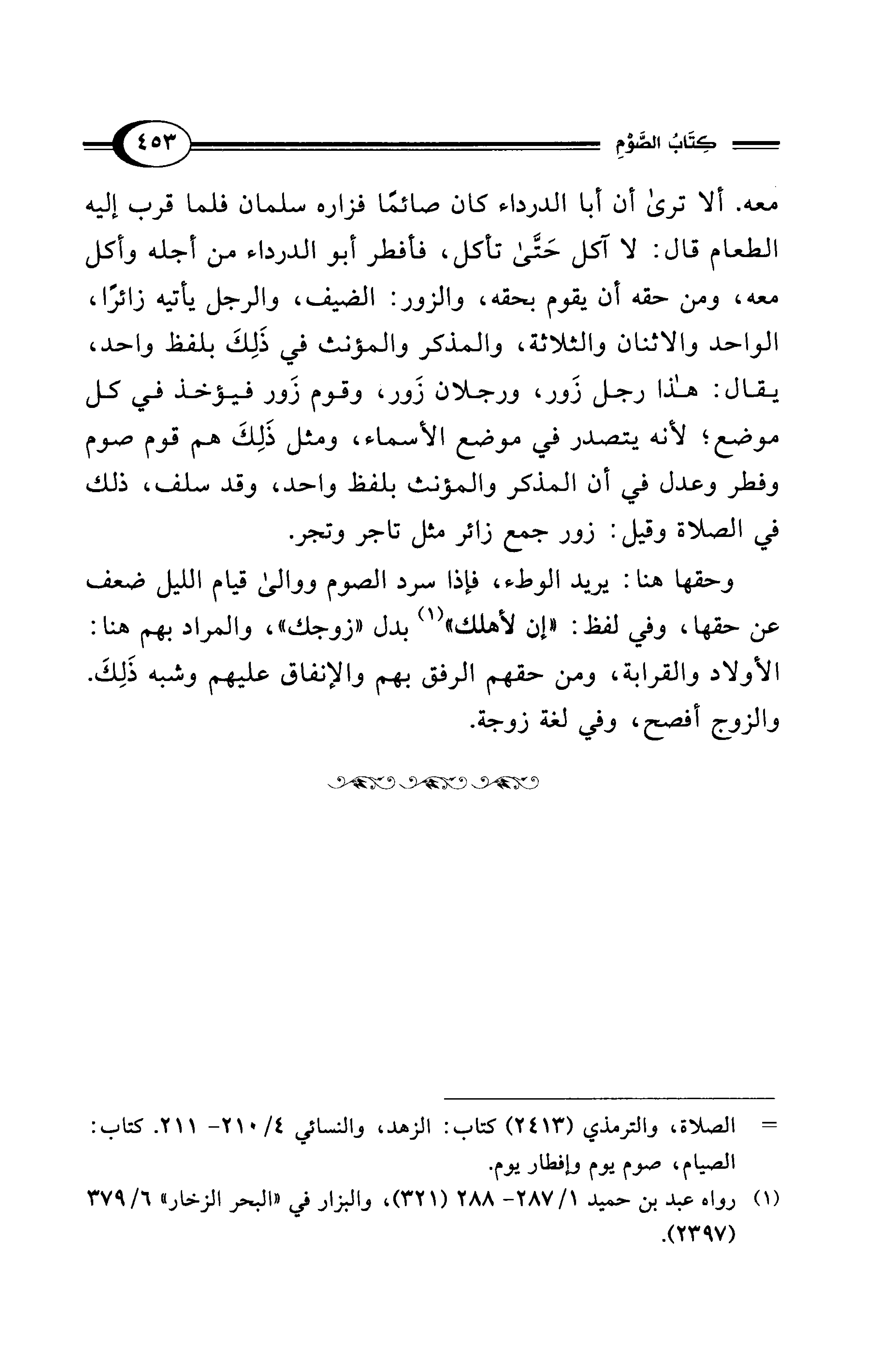 معه. ألا ترى أن أبا الدرداء كان صائمًا فزاره سلمان فلما قرب إليه الطعام قال: لا آكل حَتَّى تأكل، فأفطر أبو الدرداء من أجله وأكل معه، ومن حقه أن يقوم بحقه، والزور: الضيف، والرجل يأتيه زائرًا، الواحد والاثنان والثلاثة، والمذكر والمؤنث في ذَلِكَ بلفظ واحد، يقال: هذا رجل زَور، ورجلان زَور، وقوم زَور فيؤخذ في كل موضع؛ لأنه يتصدر في موضع الأسماء، ومثل ذَلِكَ هم قوم صوم وفطر وعدل في أن المذكر والمؤنث بلفظ واحد، وقد سلف، ذلك في الصلاة وقيل: زور جمع زائر مثل تاجر وتجر.