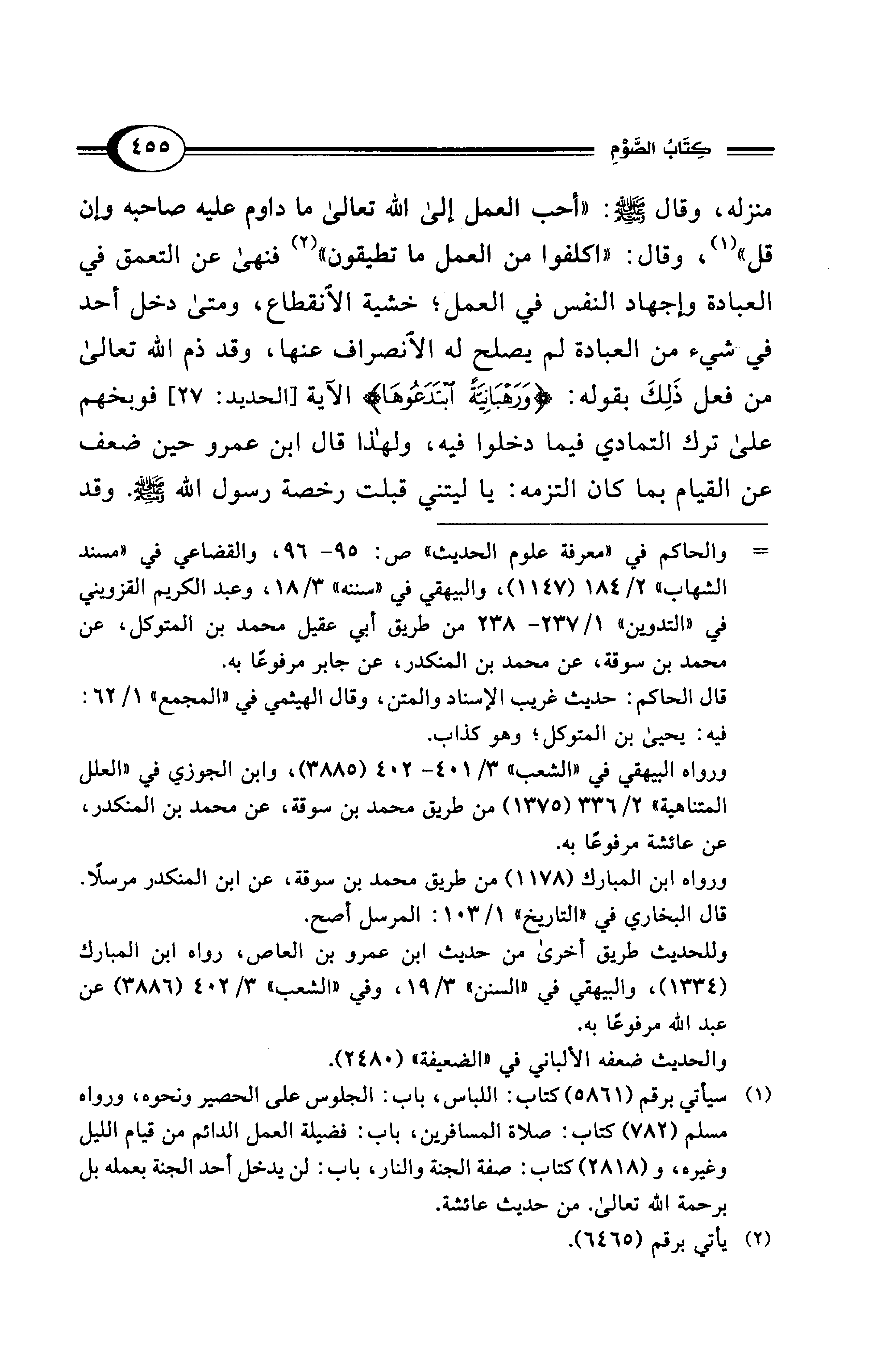 منزله، وقال - صلى الله عليه وسلم -: "أحب العمل إلى الله تعالى ما داوم عليه صاحبه وإن قل" (¬1)، وقال: "اكلفوا من العمل ما تطيقون" (¬2) فنهى عن التعمق في العبادة وإجهاد النفس في العمل؛ خشية الانقطاع، ومتى دخل أحد في شيء من العبادة لم يصلح له الانصراف عنها، وقد ذم الله تعالى