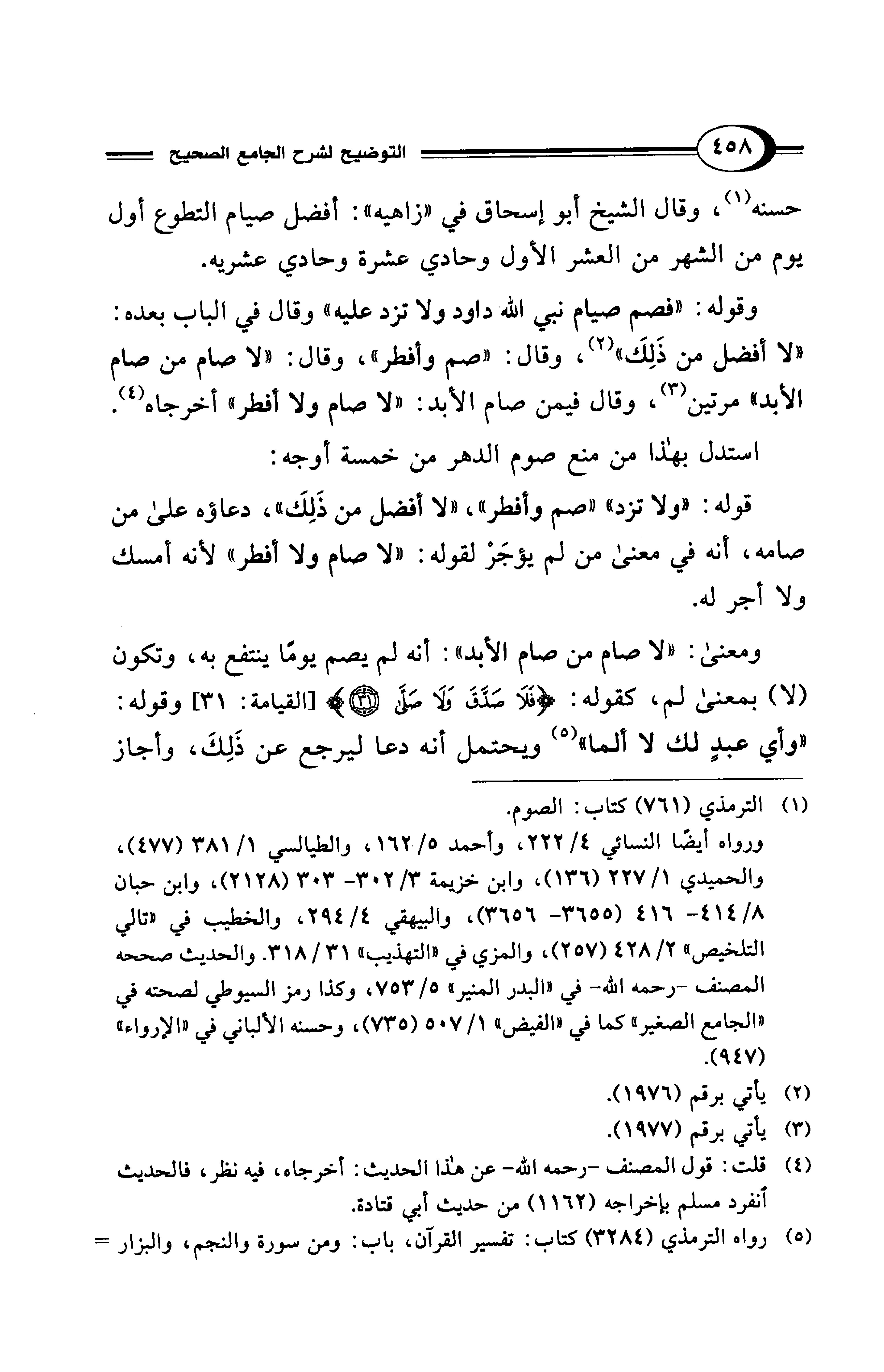 وقوله: "فصم صيام نبي الله داود ولا تزد عليه" وقال في الباب بعده: "لا أفضل من ذَلِكَ" (¬2)، وقال: "صم وأفطر"، وقال: "لا صام من صام الأبد" مرتين (¬3)، وقال فيمن صام الأبد: "لا صام ولا أفطر" أخرجاه (¬4).